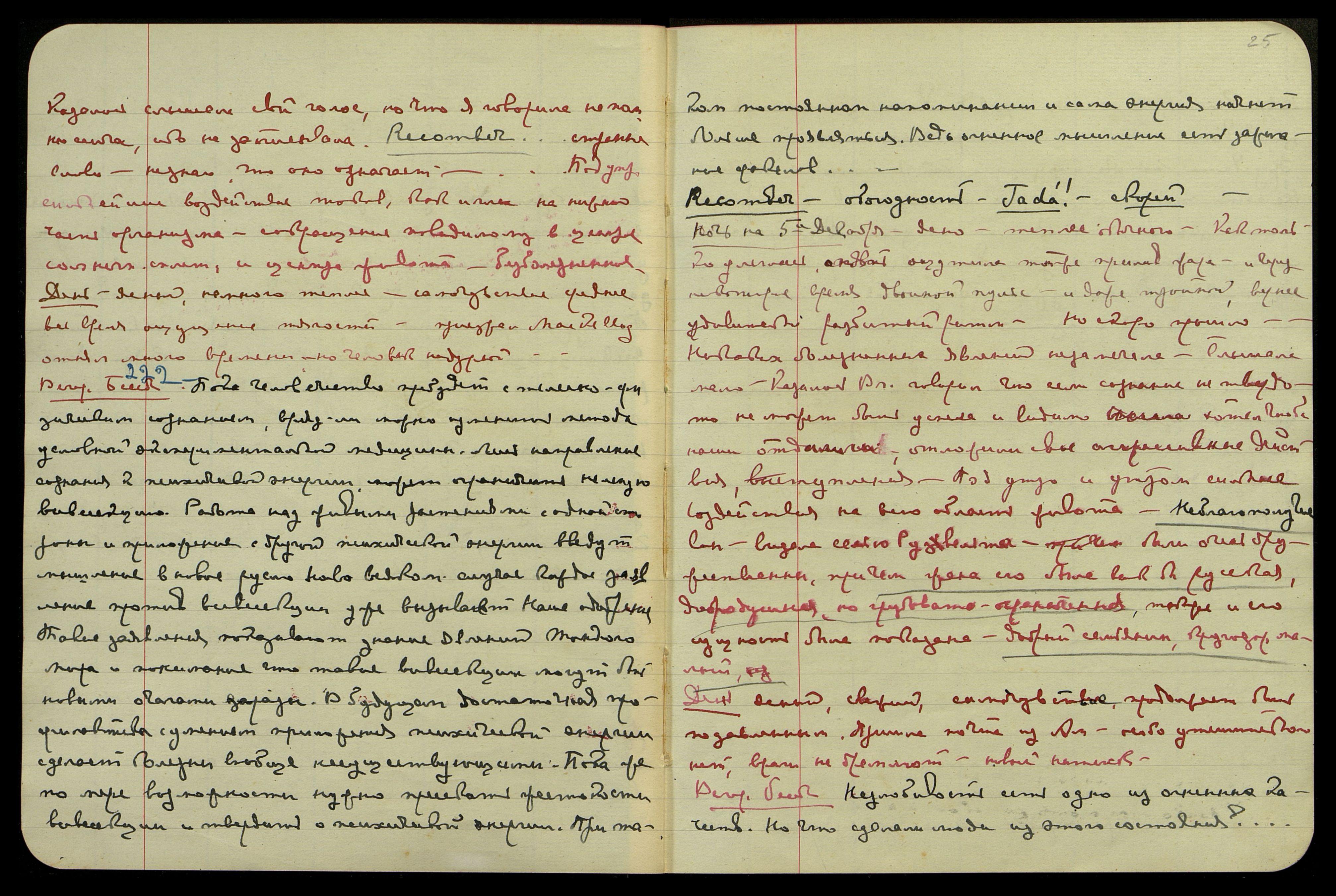 Казалось, слышала свой голос, но что я говорила не помню сейчас, ибо не записывала. "Recomber..." Странное слово − не знаю, что оно означает... Под утро сильнейшее воздействие токов, как иглы на нижнюю часть организма, сокращение, по-видимому, в центре солнечн[ого] сплет[ения] и центра живота, безболезненное.