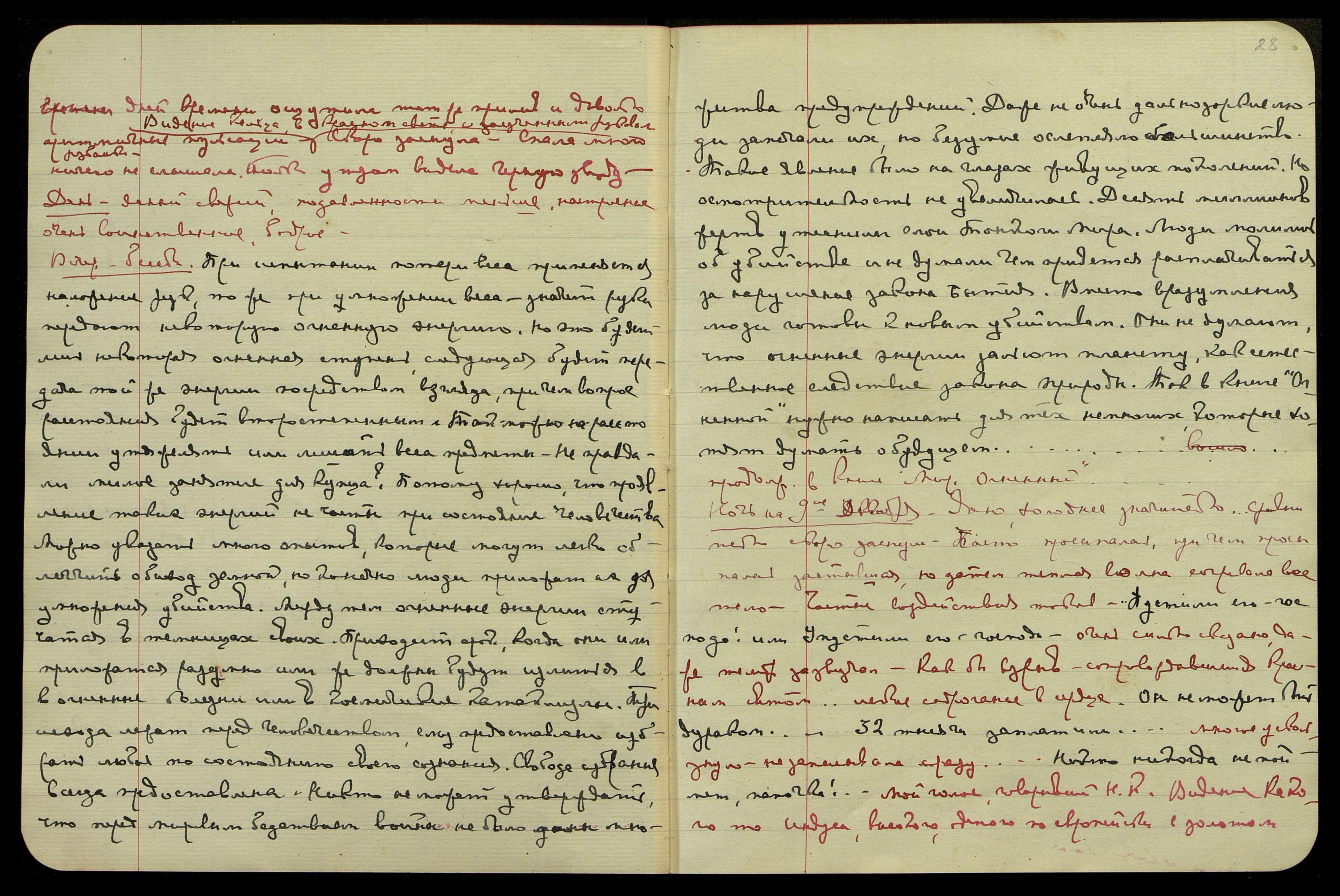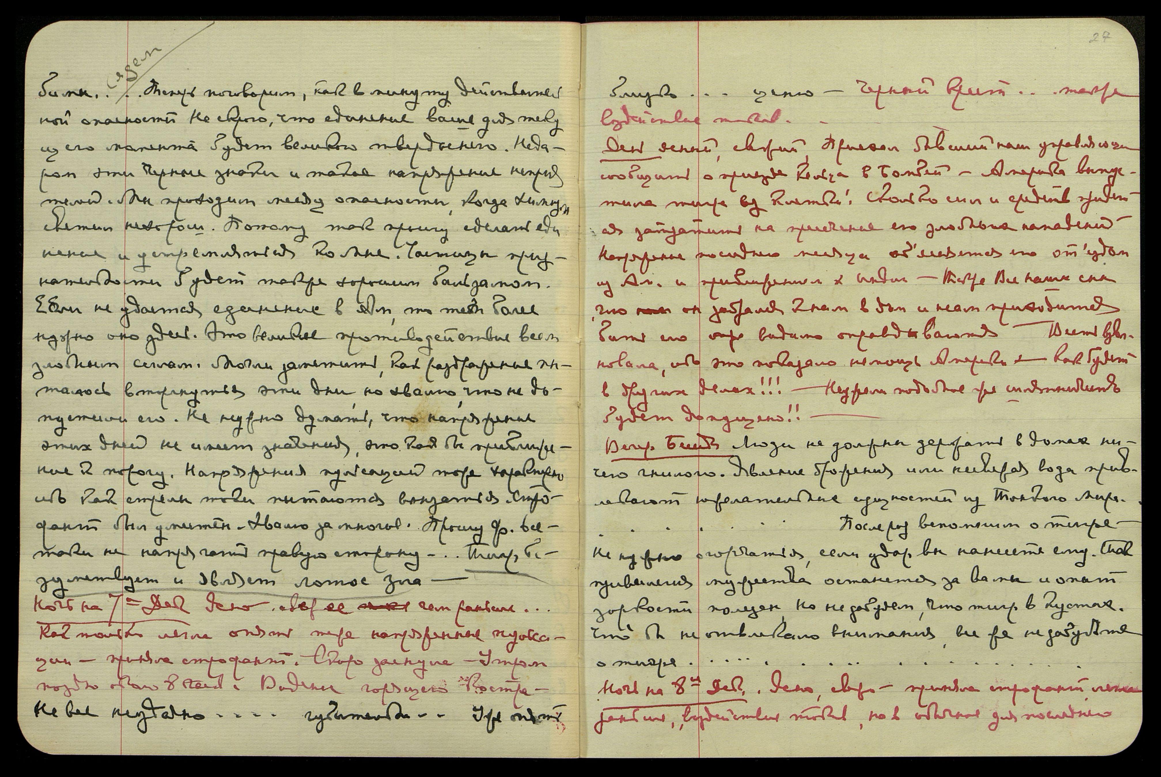 Ночь на 27-е ноября. Ясно, свежо. Спала много. Сон под утро. I. Показываю Св[етику] очертания будущих городов в Сибири на фоне бледно-розово-пурпурового неба. II. Н.К. и я стоим на горной скалистой дорожке, под нами впереди стоит враг и сбрасывает сверху большие камни на тропу, по которой мы идем. Мы остановились и смотрим, когда он прекратит свое занятие, но знаем, что есть другая скрытая тропа по которой мы пойдем, где камни его не смогут достичь нас. III. Находимся среди незнакомых русских людей, один из них говорит, как он чует магнетический ток, исходящий из моих глаз, которому трудно противиться. Утром казалось слышала о какой-то крупной ошибке... но не уверена в этом.