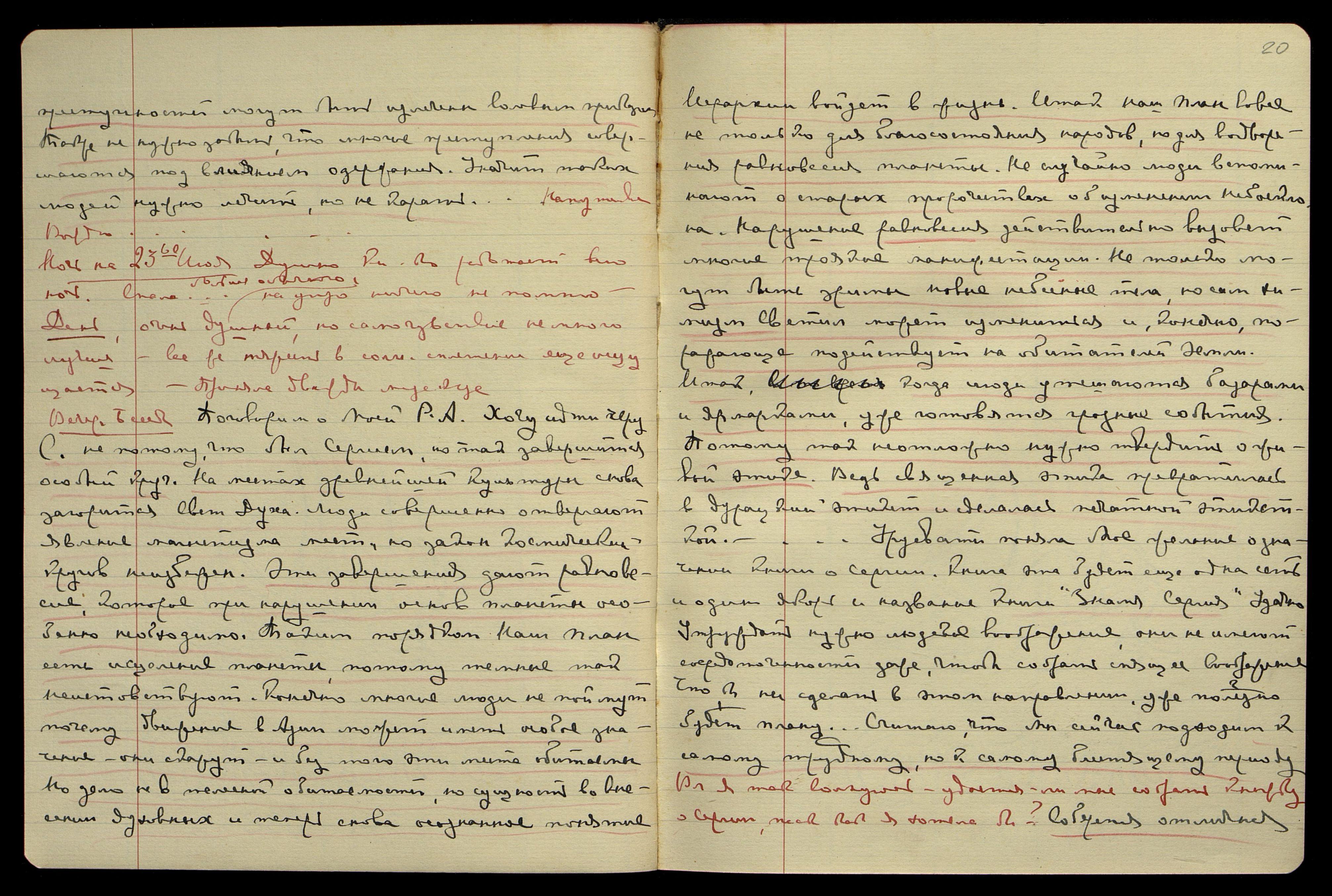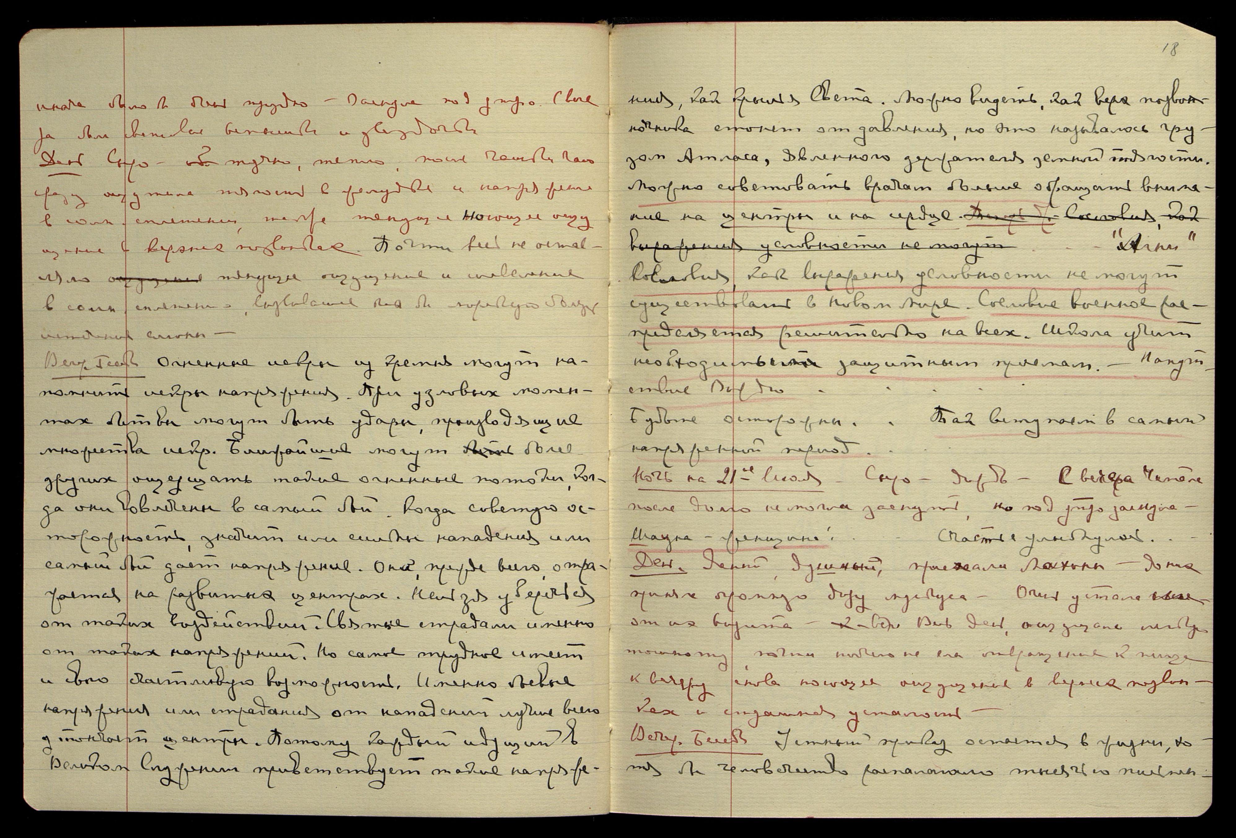 Ночь на 19-е июля. Тепло, но не чрезмерно. Напряжение в солн[ечном] сплет[ении] велико. Около 12 часов, а может быть раньше, вновь шевеление в солн[ечном] сплетении, истечение обильное слюны. Ничего не слышу. Посреди ночи заснула и спала много. Утром едва встала от усталости. Всё ещё есть ощущение напряжения в солн[ечном] сплетении. Очень мучительные ощущения в затылке, в верхнем позвонке.