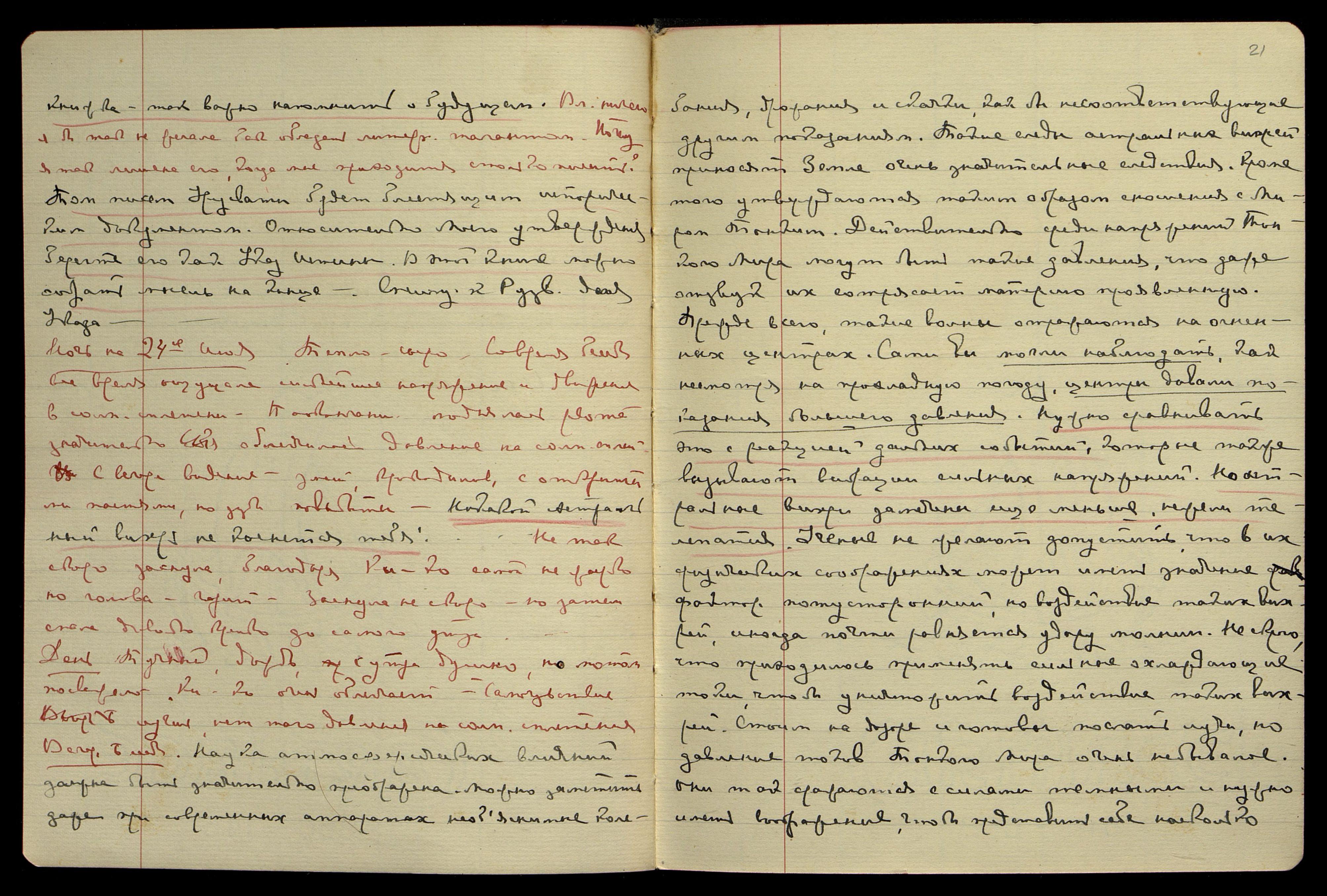 День облачный, тепло, не жарко, но с утра тяжесть и шевеление в солн[ечном]сплетении. В 12 часу снова рвота слюною, и почти весь день ощущение тошноты, чувствую себя как бы на пароходе во время морской болезни. Также движение и тянущее ощущение в верхнем [одно слово неразборчиво] позвоночника. Несколько раз позывы к рвоте, истечение слюны обильно. Несколько раз принимала соду, но облегчения не много. Около шести часов вечера приняла мускус, стало легче, но центр затылка даёт себя чувствовать. Приливы крови к голове сильны.