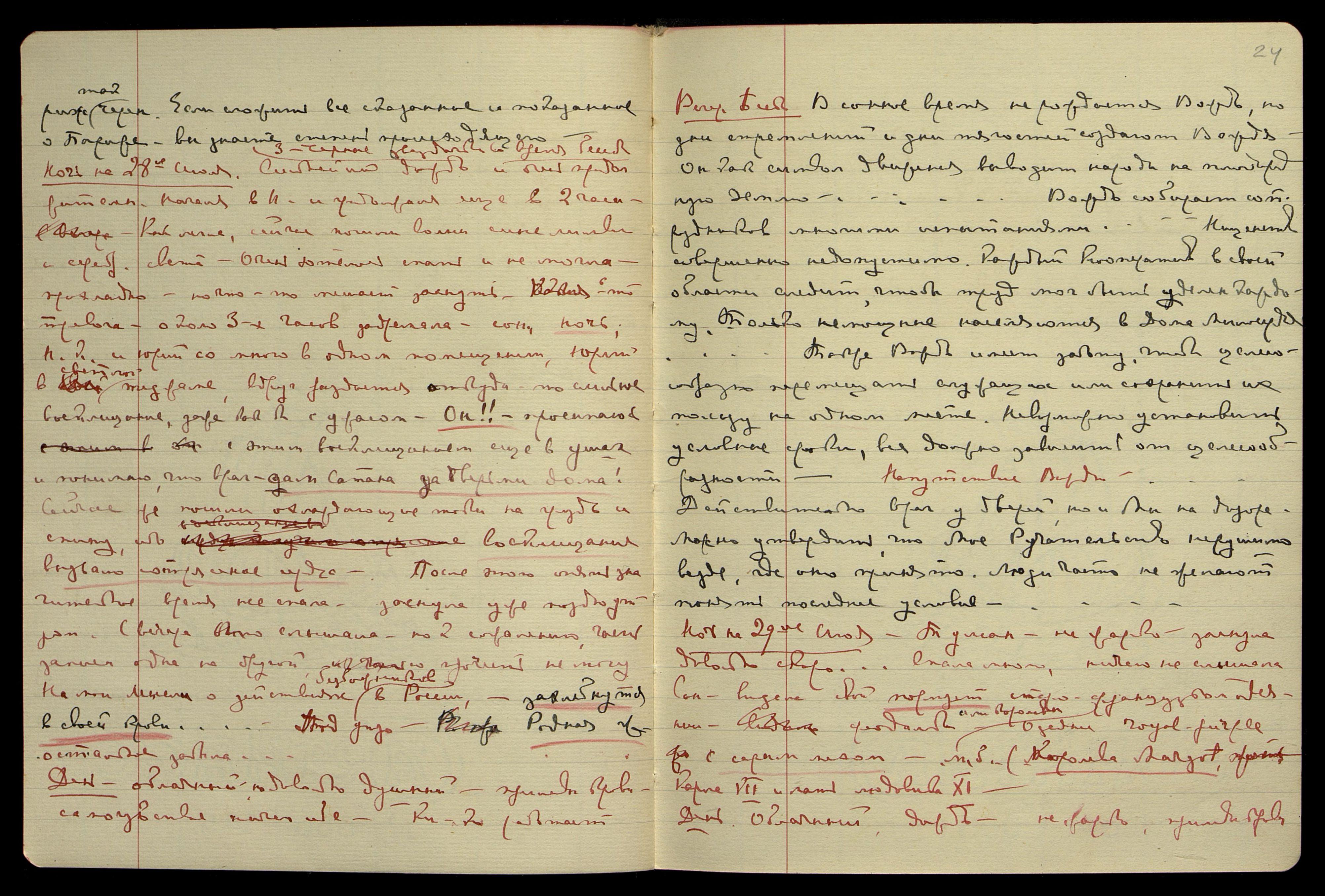 Ночь на 26-е июля. Тучно, тепло, очень горят конечности, тянущее ощущение в них. Световые синиe и серебр[яные] образования. "Люблю тебя..." Думы о несчастных русских ссыльных, о кот[орых] прочли в присланной нам газете. Какая кара должна постичь этих мучителей! "Не натравленные собаки лучше, ибо они следуют своему инстинкту". Поняла, что и карать не придётся, сам народ расправится. "Несметное богатство!" Думы о Рузвельте, о том, как несчастен должен быть он, имея против себя всех рэкетиров-банкиров − Хувером, обезьян и т.д. "В копировальной машине!..." Ночь тяжёлая. Тучи низкие. Заснула под утро.