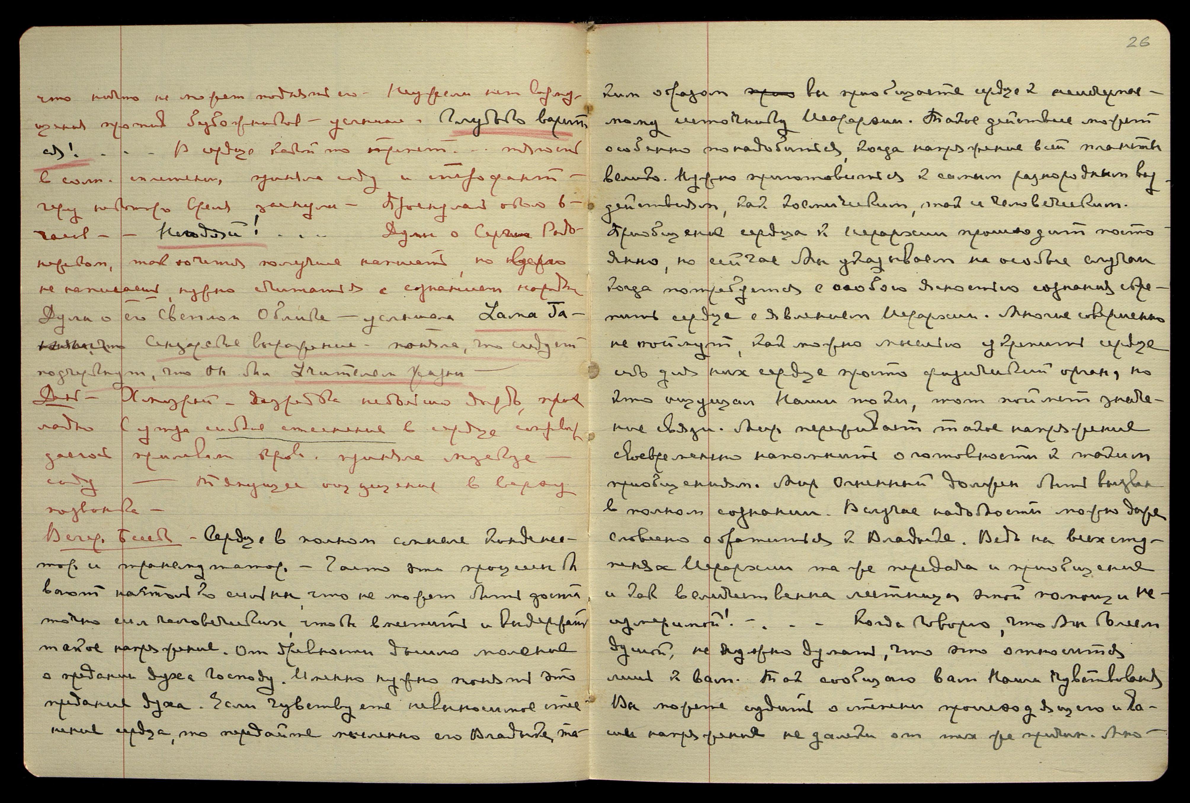 Ночь 28-е июля. Сильный дождь и очень продолжителен. Начался в 11 и продолжался ещё в 2 часа. Как легла, сейчас пошли волны сине-лиловые и серебряного света. Очень хотелось спать и не могла. Прохладно, но что-то мешало заснуть. Какая-то тревога. Около 3-х часов задремала. Сон − ночь, Н.К. и Юрий со мною в одном помещении, Юрий в светлой пижаме, вдруг раздаётся откуда-то сильное восклицание, даже как бы с ужасом: "Он!" Просыпаюсь с этим восклицанием в ушах и понимаю, что враг − сам Сатана − за дверьми дома! Сейчас же пошли охлаждающие токи на грудь и спину, ибо восклицание вызвало сотрясение сердца. После этого опять значительное время не спала, заснула уже поздно утром. С вечера много слышала, но к сожалению часть записи одна на другой, прочесть не могу. На мои мысли о действиях безбожников в России: