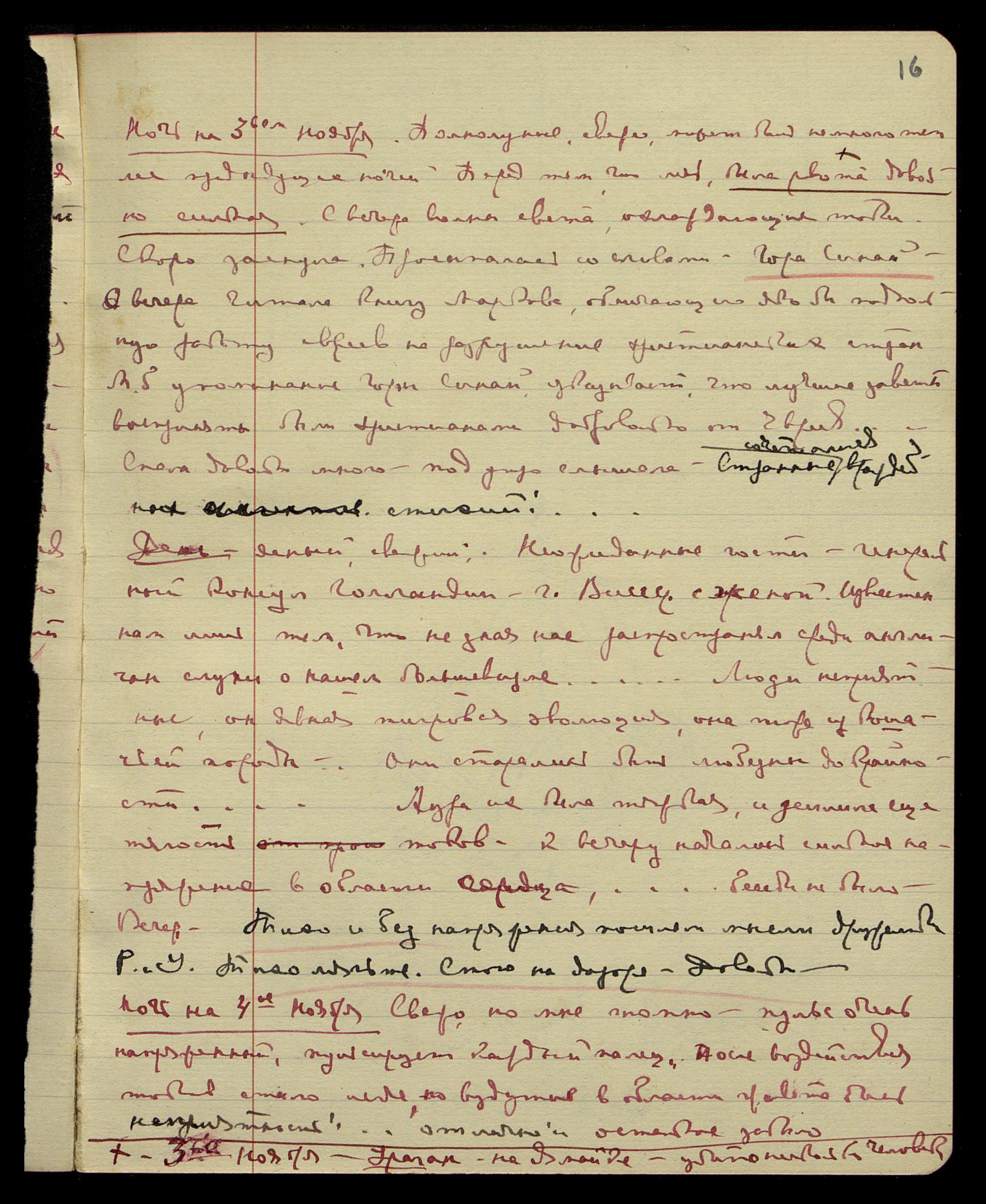 Ночь на 4-е ноября. Свежо, но мне томно, пульс очень напряженный, пульсирует каждый палец. После воздействия токов стало легче, но вздутие в области живота было [сильно]. "Неприятность!… Отлично…" Остальное забыла