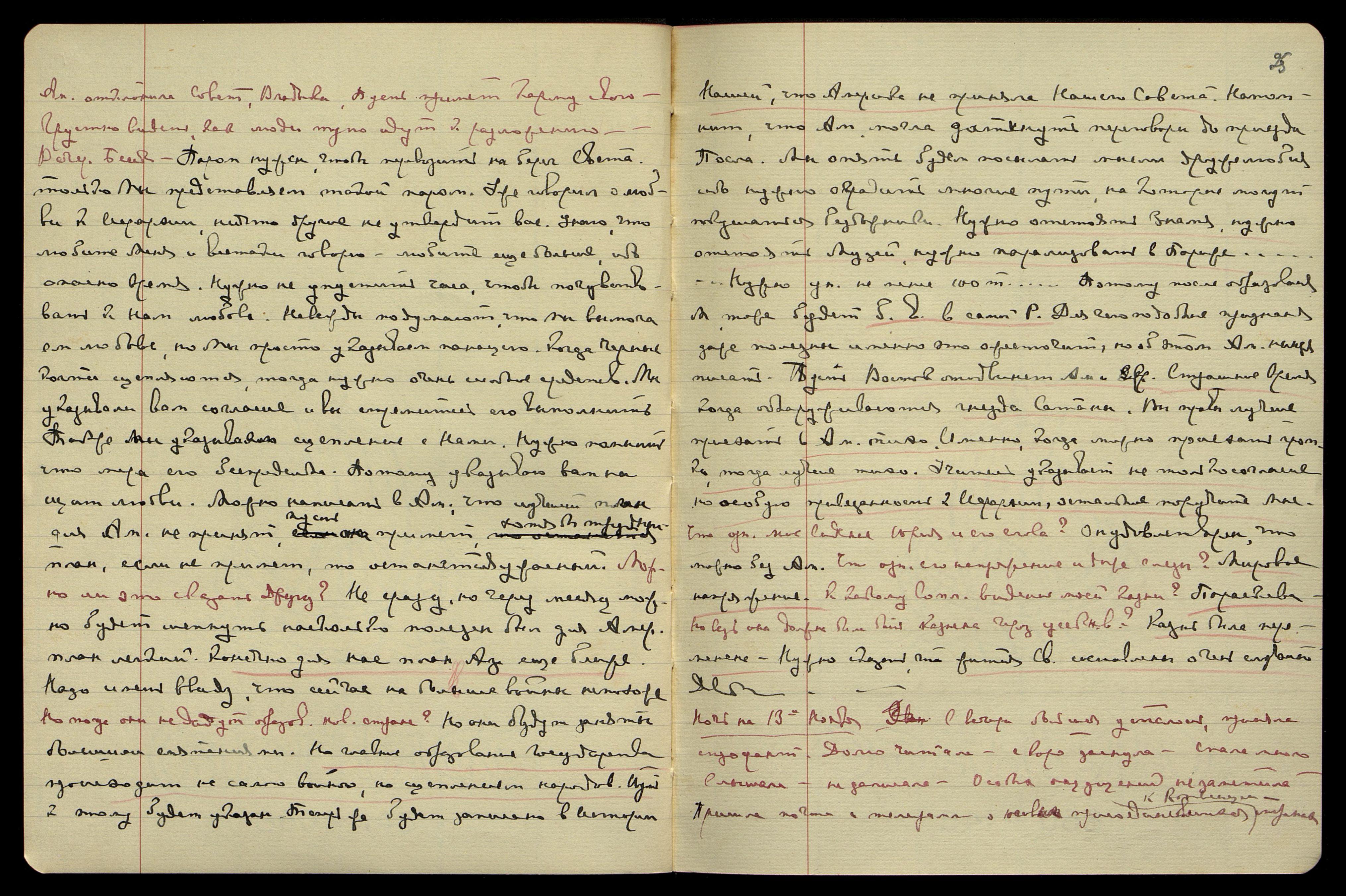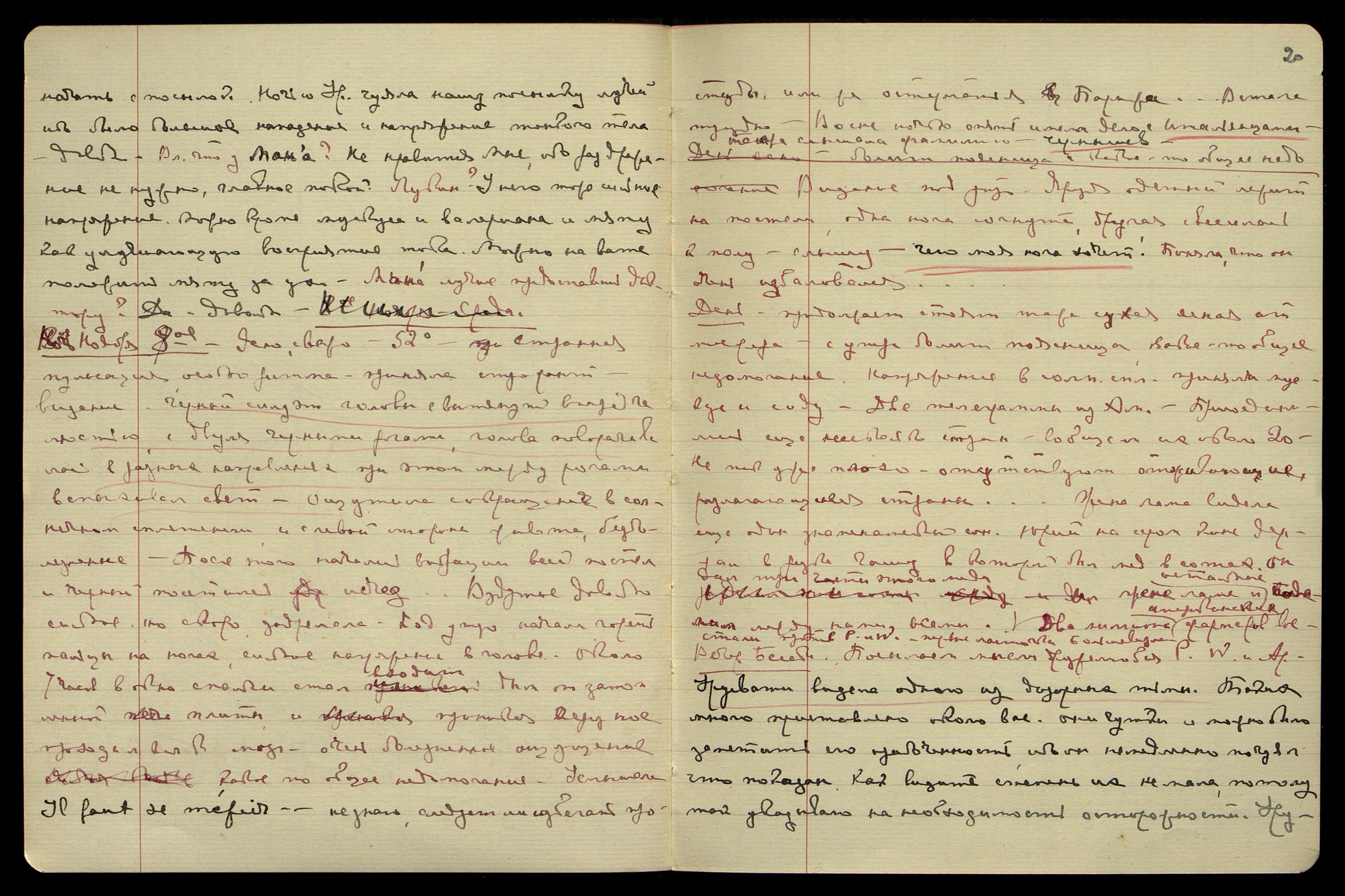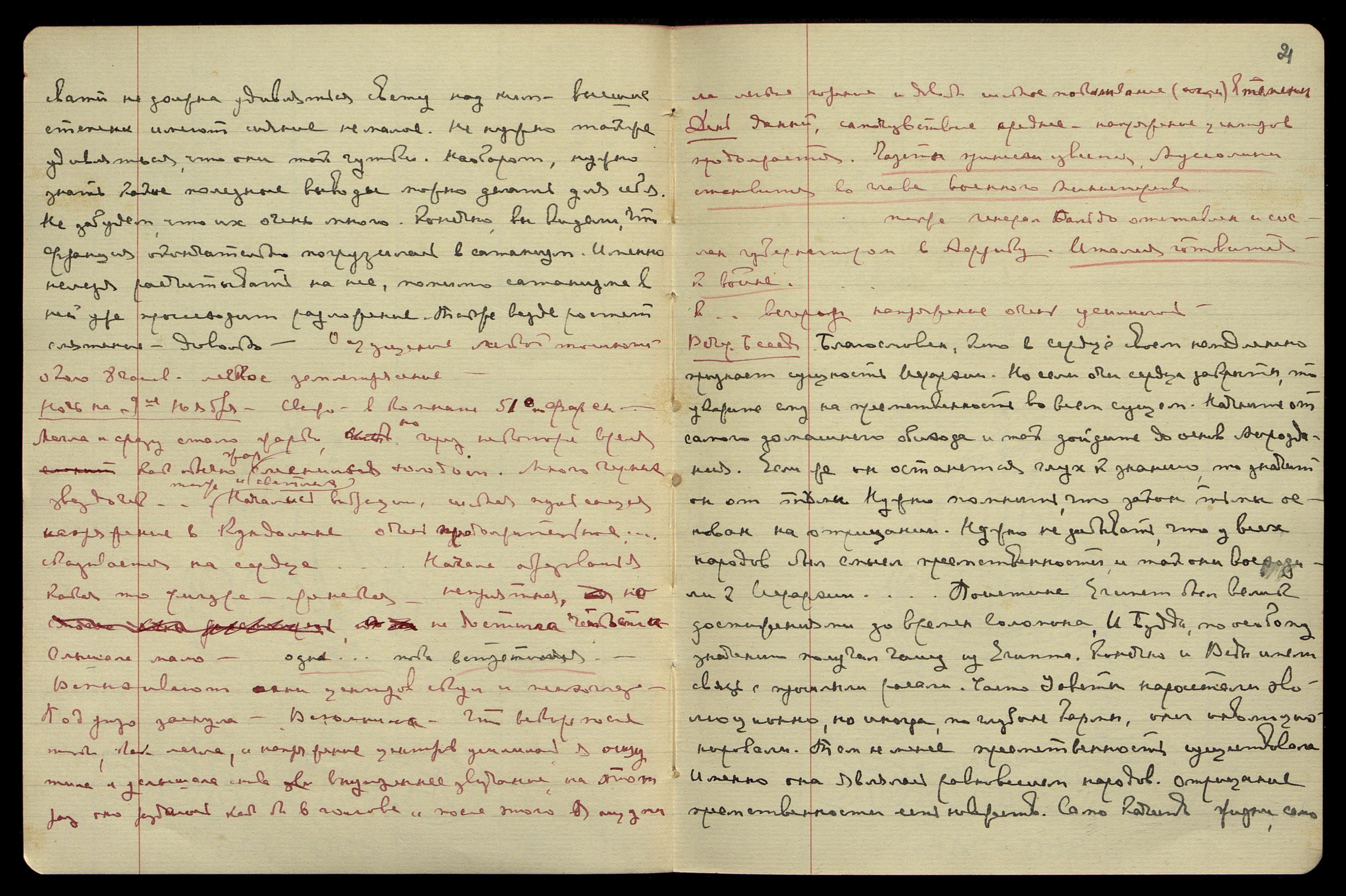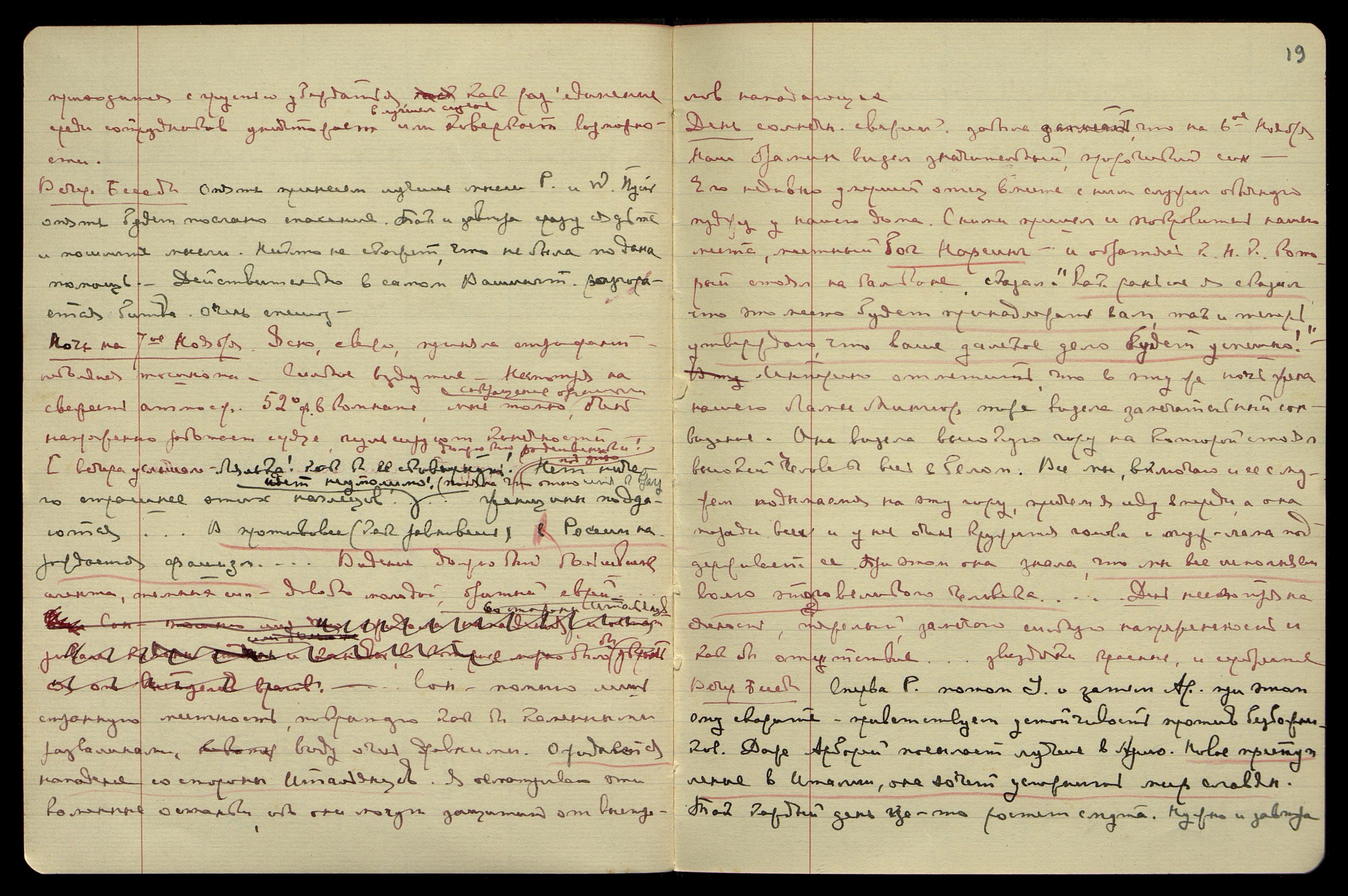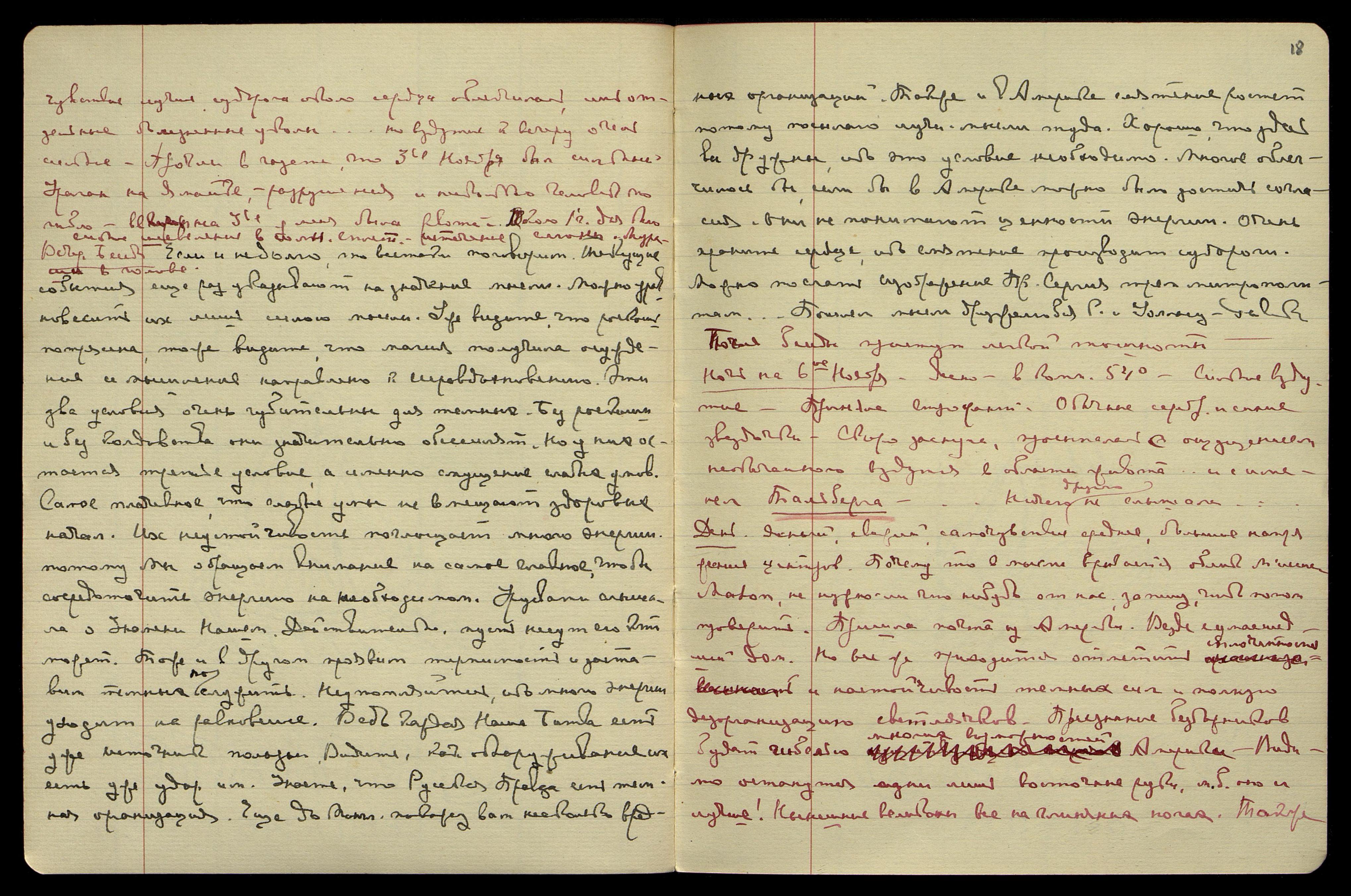 Ночь на 7-е ноября. Ясно, свежо, приняла строфант, небольшая тошнота. Сильное вздутие, несмотря на свежесть атмосф[еры] (52°F [= 11°C] в комнате) мне томно, сокращение [одно слово неразборчиво], боль, напряженно работает сердце, пульсируют конечности. С вечера услышала: "Лялька! Как бы её сковырнуть!" − должно быть родственники! Под утро: "Нет ничего страшнее этих наглецов… идет неутомимо!" − поняла, что относится к врагу. "Женщины поддаются… В противовес (как равновесие) в России нарождается фашизм…" Видение, должно быть, большевика, агента темных сил, довольно молодой, бритый еврей… Сон, помню лишь странную местность, покрытую как бы каменными развалинами, с виду очень древними. Ожидается нападение со стороны итальянцев. Я осматриваю эти каменные остатки, ибо они могут защитить от выстрелов нападающих.