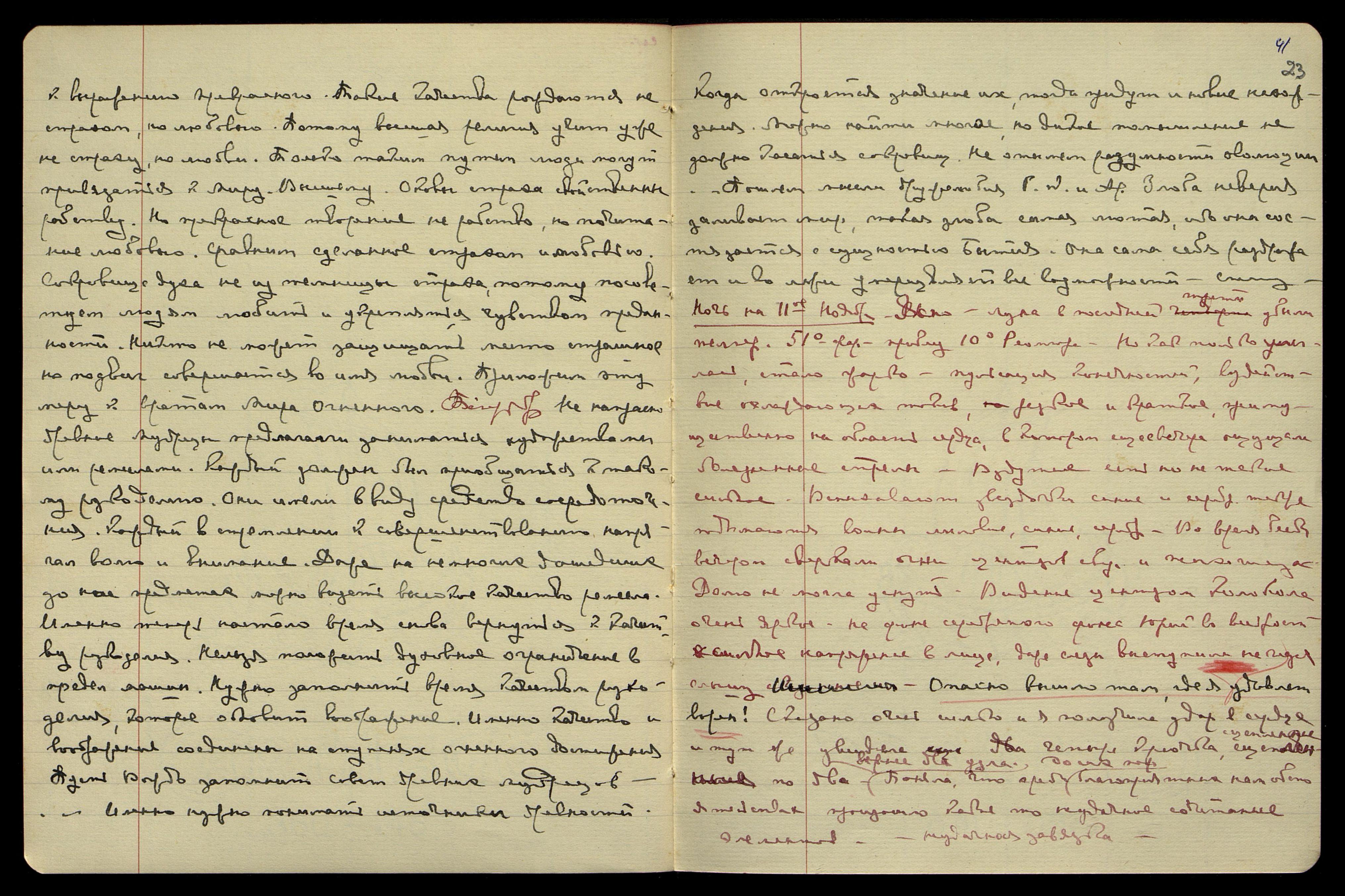 Ночь на 10-е ноября. Ясно, 10°Re [= 12,5°C] в комнате. Сильнейшее напряжение центров, вздутие живота. Приняла строфант. Воздействие токов, довольно скоро заснула. Сон − видела свою казнь через распятие, причем я очень прошу, чтобы распятие это произошло в стенах тюрьмы, но не на лобном месте, ибо тяжко быть оголенной перед толпою. Но близкие мне люди в надежде спасти меня хотят, чтобы казнь произошла публично, ибо надеются, что моя юность может тронуть, и меня освободят… Вижу серебристый дневной свет, большой двор, должно быть внутренний, выложенный каменными плитами, огромный крест − орудие казни полулежит на земле, я совсем-совсем молоденькая, почти ребенок, волосы черные, завернутые огромным узлом на темени, привязана голая к кресту… Дальше не помню… Несмотря на вздутие, спала много. Под утро: "70 лет тому назад войска выступали, − м[ожет] б[ыть] отн[осится] к Средне-Азиатскому походу? − пока последний пархатый еврей…" − должно быть мысли несчастных удушенных безбожниками.