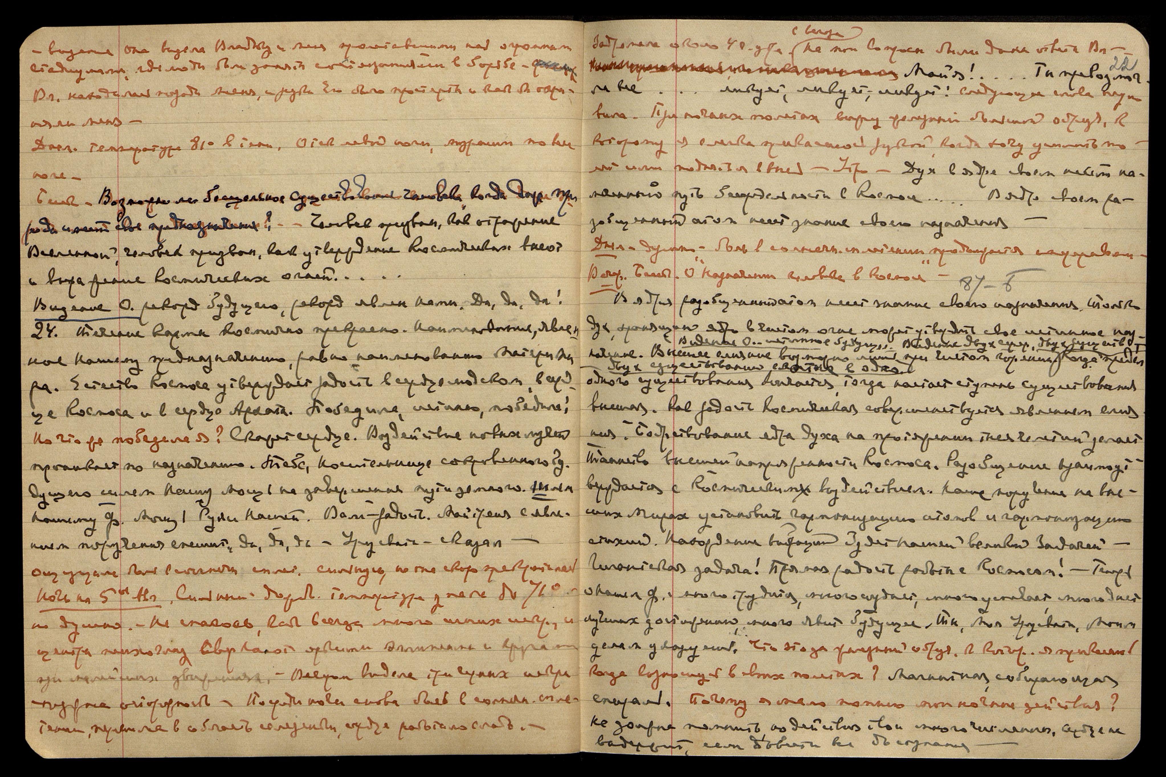 "Ради Бога, осторожно... для Osmosа osmosis [англ.: осмос]... Нашли мы счастье". Остальное не записала. "С кем ты поссорился! Элементалы!.. Я буду плакать!.. Смерть та встаёт кошмаром.... Мои будут далеко... Немного, не нужно огорчаться... Жизнь есть радость Красоте... Когда мысль отклонилась от священного назначения Бытия, то самый смысл Бытия иссяк!... Явление высшей согласованности есть священное действо духа! Священная связь есть основа всего Бытия".