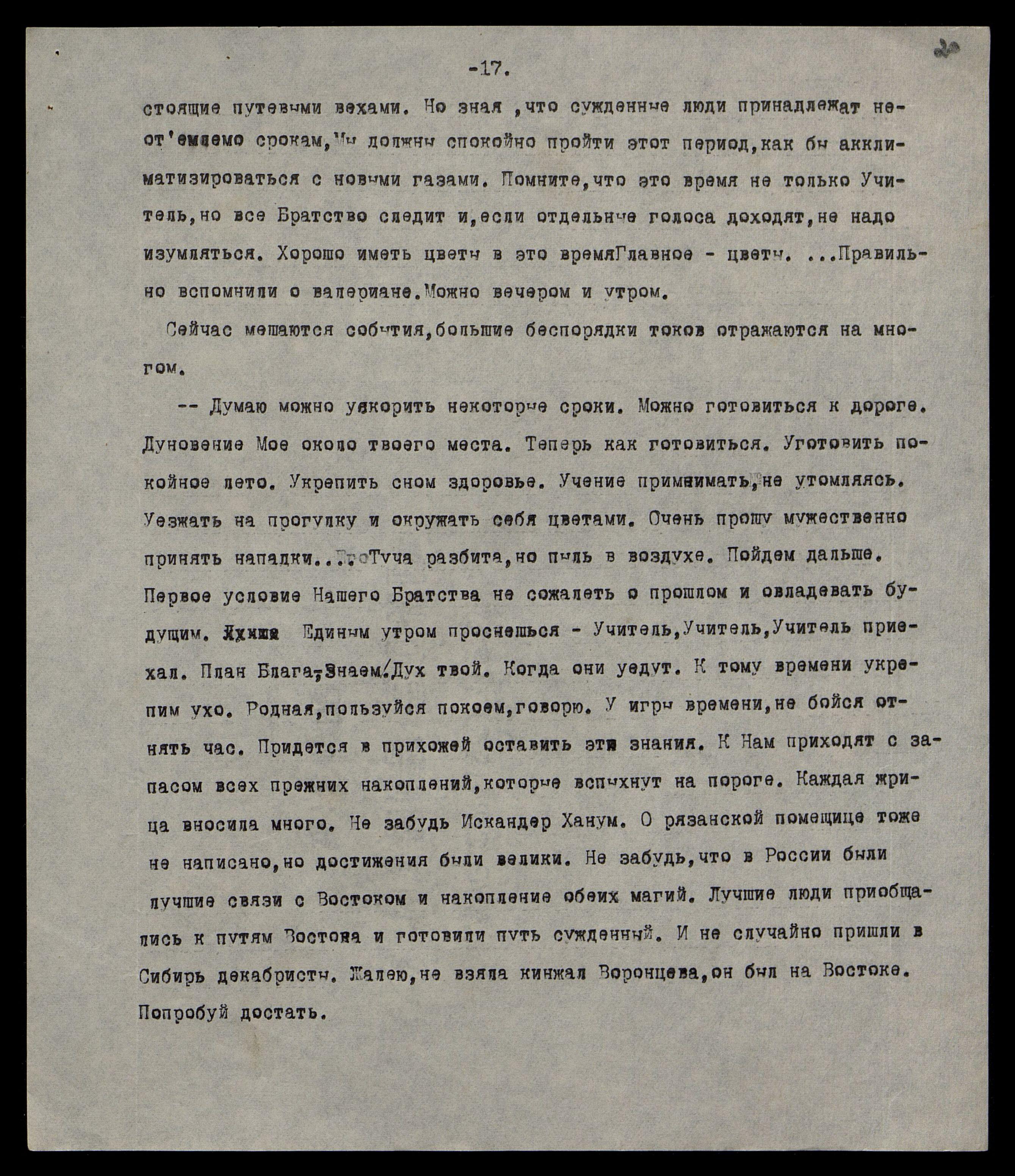 стоящие путевыми вехами. Но зная, что сужденные люди принадлежат неотъемлемо срокам, Мы должны спокойно пройти этот период, как бы акклиматизироваться с новыми газами. Помните, что это время не только Учитель, но всё Братство следит, и, если отдельные голоса доходят, не надо изумляться. Хорошо иметь цветы в это время. Главное — цветы.