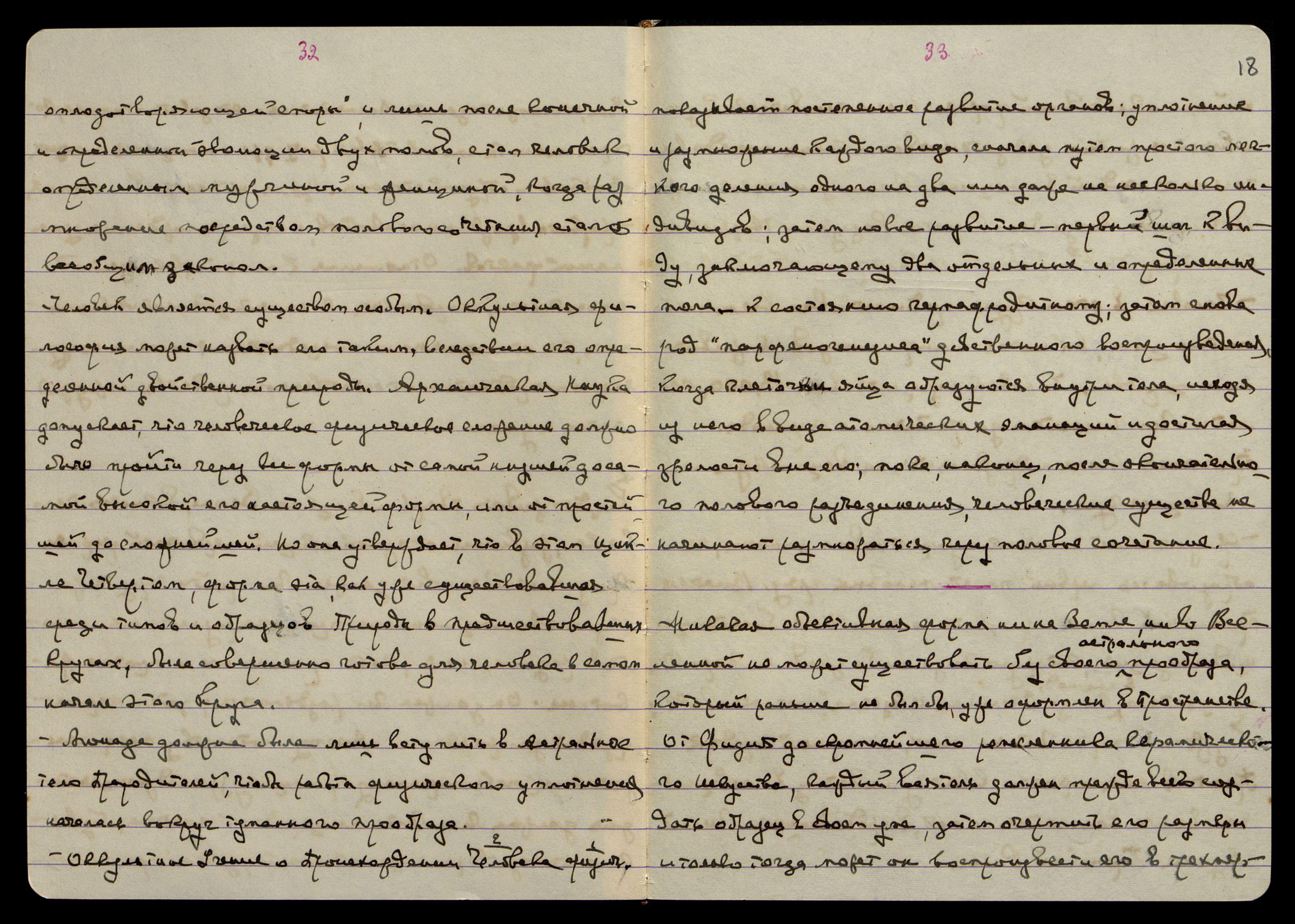 Оккультное Учение о Происхождении физич[еского] Человека показывает постепенное развитие органов: уплотнение и размножение каждого вида сначала путём простого, лёгкого деления одного на два или даже на несколько индивидов; затем новое развитие - первый шаг к виду, заключающему два отдельных и определённых пола, к состоянию гермафродитному; затем снова род "парфеногенезиса" девственного воспроизведения, когда клеточки яйца образуются внутри тела, исходя из него в виде анатомических эманаций и достигая зрелости вне его; пока, наконец, после окончательного полового разъединения человеческие существа не начинают размножаться через половое сочетание.