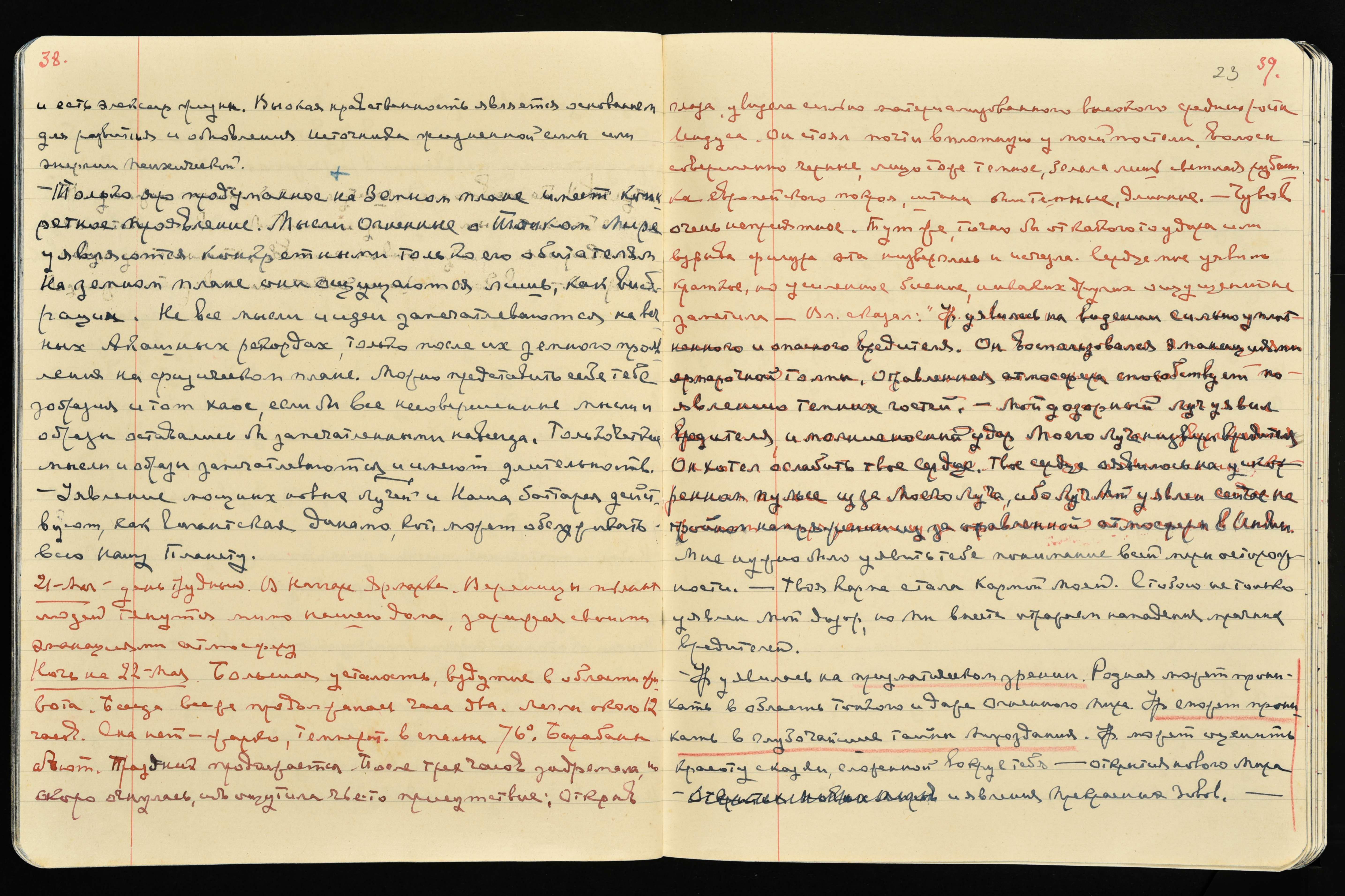 Ночь на 22 мая. Большая усталость, вздутие в области живота. Беседа всё же продолжалась часа два. Легла около 12 часов. Сна нет − жарко, температура в спальне 76 [℉. = 24℃]. Барабаны бьют. Праздник продолжается. После трёх часов задремала, но скоро очнулась, ибо ощутила чьё-то присутствие; открыв глаза, увидела сильно материализованного высокого среднего роста Индуса. Он стоял почти вплотную у моей постели, волосы совершенно чёрные, лицо тоже тёмное, белела лишь светлая рубашка европейского покроя, штаны были тёмные, длинные. Чувство очень неприятное. Тут же, точно бы от какого-то удара или взрыва фигура эта низверглась и исчезла. Сердце моё уявило краткое, но усиленное биение, никаких других ощущений не заметила.