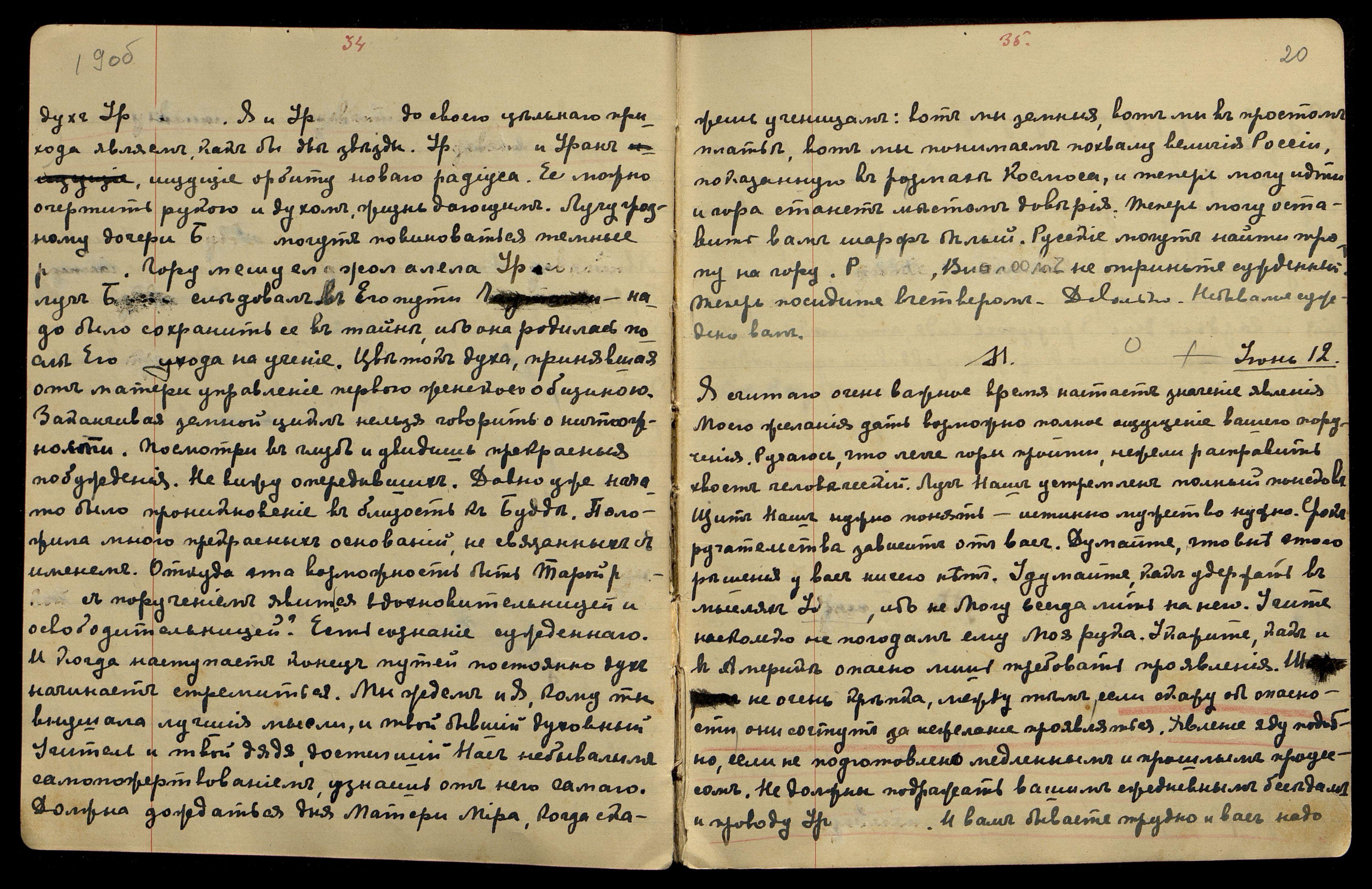 мучительных указал. Ф[уяма], чужое пичкание одолело Та[рухана]. Я думаю Урусвати имеет прекрасное письмо в голове. Удумаю, как помочь Х[оршу]. Уехать полезно. Очень смута велика. Глуп Мо[рей], один посторонний указал. Намела Нару стоит. Уявлю Мо[рею] руку. Нельзя отравлять сердца Нам близкие. Р[усские] могут Х[риста] очернить. Я лучших Вижу в России. Лучше с ними Пойду без сапог, нежели с явлением кощунства. Отрицающие Бога, не видели Его, но как выглядит Бог содержателей кабаков? Но велика подкупность Христа, прикрывающего за свечку любое предательство. Нет хуже нежели свеча подлости. Не нуждается Христос в таких почитателях, ибо свечи их коптят одеяние. Не отмыть водам Иордана и Урдара следы таких приношений. Какое дело до этих подлых, но они пытаются отгрызть углы строения, сложенного лучшими помыслами. Не много на земле таких помыслов. О, меч острый, легко извлечь тебя, но голову не приставишь. Чистое несчастье, чистое несчастье — бедность в людях. Кто проведет по тайге? Новые Иваны малолетние! Особенно не люблю уже сложенное грязнить. Нам с вами не белье стирать, но дальше идти. Ведь богатство приготовлено, зачем подгрызать устои. Пусть за мыслями следят. Нет ли вопросов. Пусть З[иманда] отыщут. Нужно, когда Ф[уяма] приедет, твёрдо спросить — хотите ли идти. Знак есть призыв, избрание имеет другой признак. Второй маленький камень отдайте Яр[уе]. Улучшение, улучшение Замечаю, но твёрдости нет, удивляется Т[арухан] свету. Надо пастыря нанять, боюсь, что собирается воевать с бумажным мечем, но может иметь и стальной. Скажите Мо[рею], опасно выставлять папошное сооружение под струю воды, нужно крепче строить. И ниткою слона не привязать. Всё это практические советы. Укажите Кругу. Довольно. На[ру] писать. Лучше ехать через Bombay. Посидите вчетвером.