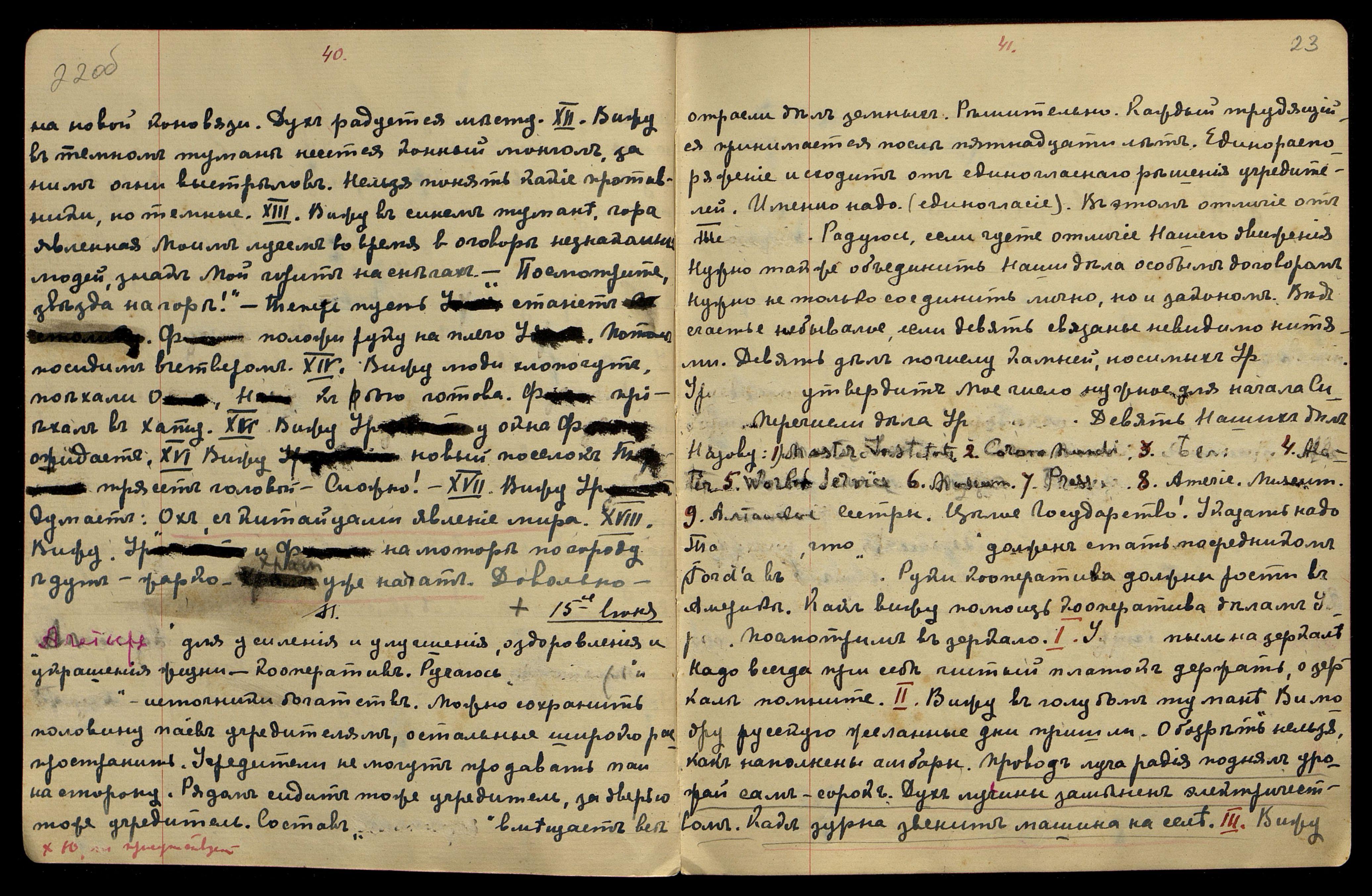 ("Алатырь") Для усиления и улучшения, оздоровления и украшения жизни — кооператив. Ручаюсь, [Алатырь] и [Белуха] — источники богатств. Можно сохранить половину паёв учредителям, остальные широко распространить. Учредители не могут продавать паи на сторону. Рядом сидит тоже учредитель, за дверью тоже учредитель. Состав [Алатыря] вмещает все отрасли дел земных. Решительно. Каждый трудящийся принимается после пятнадцати лет. Едино распоряжение исходит от единогласного решения учредителей. Именно надо (единогласие). В этом отличие от Те[ософов]. Радуюсь, если чуете отличие Нашего движения. Нужно также объединить Наши дела особым договором. Нужно не только соединить лично, но и законом. Ведь счастье небывалое, если девять связаны невидимо нитями. Девять дел по числу камней, носимых Урусвати. Урусвати, утверди Моё число нужное для начала Си[бири]. Перечисли дела Урусвати. Девять Наших дел назову: 1) Master Institute. 2) Corona Mundi. 3) Бел[уха]. 4) Alatir. 5) World Servise. 6) Museum. 7) Press. 8) Americ[an] Museum. 9) Алтайские сестры. Целое государство! Указать надо Та[рухану], что [слово стерто] должен стать посредником Ford'a в [слово стерто]. Руки кооператива должны расти в Америке. Как вижу помощь кооператива делам У[драи]. Посмотрим в зеркало.