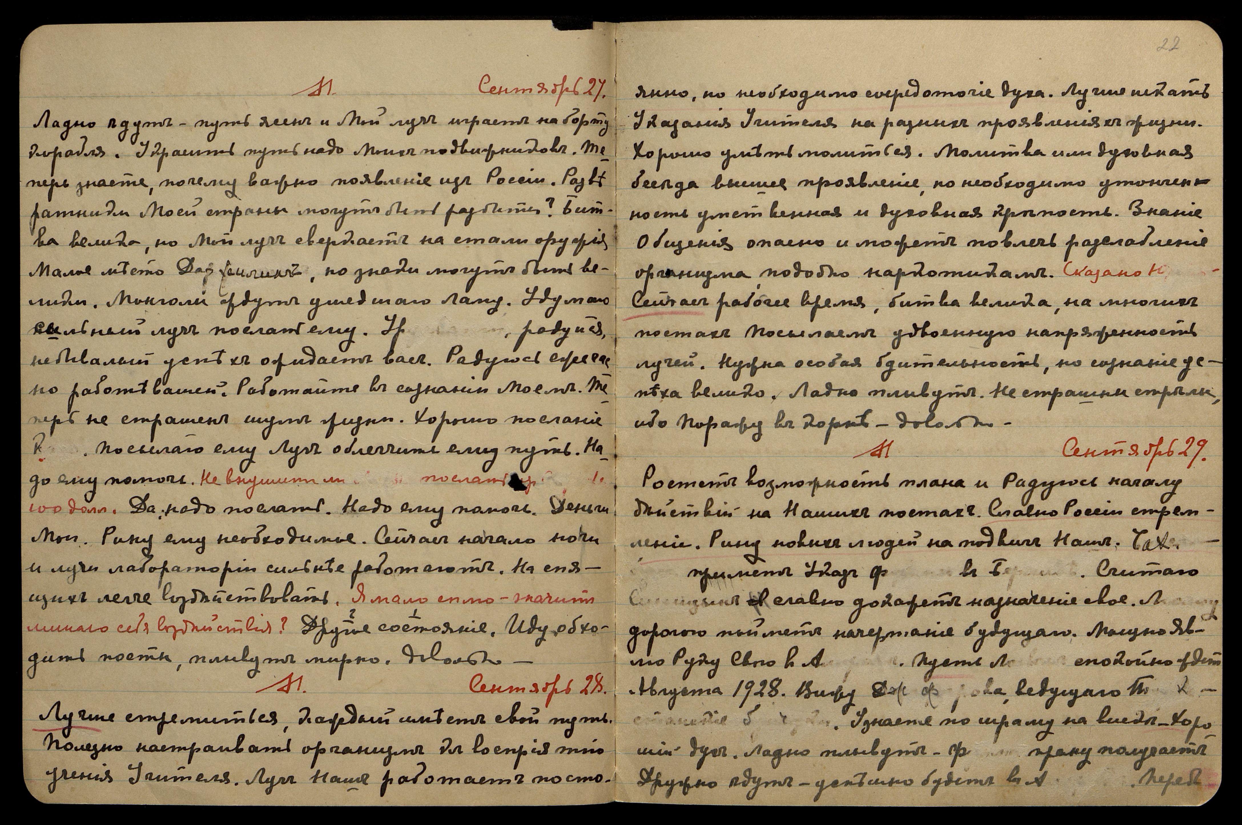 Растёт возможность плана, и радуюсь началу действий на Наших постах. Славно России стремление. Рину новых людей на подвиг Наш. Чах[ем Була] примет указ Ф[уямы] в Б[ерлине]. Считаю, Синицын славно докажет назначение свое. Л[юмоу] дорогою поймет начертание будущего. Мощно явлю руку свою в А[мерике]. Пусть Л[огван] спокойно ждет августа 1928 г. Вижу Джафарова, ведущего Туркестанские бунчуки. Узнаете по шраму на виске — хороший дух. Ладно плывут. Ф[уяма] прану получает. Дружно едут — успешно будет в А[мерике]. Перед