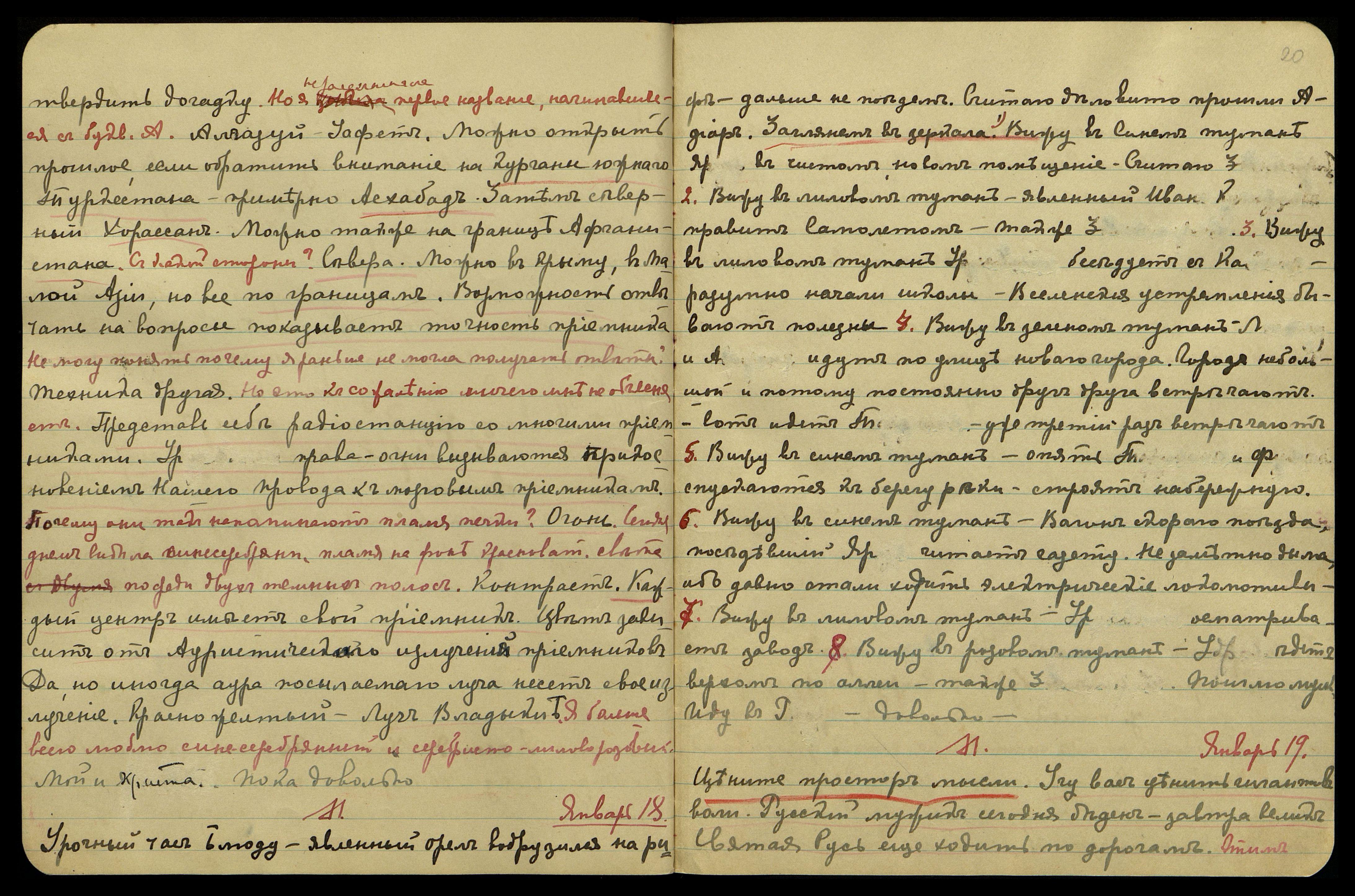Урочный час блюду — явленный орел водрузился на рифе — дальше не поедем. Считаю, деловито прошли Адиар. Заглянем в зеркала. 1) Вижу в Синем тумане Яр[ую] в чистом, новом помещении. Считаю З[венигород]. 2. Вижу в лиловом тумане — явленный Иван К. правит Самолетом. Также З[венигород]. 3. Вижу в лиловом тумане Урусвати беседует с Ка. — разумно начали школы — Вселенские устремления бывают полезны. 4. Вижу в зеленом тумане — Л[юмоу] и Ав[ирах] идут по улице нового города. Город небольшой и потому постоянно друг друга встречают, вот идет Т[арухан], уже третий раз встречают. 5. Вижу в синем тумане: опять Т[арухан] и Ф[уяма] спускаются к берегу реки, строят набережную. 6. Вижу в синем тумане: вагон скорого поезда, поседевший Яр[уя] читает газету. Не заметно дыма, ибо давно стали ходить электрические локомотивы. 7. Вижу в лиловом тумане: Урусвати осматривает завод. 8. Вижу в розовом тумане: Удр[ая] едет верхом по аллее — также З[венигород]. Пошлю муск[ус]. Иду в Р[игу].