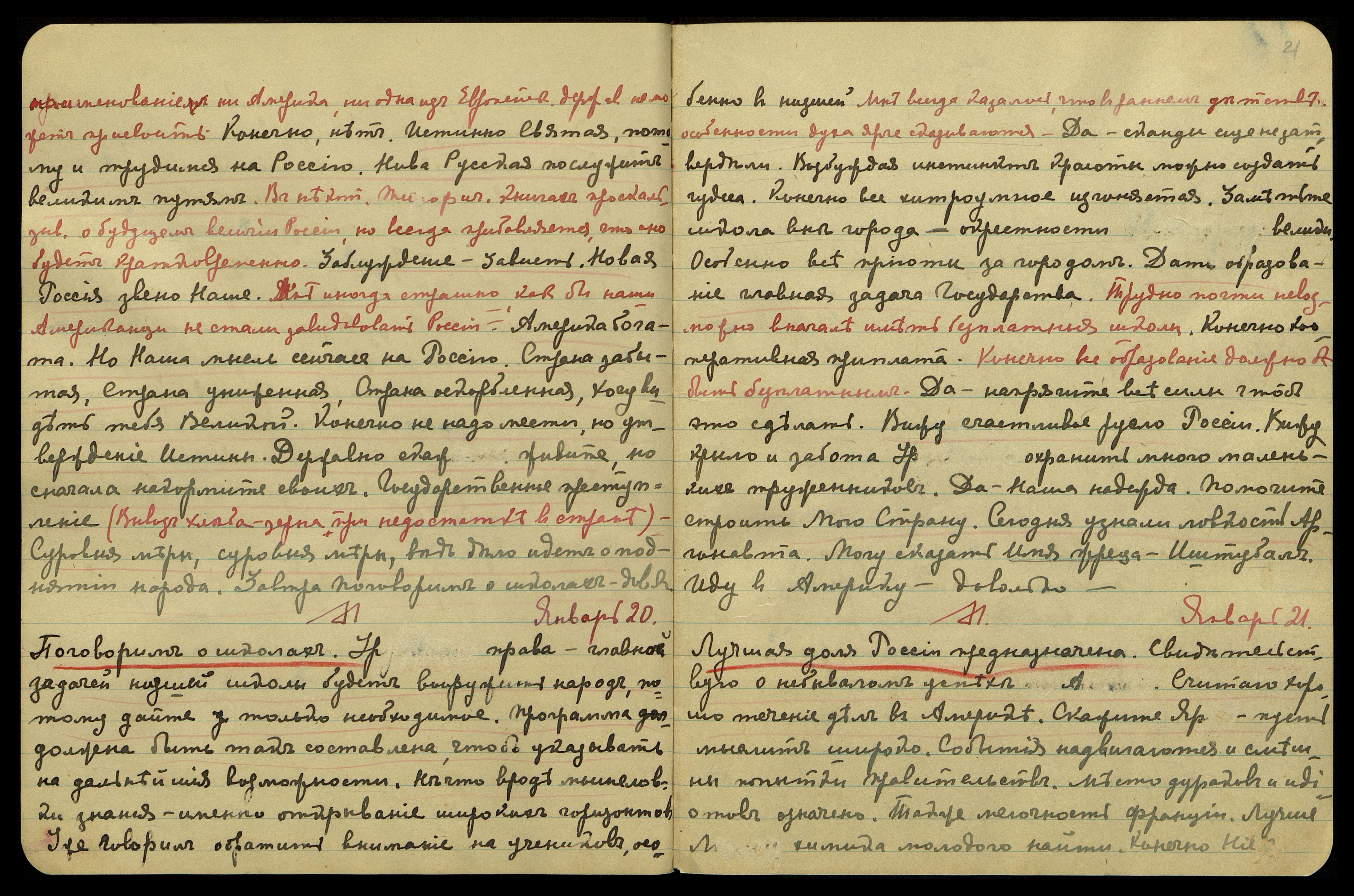 — Америка богата. Но Наша мысль сейчас на Россию. Страна забытая, Страна униженная, Страна оскорбленная, Хочу видеть тебя Великой. Конечно не надо мести, но утверждение Истины. Державно — скаж[ите] — живите, но сначала накормите своих. Государственное преступление (вывоз хлеба-зерна при недостатке в стране). Суровые меры, суровые меры, ведь дело идёт о поднятии народа. Завтра поговорим о школах.
