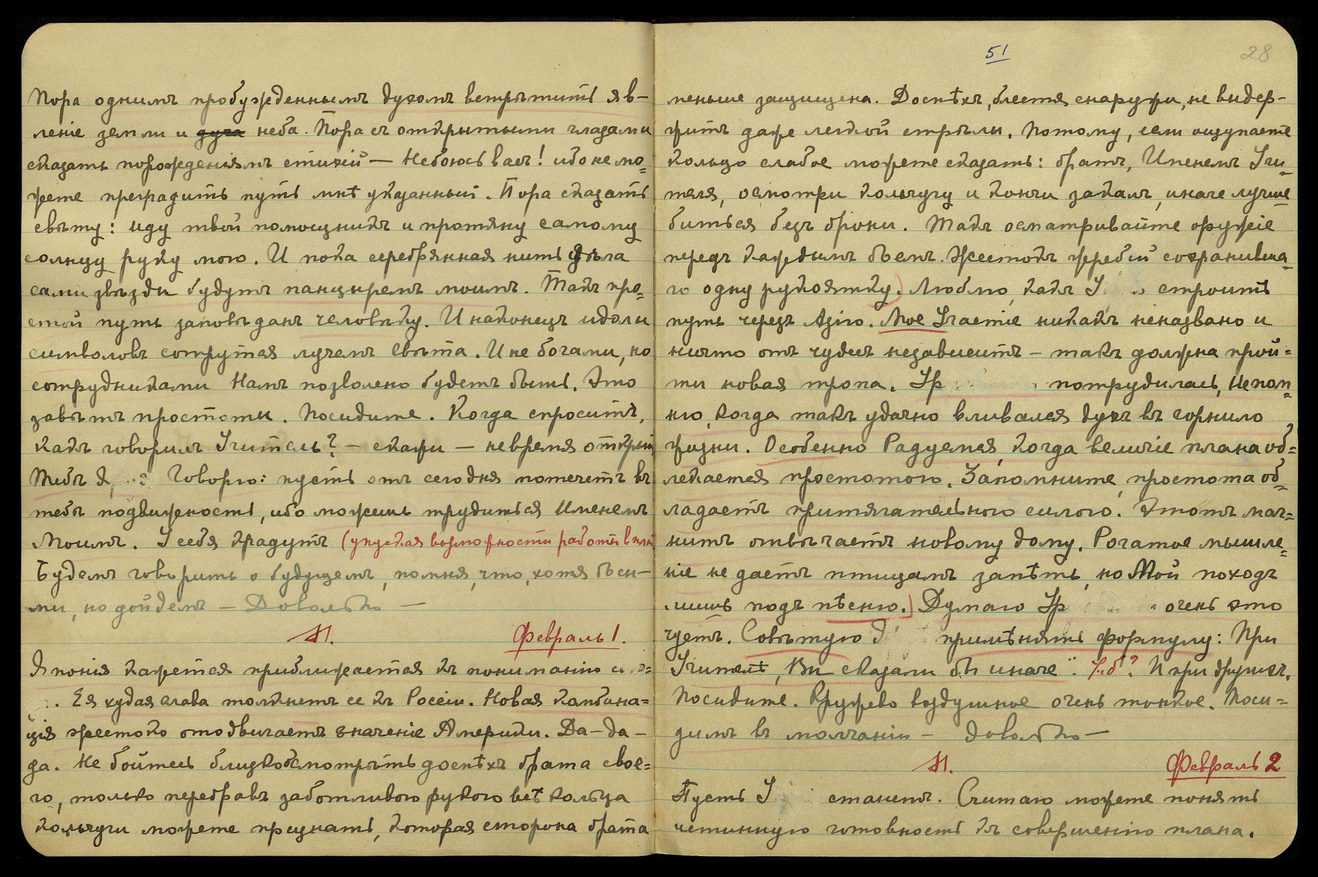 — Может быть — склад книг. Думаю, сжигайте ненужные листы — увидеть могут. Думаю, лучше написать — сжечь — о М.. Думаю, чует в[ойну] мир. Горькое маленькое сомнение живет у Л[огвана]. Указанное победное шествие не понято. Думаю, у вас широко глаза открыты, но каменные стены городов мешают. Между тем, лучшие возможности так близки.