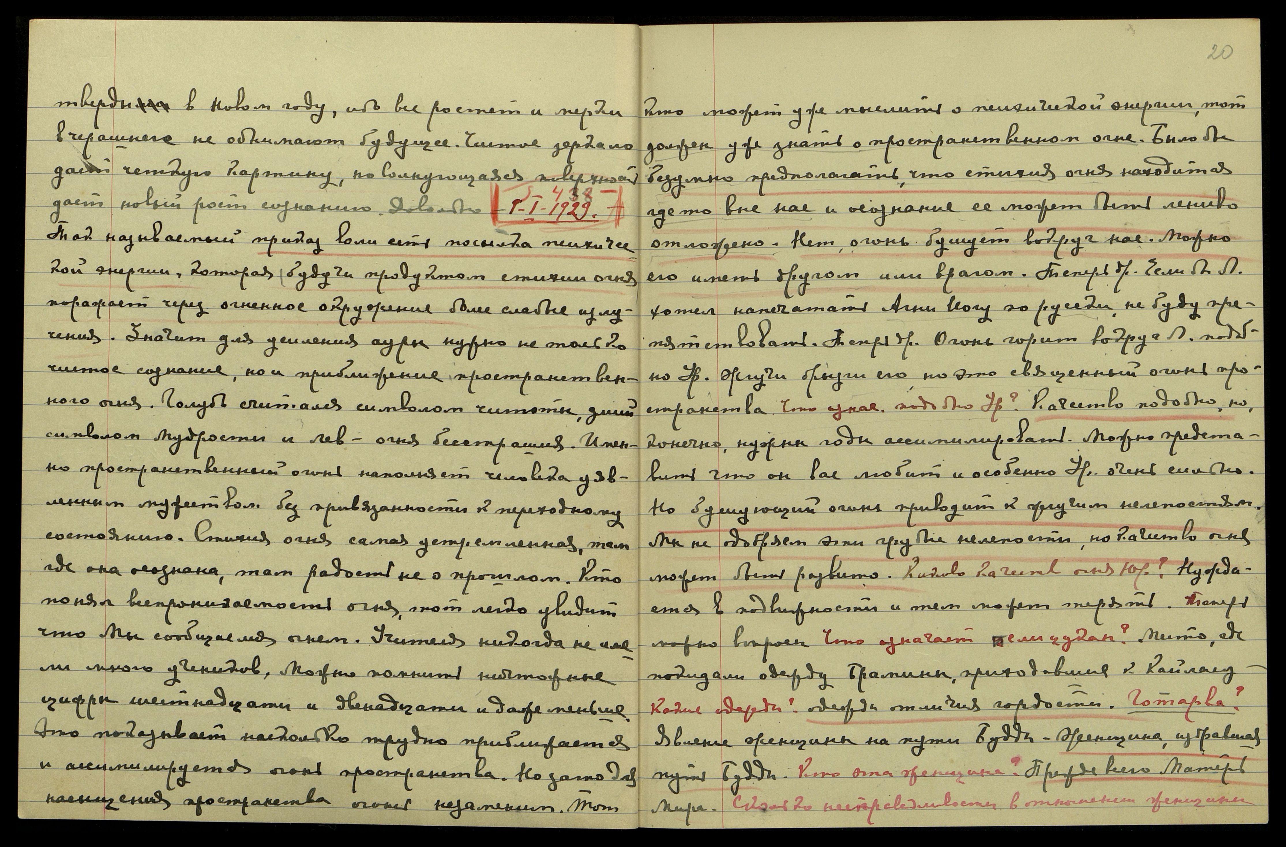 1-I-1929. [Агни Йога] § 438. Так называемый приказ воли есть посылка психической энергии, которая, будучи продуктом стихии огня, поражает через огненное окружение более слабые излучения. Значит, для усиления ауры нужно не только чистое сознание, но и приближение пространственного огня. Голубь считался символом чистоты, змий − символом мудрости, и лев − [символом] огня бесстрашия. Именно пространственный огонь наполняет человека уявленным мужеством без привязанности к переходному состоянию. Стихия огня самая устремленная, там, где она осознана, там радость не о прошлом. Кто понял всепроникаемость огня, тот легко увидит, что Мы сообщаемся огнем. Учителя никогда не имели много учеников. Можно помнить ничтожные цифры шестнадцати и двенадцати, и даже меньше. Это показывает, насколько трудно приближается и ассимилируется огонь пространства. Но зато для насыщения пространства огонь незаменим. Тот, кто может уже мыслить о психической энергии, тот должен уже знать о пространственном огне. Было бы безумно предполагать, что стихия огня находится где-то вне нас и осознание ее может быть лениво отложено. Нет, огонь бушует вокруг нас. Можно его иметь другом или врагом. Теперь др[угое]. Если бы Л[юмоу] хотел напечатать "Агни Йогу" по-русски, не буду препятствовать. Теперь др[угое]. Огонь горит вокруг Л[юмоу] подобно Урусвати. Жгучи брызги его, но это священный огонь пространства.