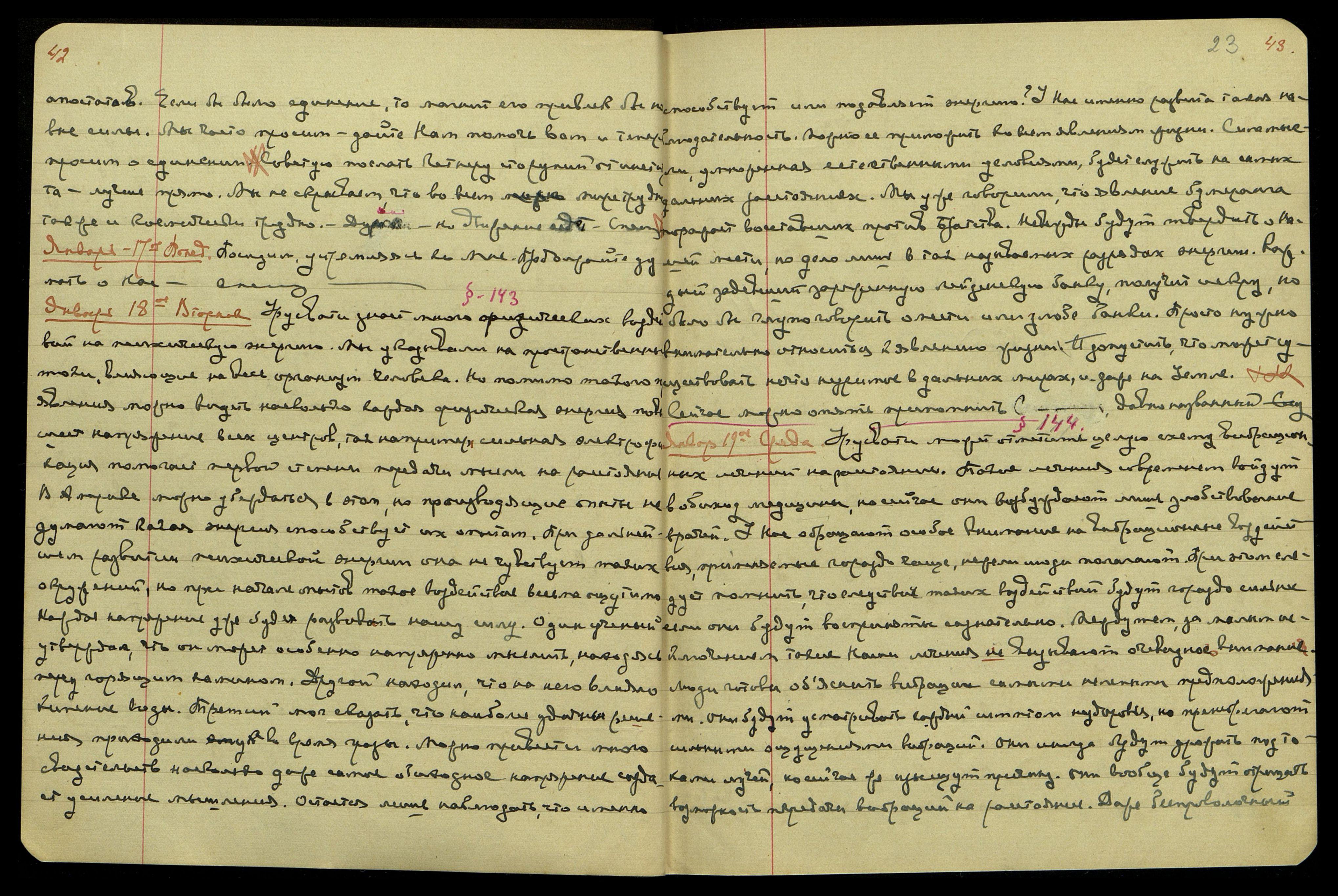 Январь, 22-ое, суббота. Сейчас главное — уберечь здоровье. Очень забочусь об этом. Много огня. Можно послать заявление, также через две недели заявление У[драи]. Урусвати может очень беречь левую сторону, чтобы не прибавить простуду. Одобряю спокойствие, ибо только здоровье не поправимо. Не будем расходовать энергию. Посидим, устремляясь ко Мне. Скажу через две недели. Довольно.