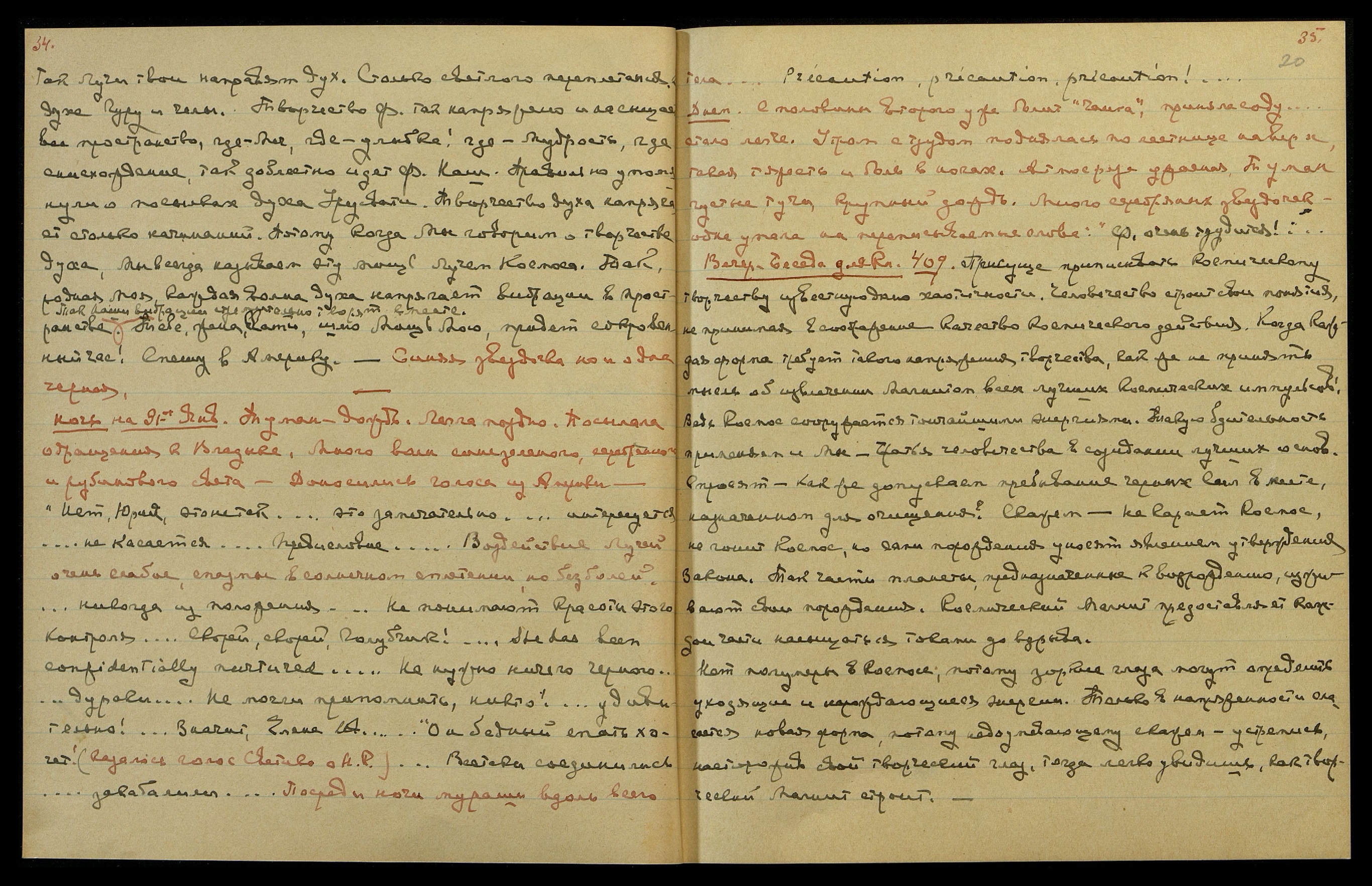 "Нет, Юрий, это не так... это замечательно... интересуется... не касается... предисловие..." Воздействие Лучей очень слабое, спазмы в солнечном сплетении, но без болей. "...никогда из положения... Не понимают Красоты этого контроля... Скорей, скорей, голубчик! She has been confidentially nurtured... [англ.: Ей можно было доверять...] Не нужно ничего чёрного... дураки... Не могли припомнить, никто! ...удивительно! Значит, Елена Ив[ановна]..." "Он бедный спать хочет!" − казалось, голос Светика о Н[иколае] К[онстантиновиче]. "Всё-таки соединились... закабалили..." Посреди ночи мураши вдоль всего тела. "Precaution, precaution, precaution! [англ.: Предосторожность, предосторожность, предосторожность!]"