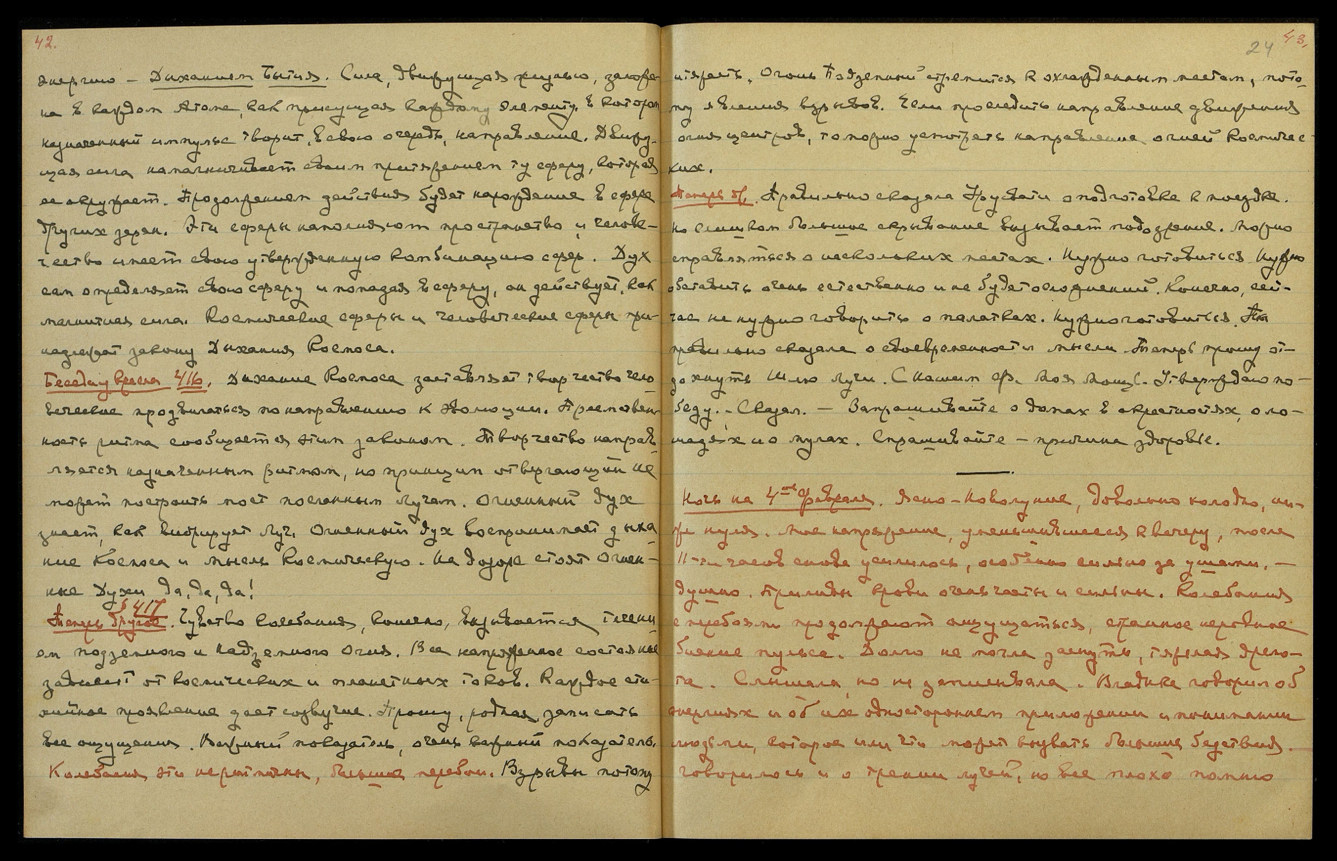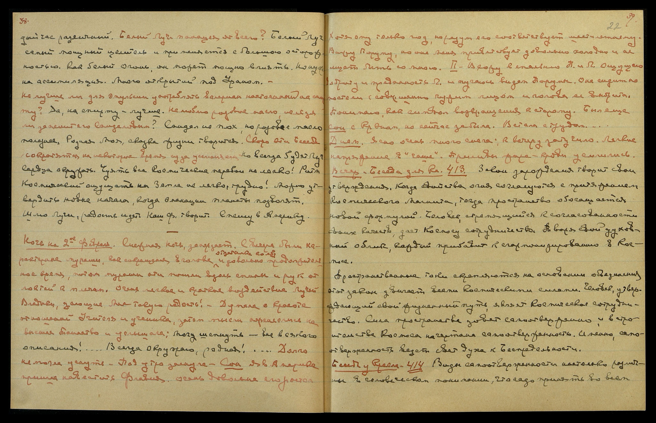 Днём. Ясно. Сильные приливы крови, напряжение в затылке и за ушами сильное. Колебания ощущаю реже, но довольно интенсивно. Сильно горят щёки и горение это началось с самого завтрака, а не после пяти [часов], как обычно. Много писала. Снова замечала мимолётные пресечения сознания. Вероятно, энергия психическая требуется в Америке. Сильные излучения синего света у пальцев.