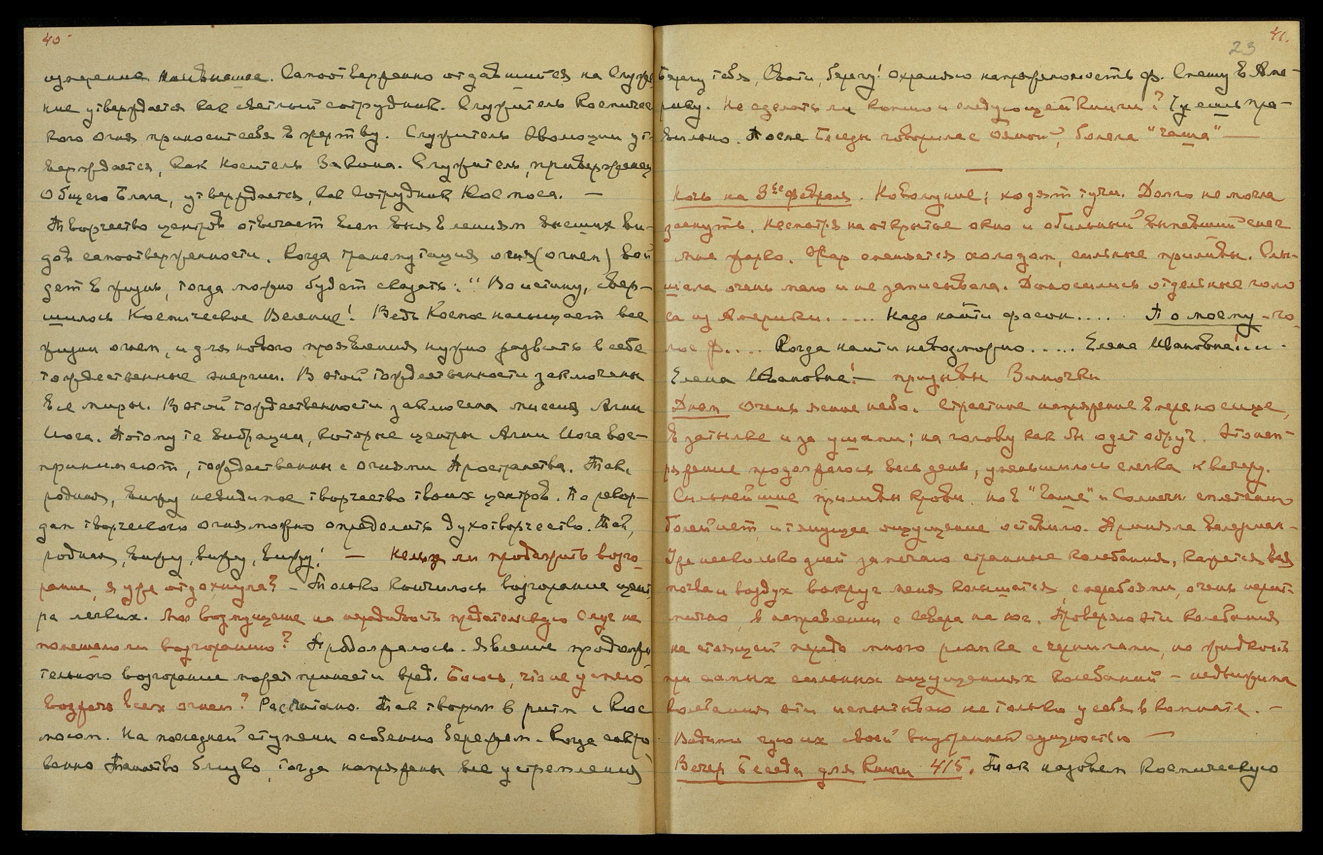 от 4° до 7° Цельсия. Душно, сплю с холодным мешком под головою. Приливы сильны. Воздействие Лучей Вл[ады]ки вначале, затем безболезненное ощущение в сердце, разница от обычного темпа пульса. Долго не могла заснуть. Тянущая боль в "Чаше". В 2 1/2 ч[аса] ночи приняла соду − стало легче. Слышала мало. "Елена Ивановна не хочет выходить...", − мужской голос... Думы о белом Луче. Услышала: "Громадное достижение..." "Никто ничего о нём не знает и не говорит..." "Ай, какой кошмар!" − казалось, голос Зины. "Le maledetto! An empty house it seems to me. [итал.: Чёрт тебя подери! англ.: Пустой дом, мне кажется.]" Видение смутных каких-то образований. Руки перелистывают книгу или перебирающие бумаги и предметы. Вспышка пламени золотистого, размером [с] малую свечу. В пять часов заснула, проспала до 9 часов. Еле встала с напряжением в голове.