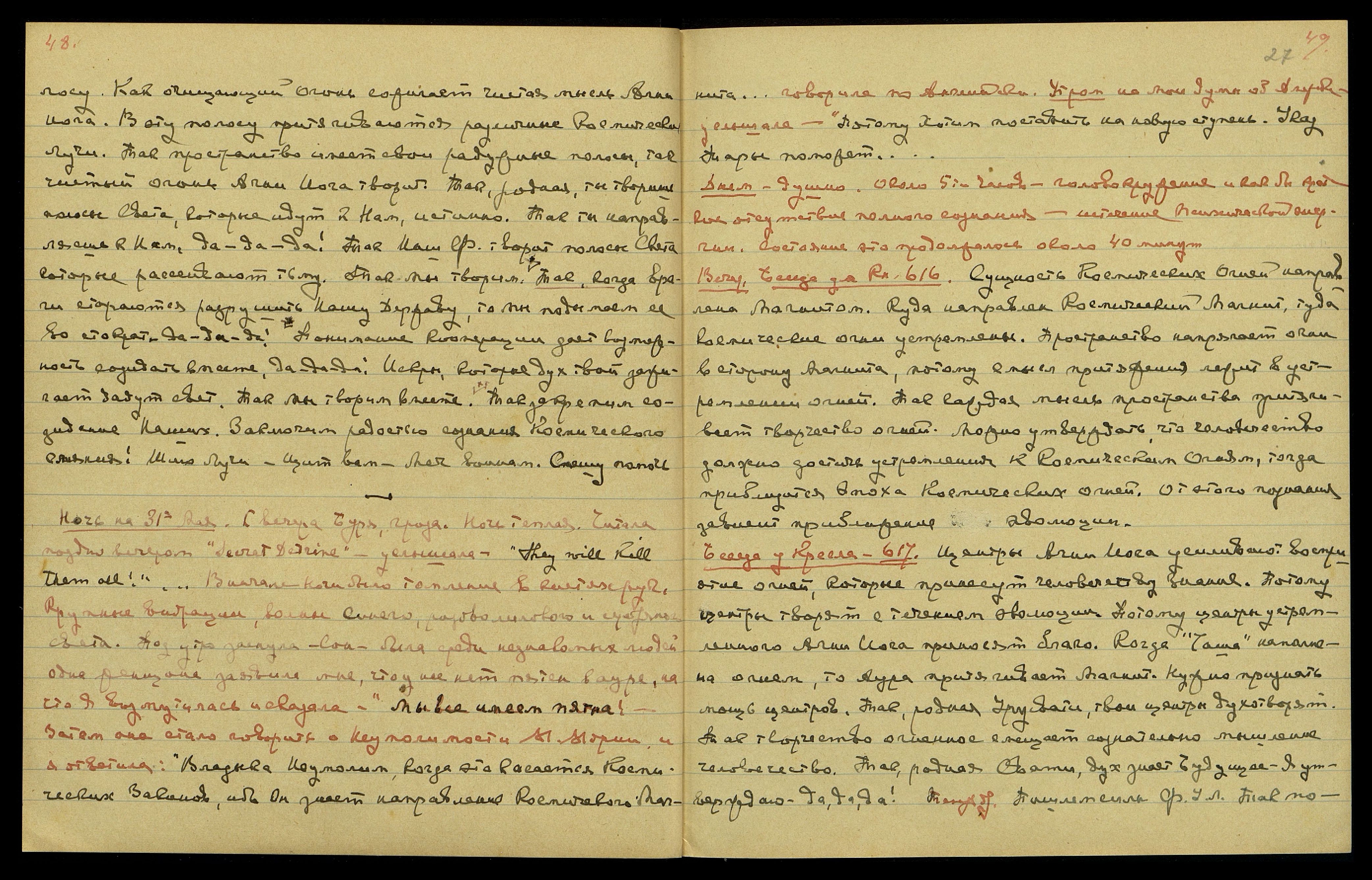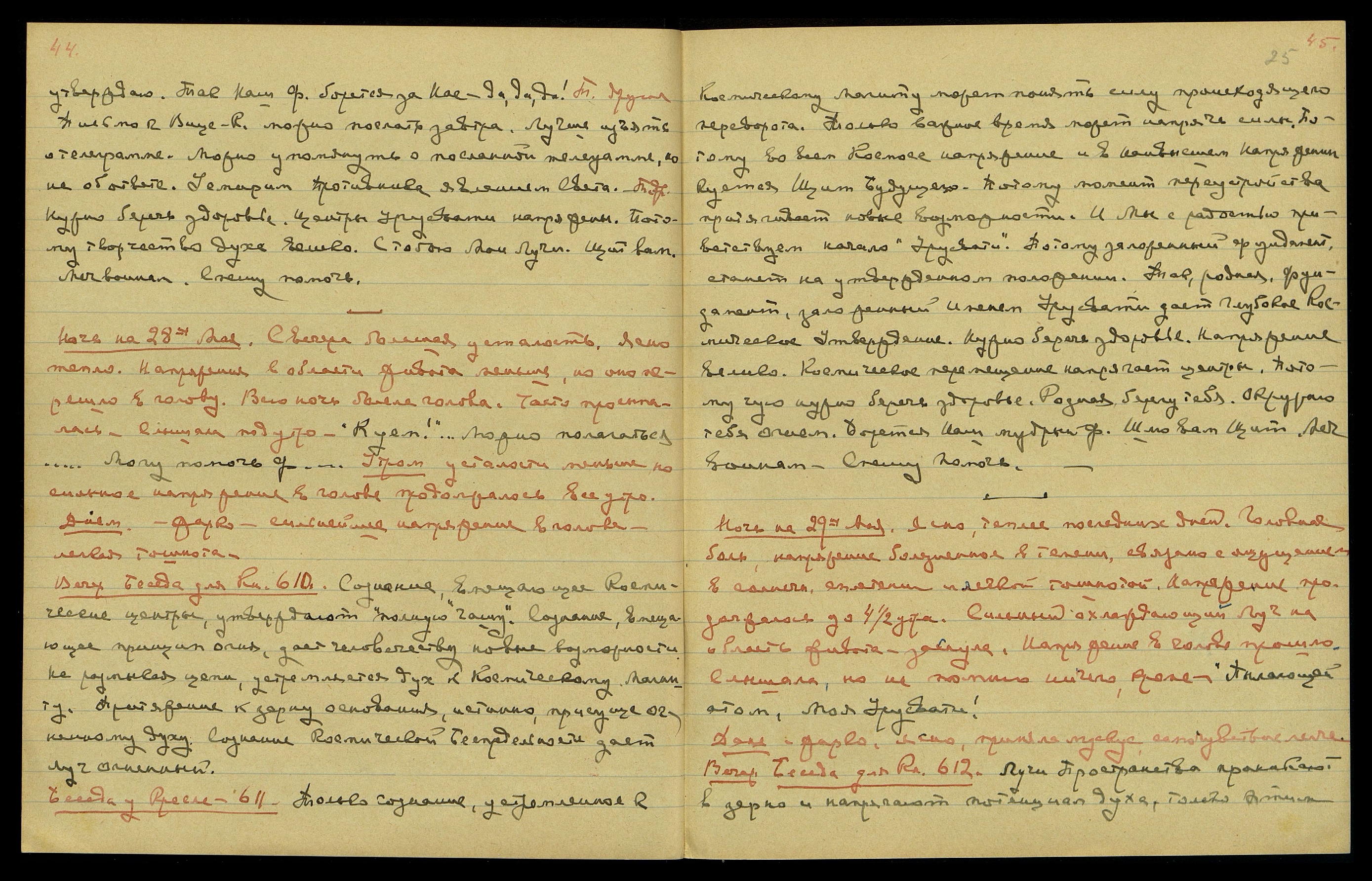 Ночь на 29-ое мая. Ясно, теплее последних дней. Головная боль, напряжение болезненное в темени, связано с ощущением в солнечн[ом] сплетении и лёгкой тошнотой. Напряжение продолжалось до 4 1/2 утра. Сильный охлаждающий Луч на область живота − заснула. Напряжение в голове прошло. Слышала, но не помню ничего, кроме: "Пылающий атом, Моя Урусвати!"