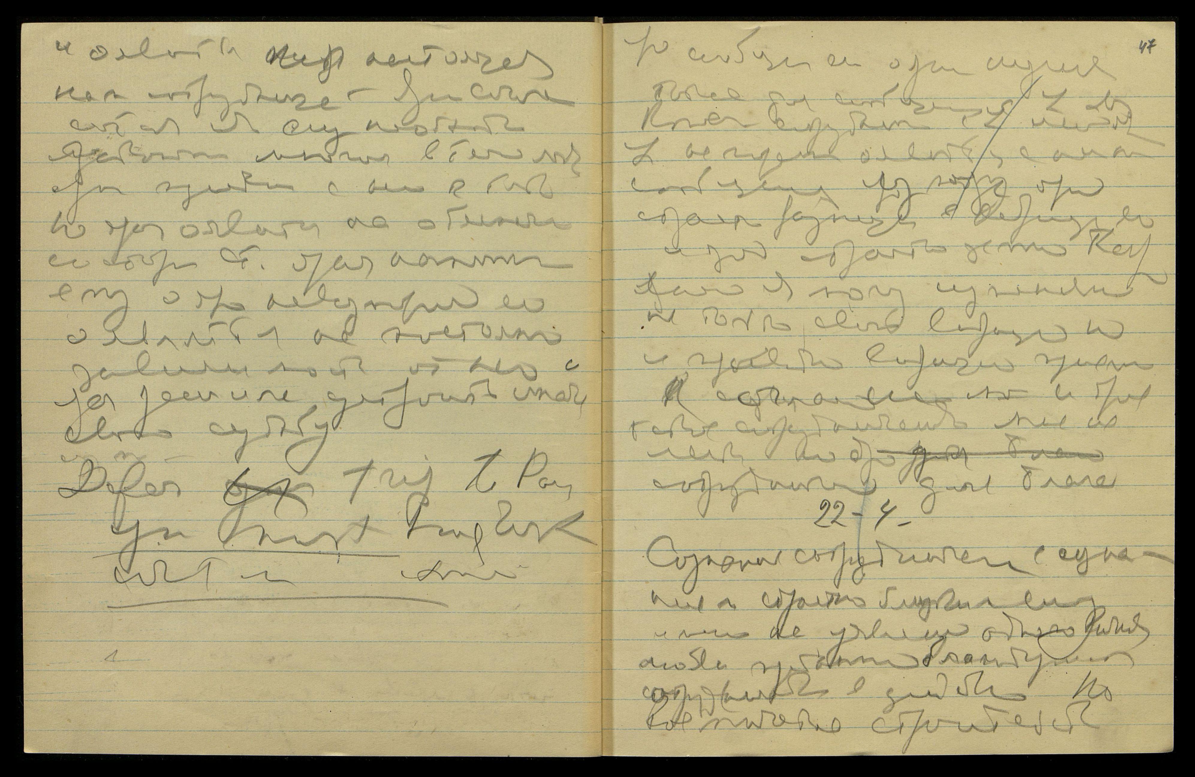 и оявится как настоящая нам сотрудница. Ярый согласится, ибо ему необход[имо] закончить многое в течение лета. Ярый приедет с нею к тебе. Но ярая оявится на обеспечении со стороны Ст. Ярая напишет ему о ярой невозможности ей оявляться на постоянной зависимости от него и ярая решила устроить иначе свою судьбу.
