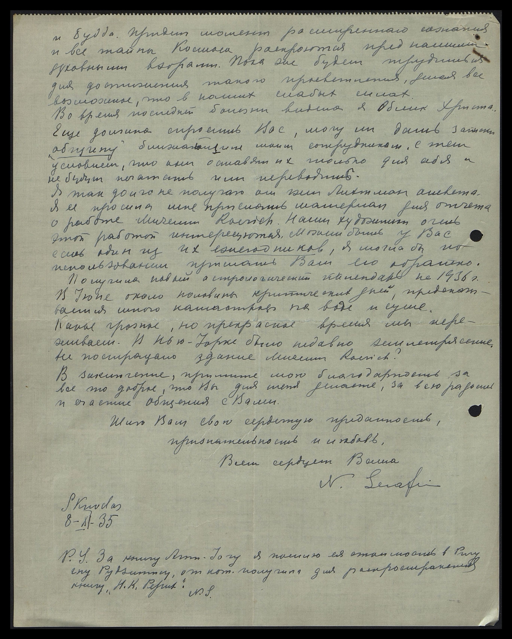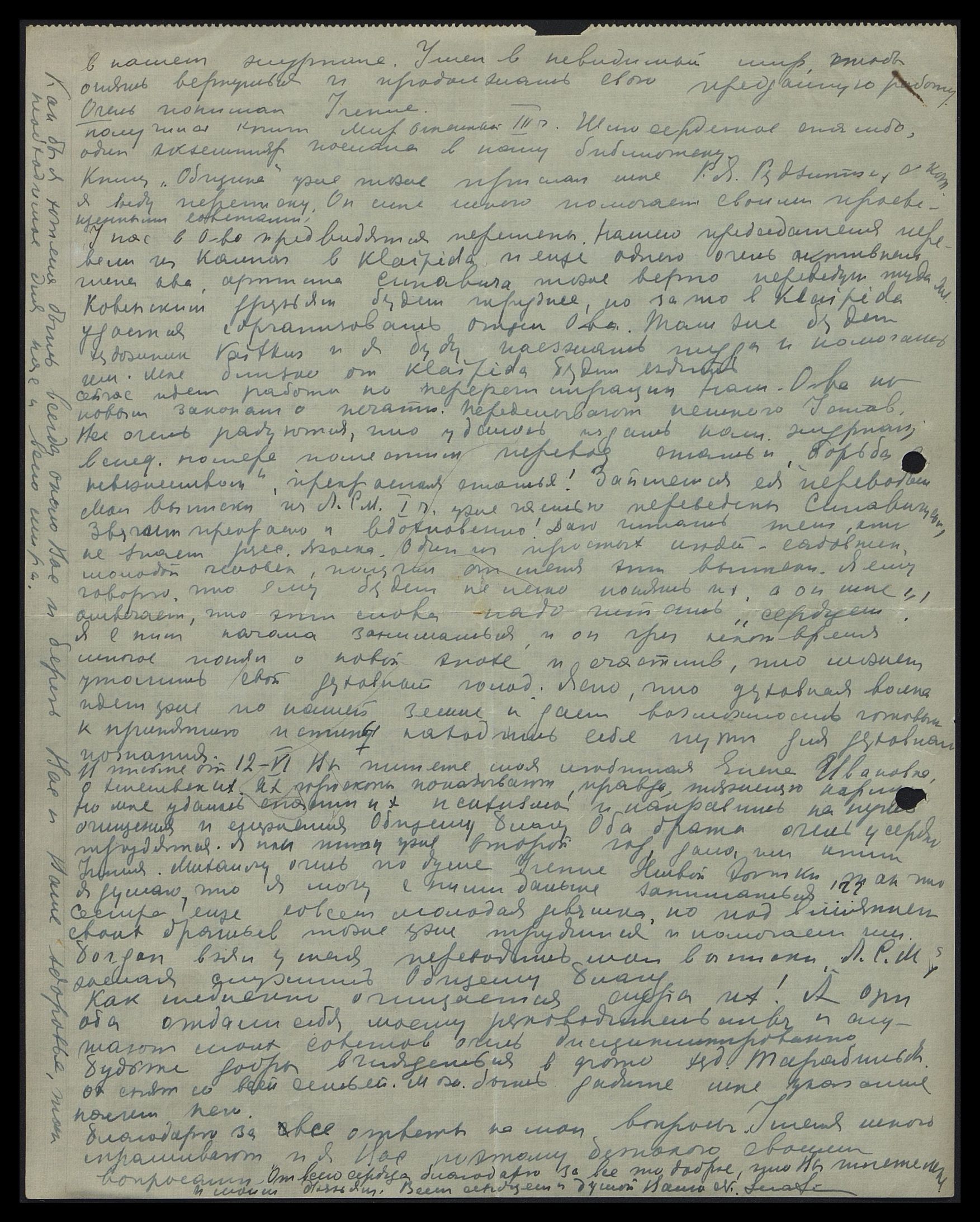 Получила Ваше драгоценное для меня письмо, которое ждала с нетерпением. Благодарю Вас за все те прекрасные сведения и весь материал, который передан по назначению. Получила английскую книгу и брошюры, за которые шлю также сердечное спасибо.