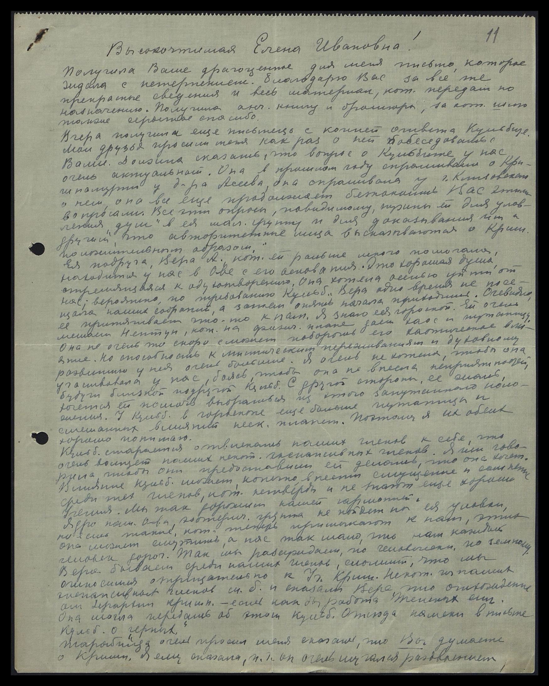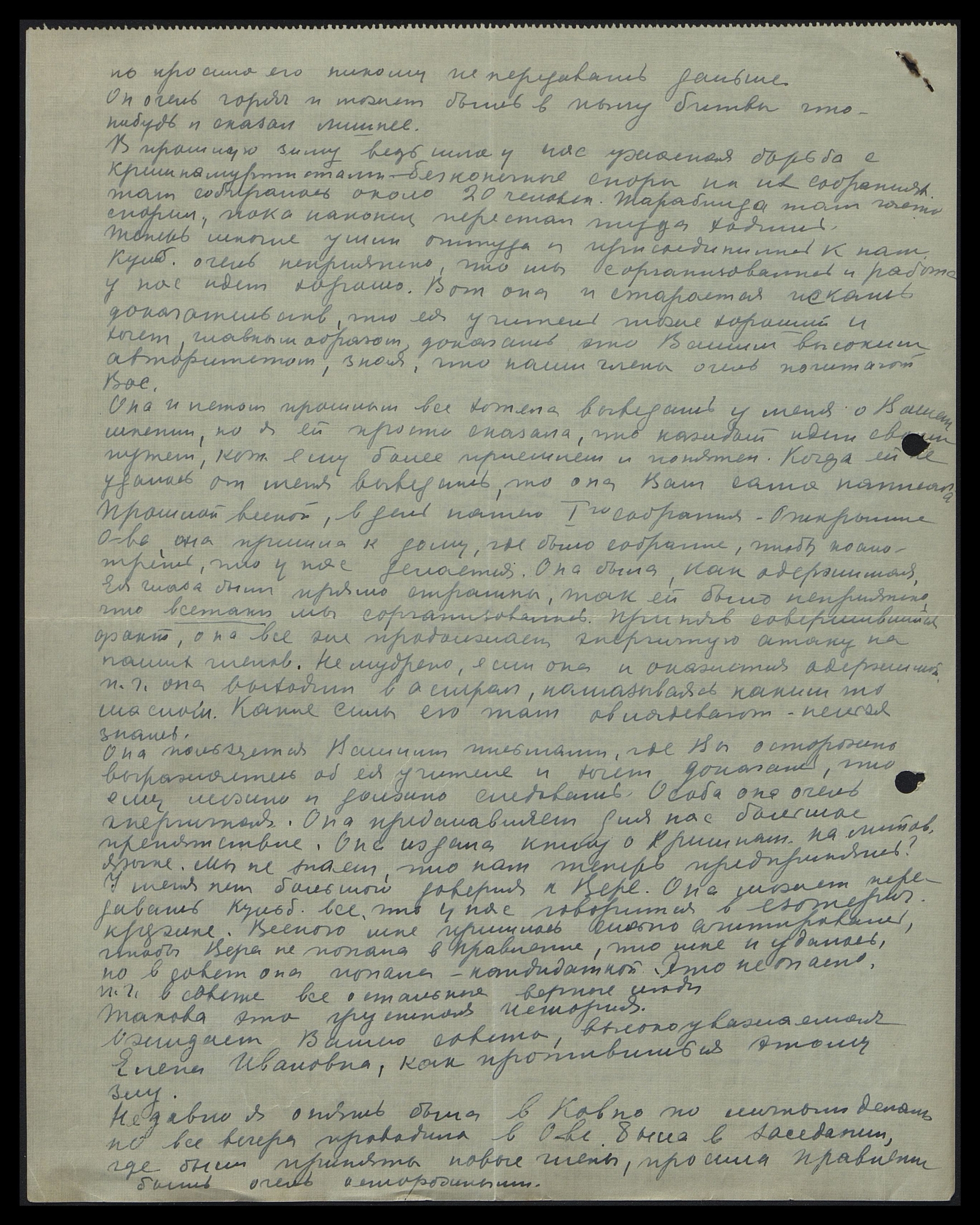 Шлю Вам, моя любимая Елена Ивановна, сердечную благодарность за всю ту силу духовную и поддержку, которую Вы так обильно мне посылали и посылаете. Сердечное спасибо за все добрые, сердечные письма, которые я получила от Вас и от нашего любимого вождя, Николая Константиновича.