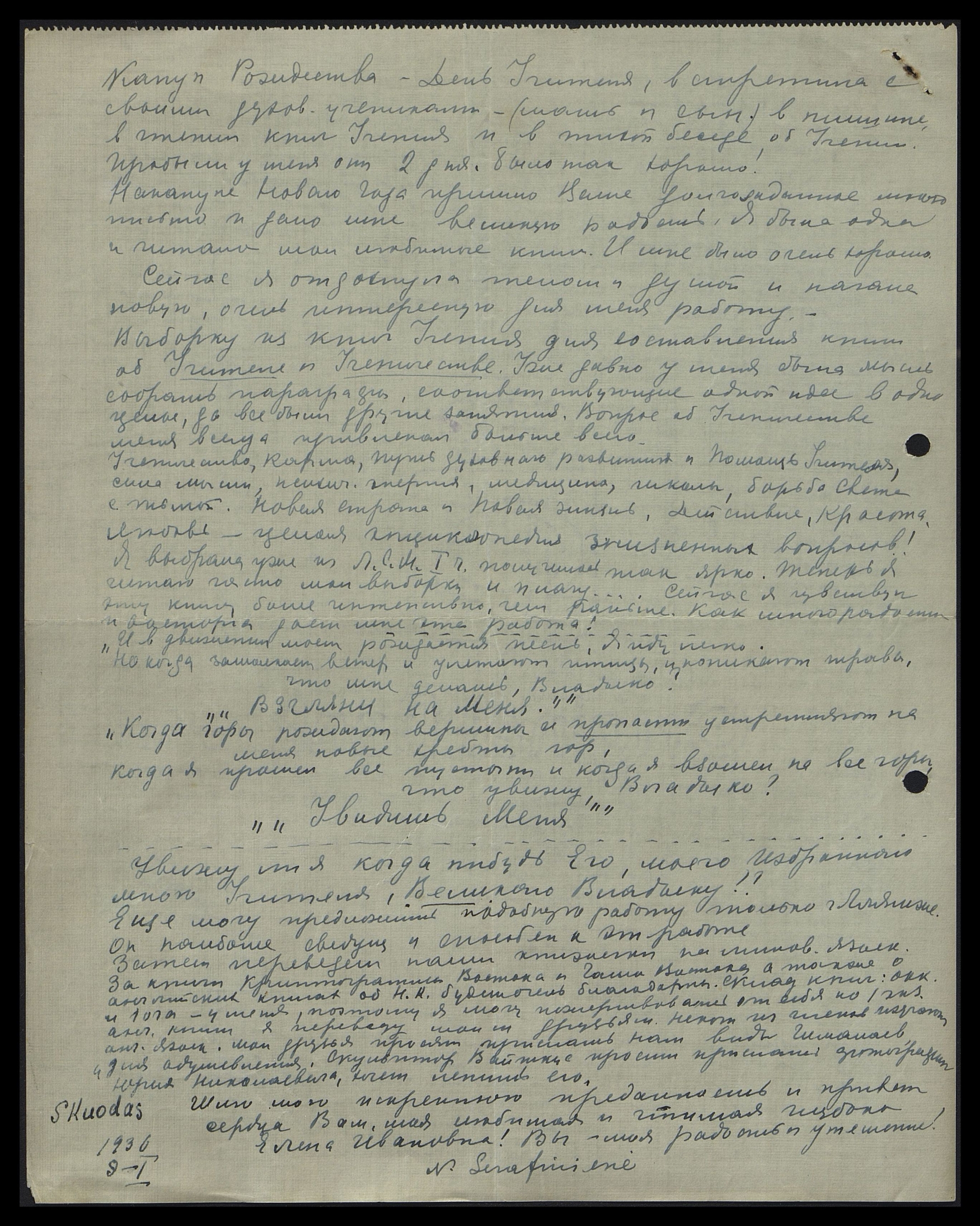Накануне Нового года пришло Ваше долгожданное мною письмо и дало мне великую радость. Я была одна и читала мои любимые книги. И мне было очень хорошо.