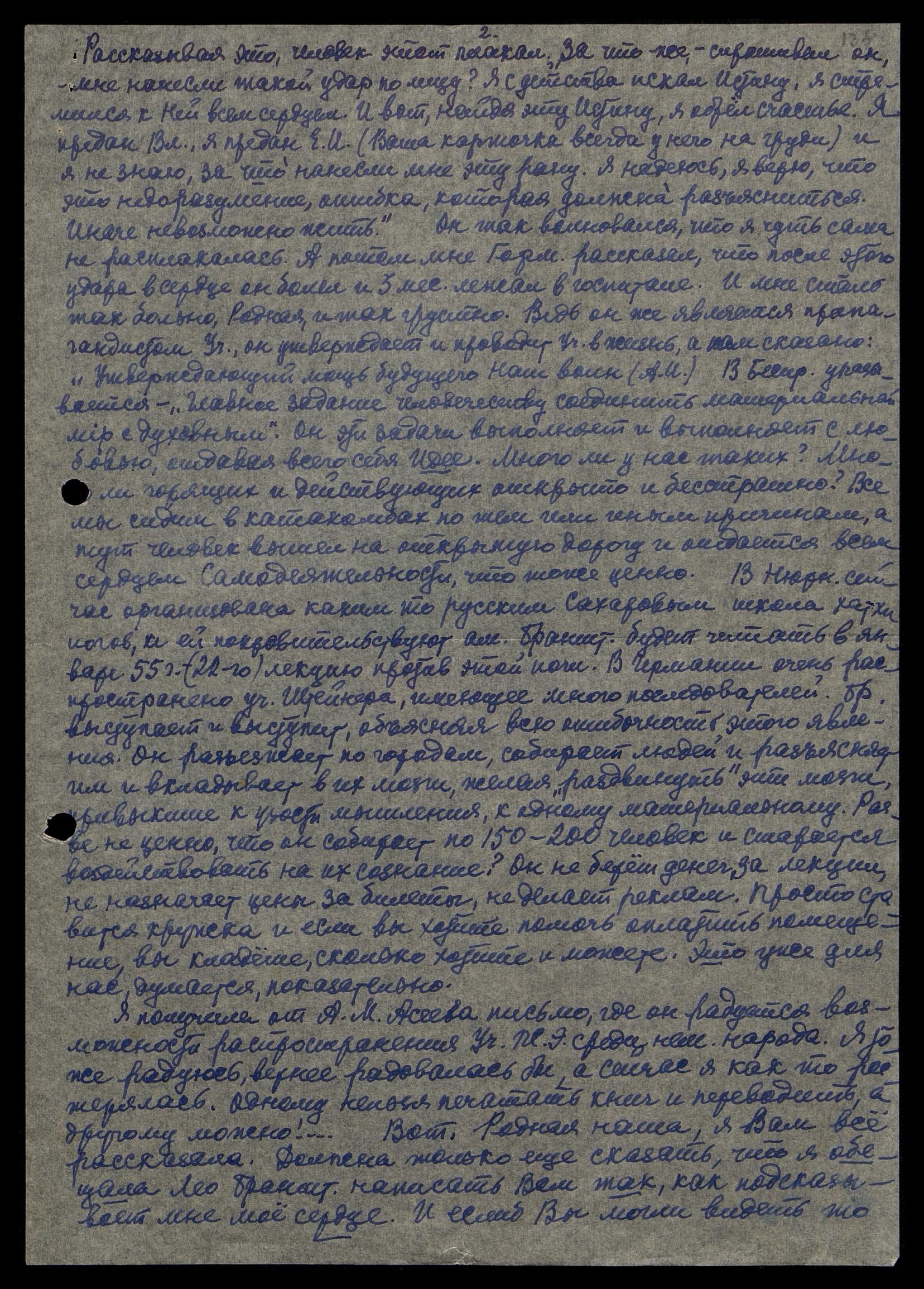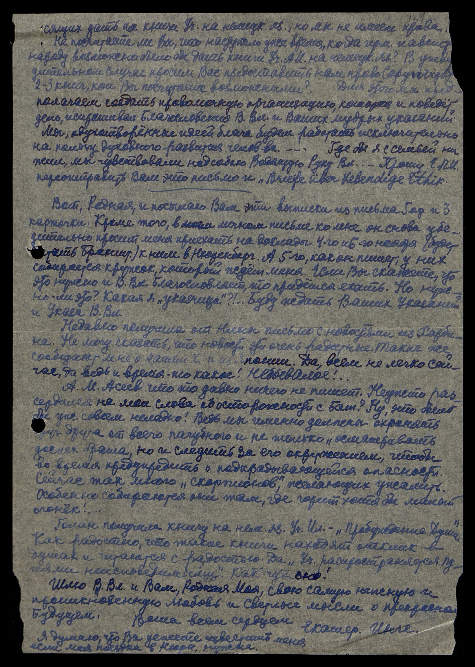 Я получила от А. М. Асеева письмо, где он радуется возможности распространения Учения Живой Этики среди немецкого народа. Я тоже радуюсь, вернее радовалась бы, а сейчас я как-то растерялась. Одному нельзя печатать книг и переводить, а другому можно!... Вот. Родная наша, я Вам всё рассказала. Должна только еще сказать, что я обещала Леопольду Брандштеттеру написать Вам так, как подсказывает мне моё сердце. И если б Вы могли видеть то