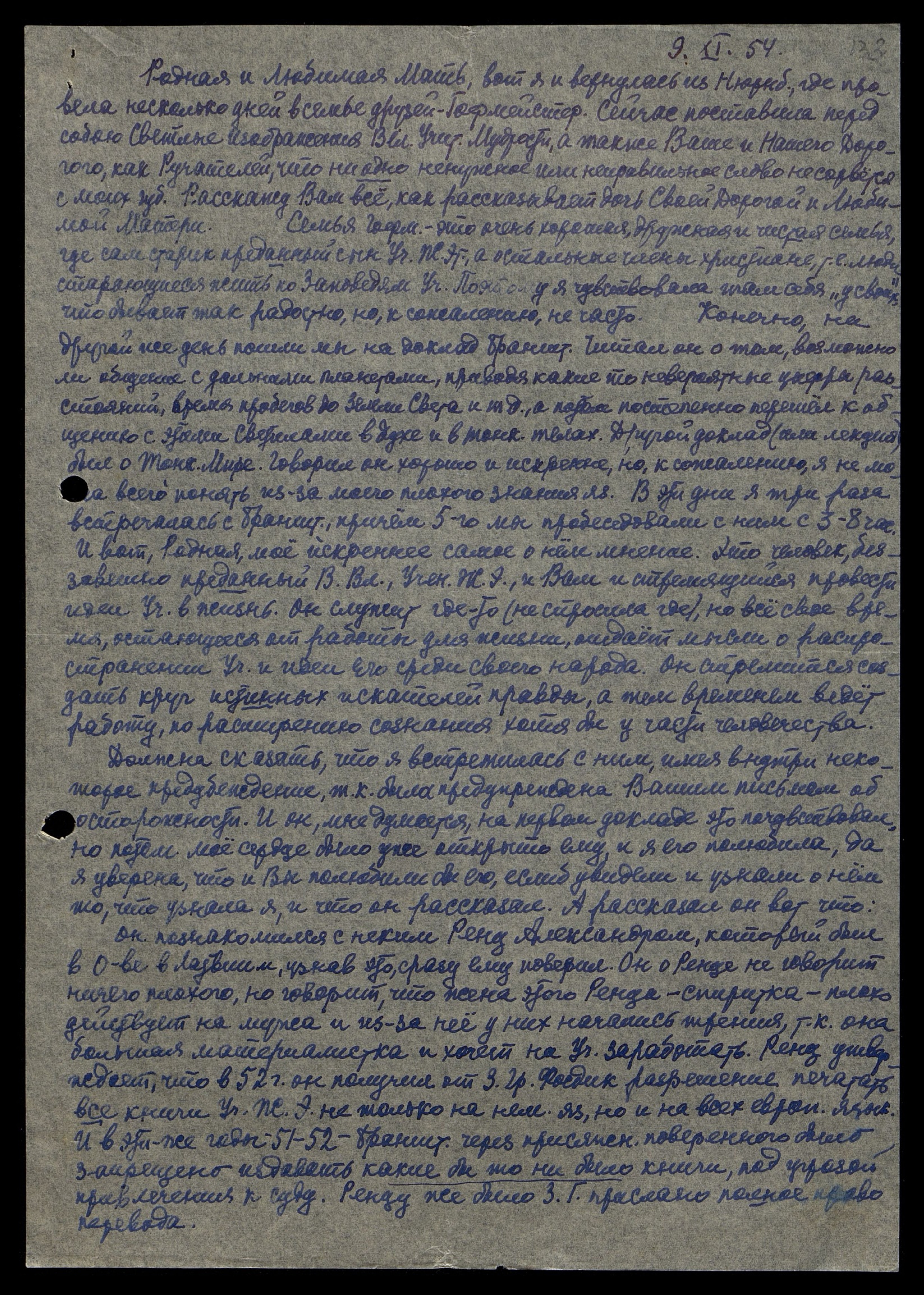 Родная и Любимая Мать, вот я и вернулась из Нюрнберга, где провела несколько дней в семье друзей Гофмейстеров. Сейчас поставила перед собою Светлые Изображения Вел[икого] Учит[еля] Мудрости, а также Ваше и Нашего Дорогого, как Ручателей, что ни одно ненужное или неправильное слово не сорвётся с моих губ. Расскажу Вам всё, как рассказывает дочь Своей Дорогой и Любимой Матери.