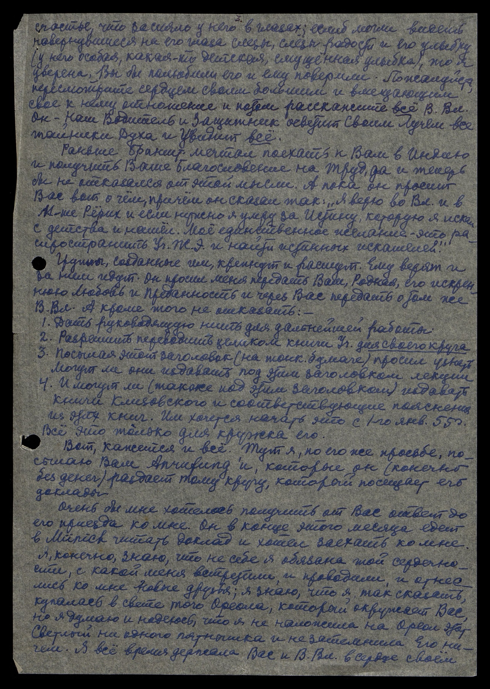 Мы, одухотворённые идеей блага, будем работать исключительно на пользу духовного развития человечества... Где бы я с семьей ни жил, мы чувствовали над собою Водящую Руку Вл[адыки]... Прошу Е.П. Инге переправить Вам это письмо и "Briefe über Lebendige Ethik" [нем.: Письма о Живой Этике]".
