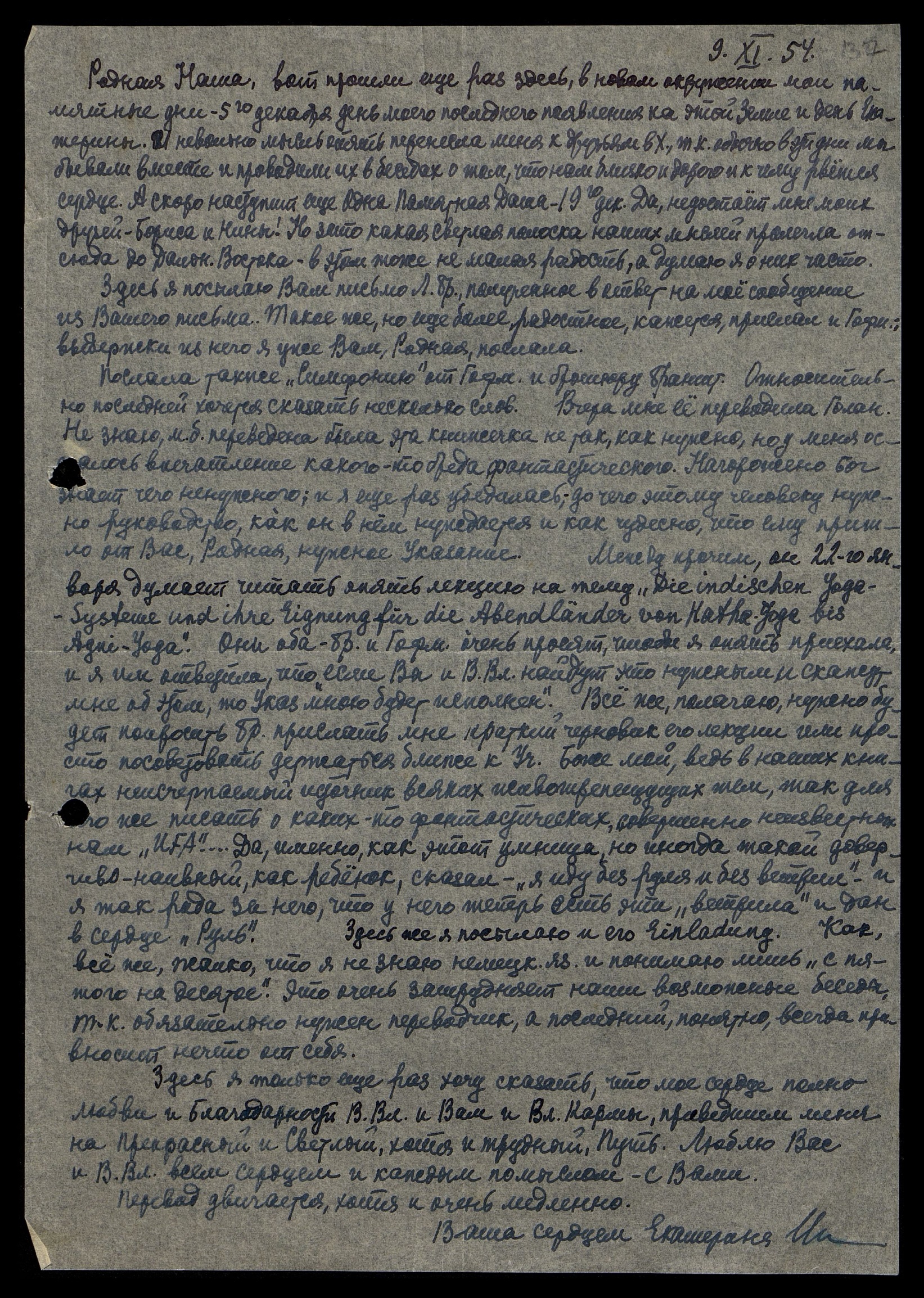 Скорей посылаю эту весточку, чтоб еще и еще рассказать - не бойтесь за меня, Родная; я никому и ничему не отдам своего сердца и мыслей своих кроме как Вам и В[еликому] Учителю, Давшему нам ВСЁ. Люблю Вас и Его и посылаю сердце своё Всей Иерархии Света. Спасибо за заботу, и за ласку, и за Совет. Всё постараюсь исполнить, как СКАЗАНО.