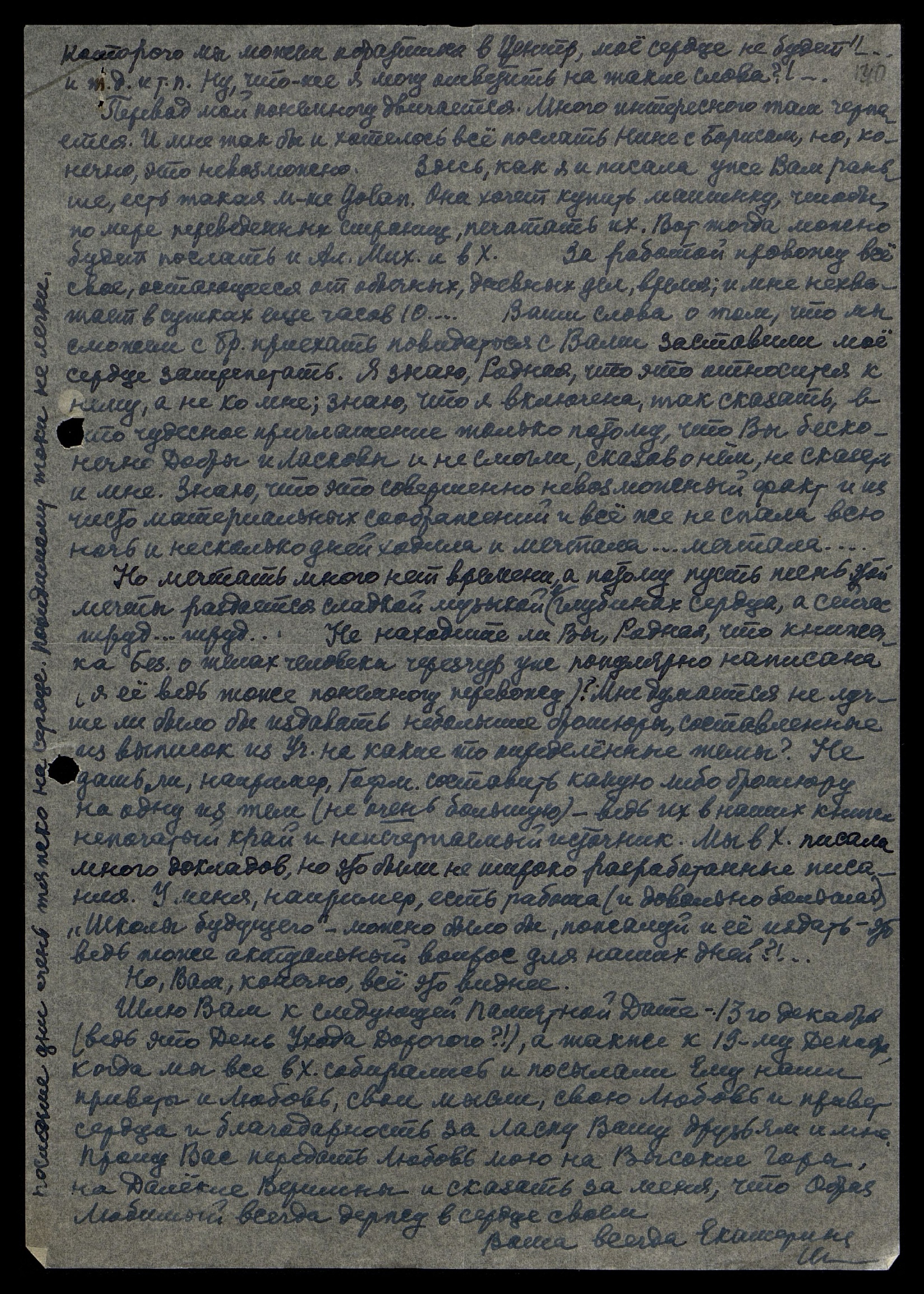 Родная Наша, вот прошли еще раз здесь в новом окружении мои памятные дни - 5-го декабря день моего последнего появления на этой Земле и день Екатерины. И невольно мысль опять перенесла меня к друзьям в Х[арбин], т.к. обычно в эти дни мы бывали вместе и проводили их в беседах о том, что нам близко и дорого и к чему рвётся сердце. А скоро наступит еще одна Памятная Дата - 19-го декабря. Да, недостаёт мне моих друзей - Бориса и Нины! Но зато какая светлая полоска наших мыслей пролегла отсюда до дальнего Востока - в этом тоже не малая радость, а думаю я о них часто.