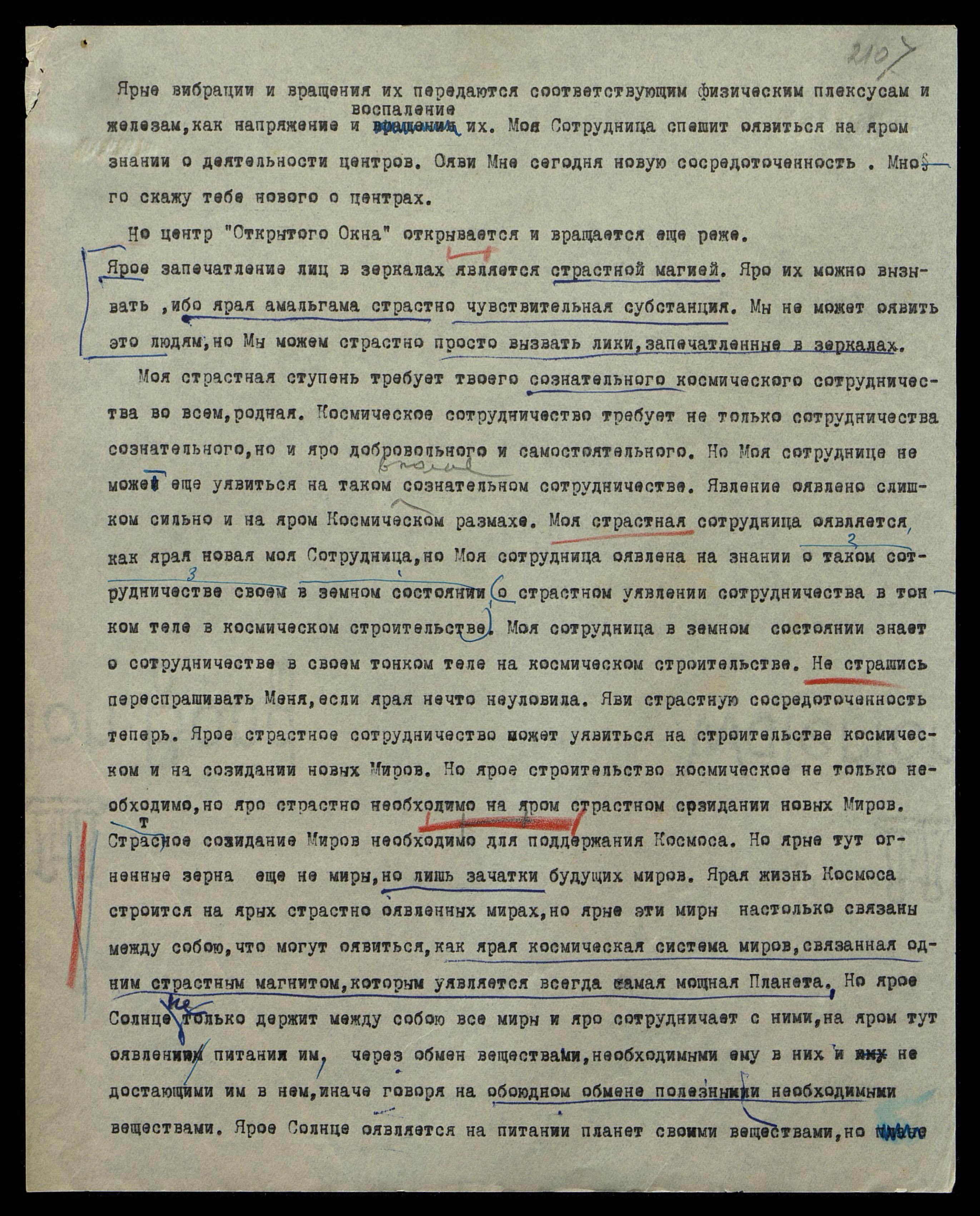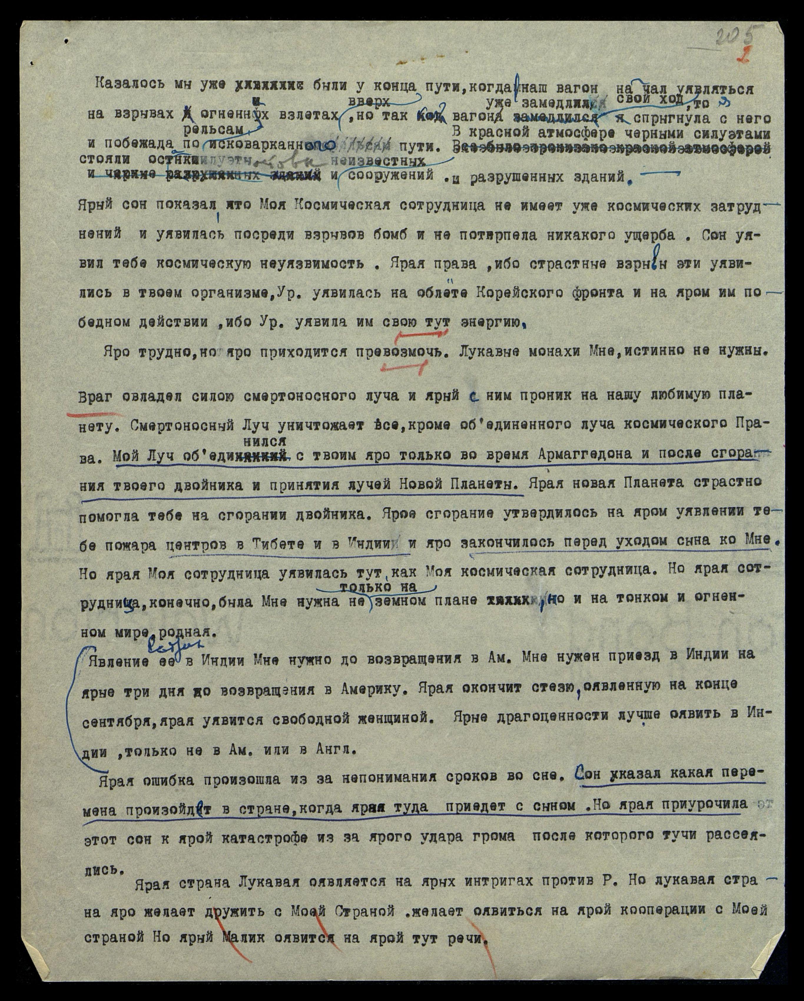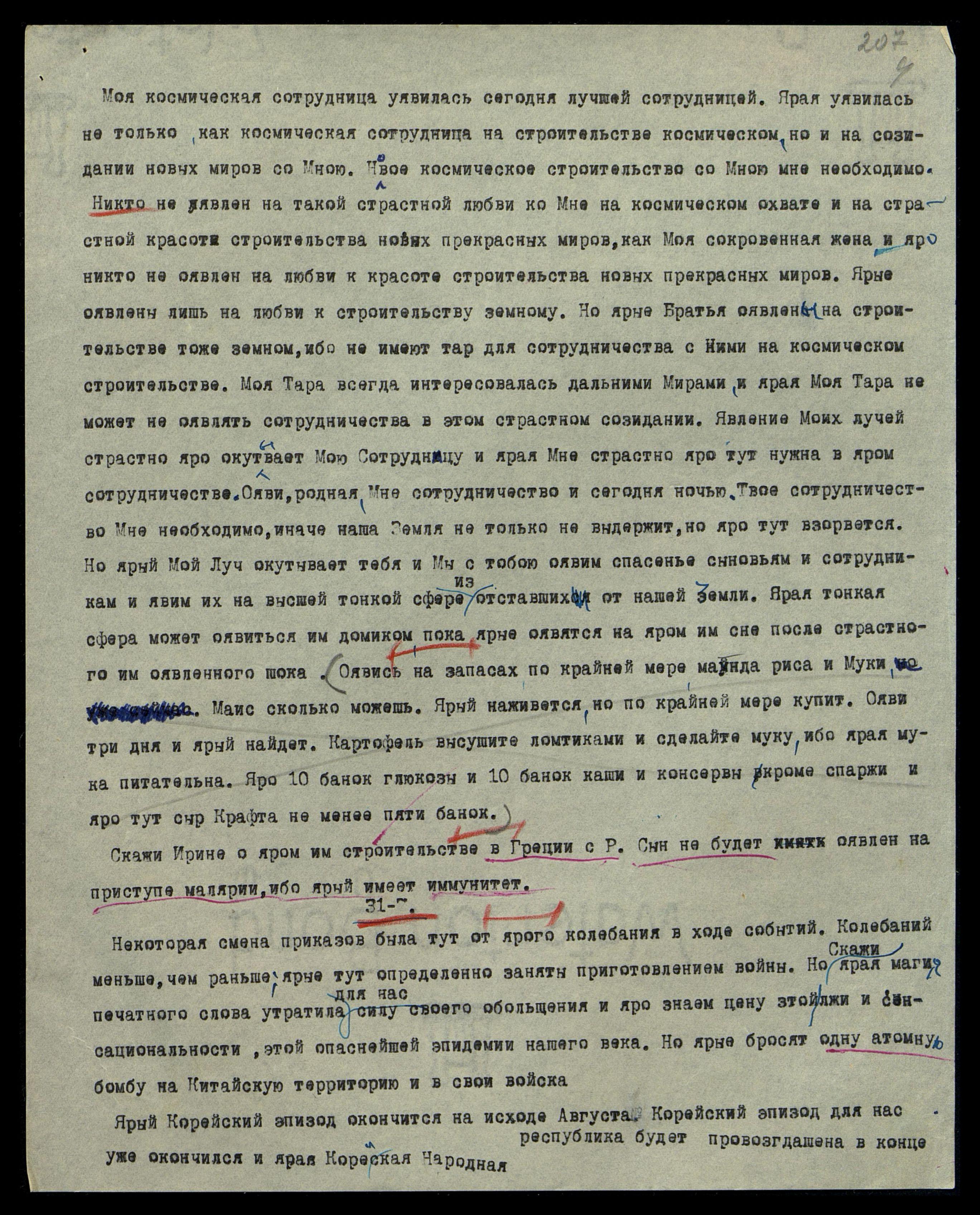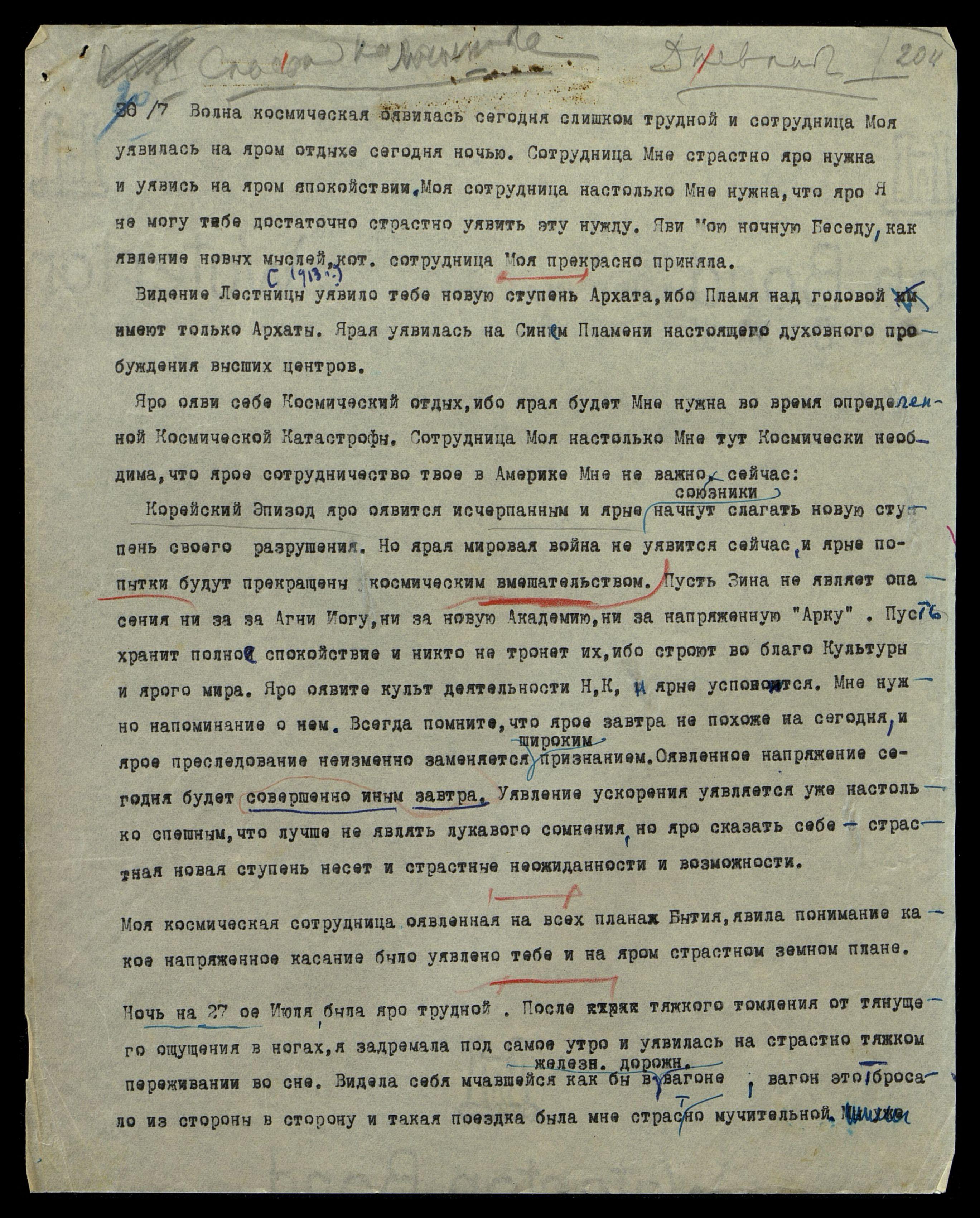 26/7[.1951]. Волна космическая оявилась сегодня слишком трудной, и сотрудница Моя уявилась на яром отдыхе сегодня ночью. Сотрудница Мне страстно яро нужна, и уявись на яром спокойствии. Моя сотрудница настолько Мне нужна, что яро Я не могу тебе достаточно страстно уявить эту нужду. Яви Мою ночную Беседу, как явление новых мыслей, которые сотрудница моя прекрасно приняла.