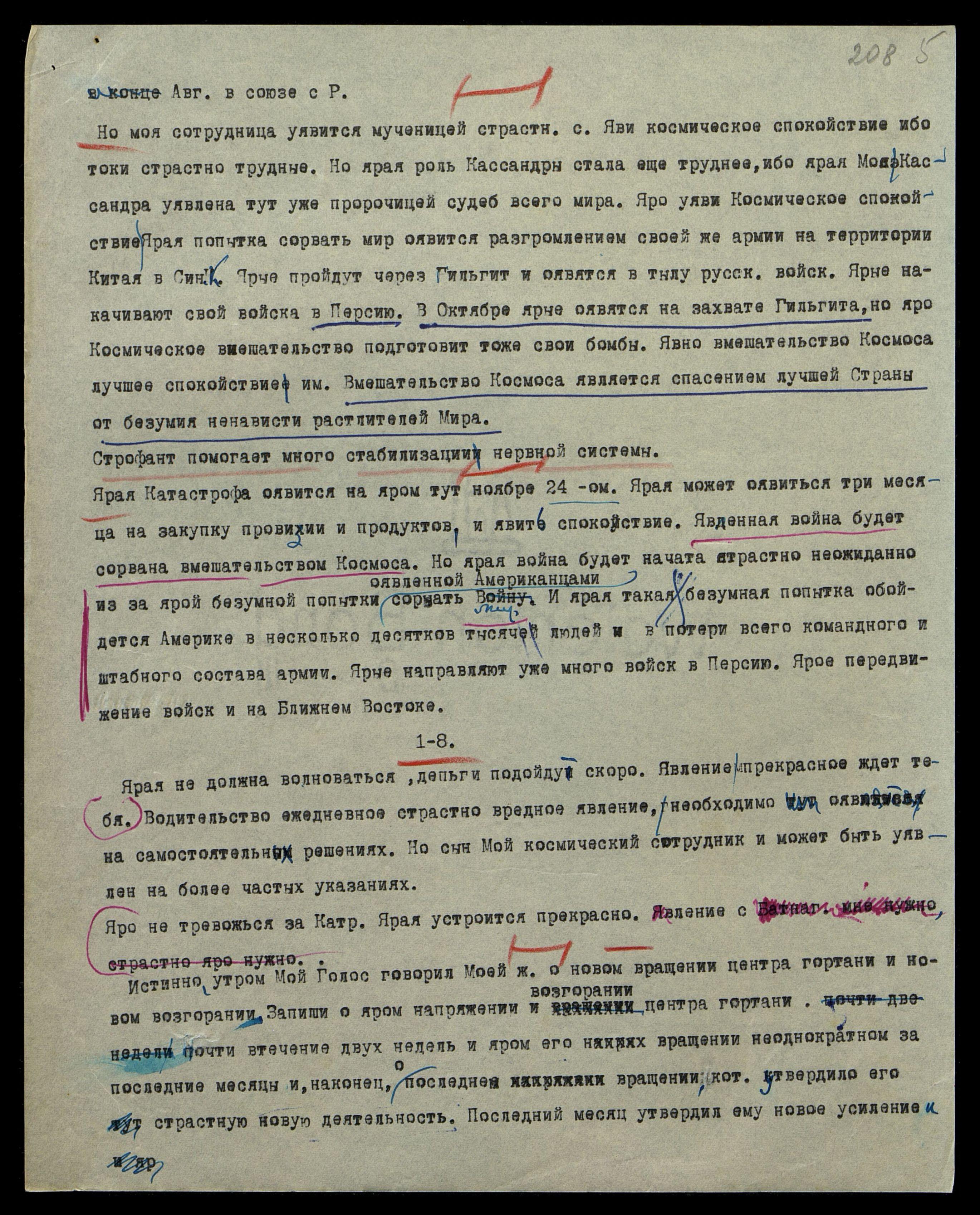 Но моя сотрудница уявится мученицей страстной. Яви космическое спокойствие, ибо токи страстно трудные. Но ярая роль Кассандры стала еще труднее, ибо ярая Моя Кассандра уявлена тут уже пророчицей судеб всего мира. Яро уяви Космическое спокойствие. Ярая попытка сорвать мир оявится разгромлением своей же армии на территории Китая в Синь-К[иянге]. Ярые пройдут через Гильгит и оявятся в тылу русск[их] войск. Ярые накачивают свои войска в Персию. В октябре ярые оявятся на захвате Гильгита, но яро Космическое вмешательство подготовит тоже свои бомбы. Явно вмешательство Космоса лучшее спокойствие им. Вмешательство Космоса является спасением лучшей Страны от безумия ненависти растлителей Мира.