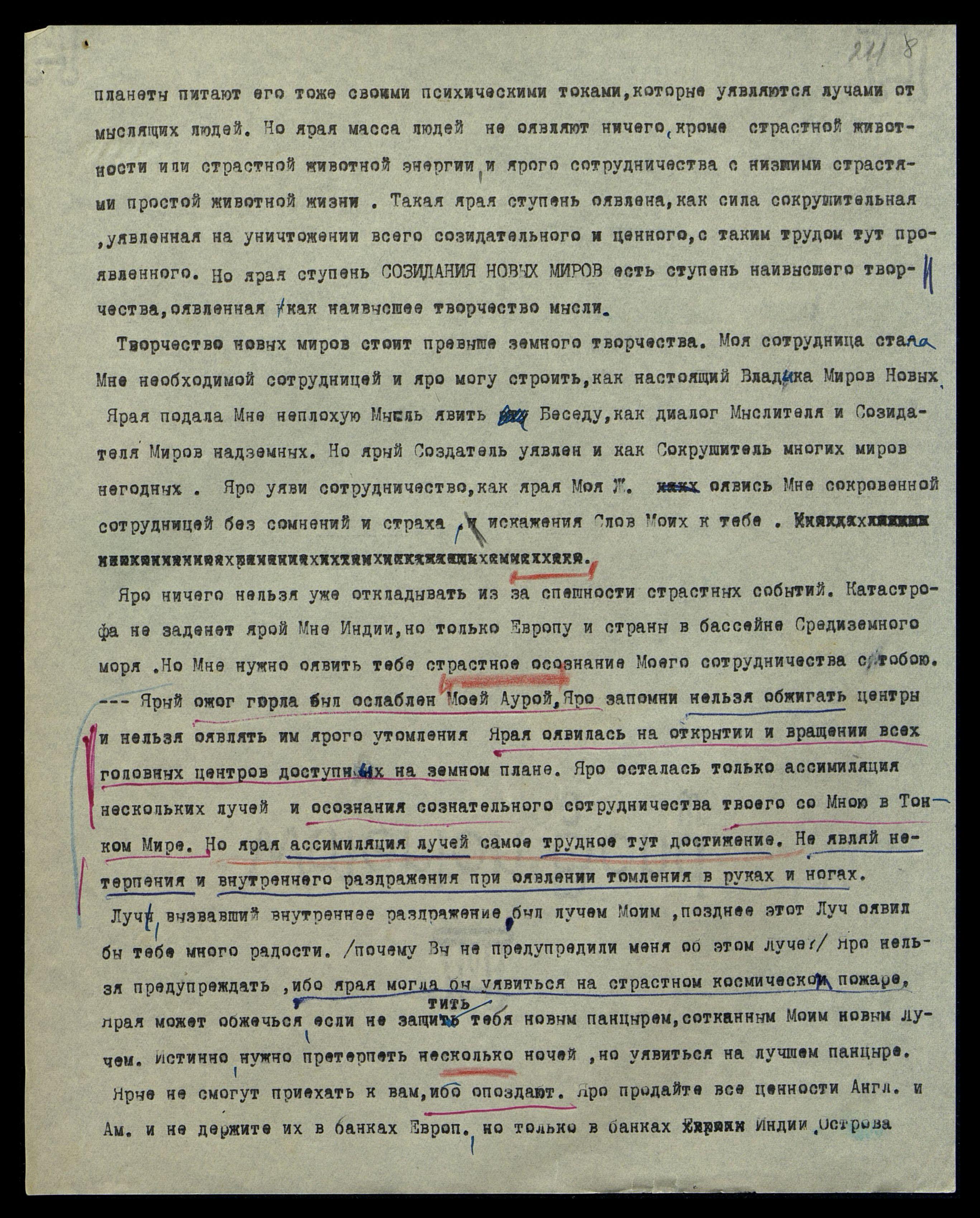 Пусть Зина не являет опасения ни за Агни Йогу, ни за новую Академию, ни за напряжённую «Арку». Пусть хранит полное спокойствие, и никто не тронет их, ибо строят во благо Культуры и ярого мира. Яро оявите культ деятельности Н[иколая] К[онстантиновича], и ярые успокоятся. Мне нужно напоминание о нём. Всегда помните, что ярое завтра не похоже на сегодня, и ярое преследование неизменно заменяется широким признанием. Оявленное напряжение сегодня будет завтра совершенно иным. Уявление ускорения уявляется уже настолько спешным, что лучше не являть лукавого сомнения, но яро сказать себе — страстная новая ступень несёт и страстные неожиданности и возможности.