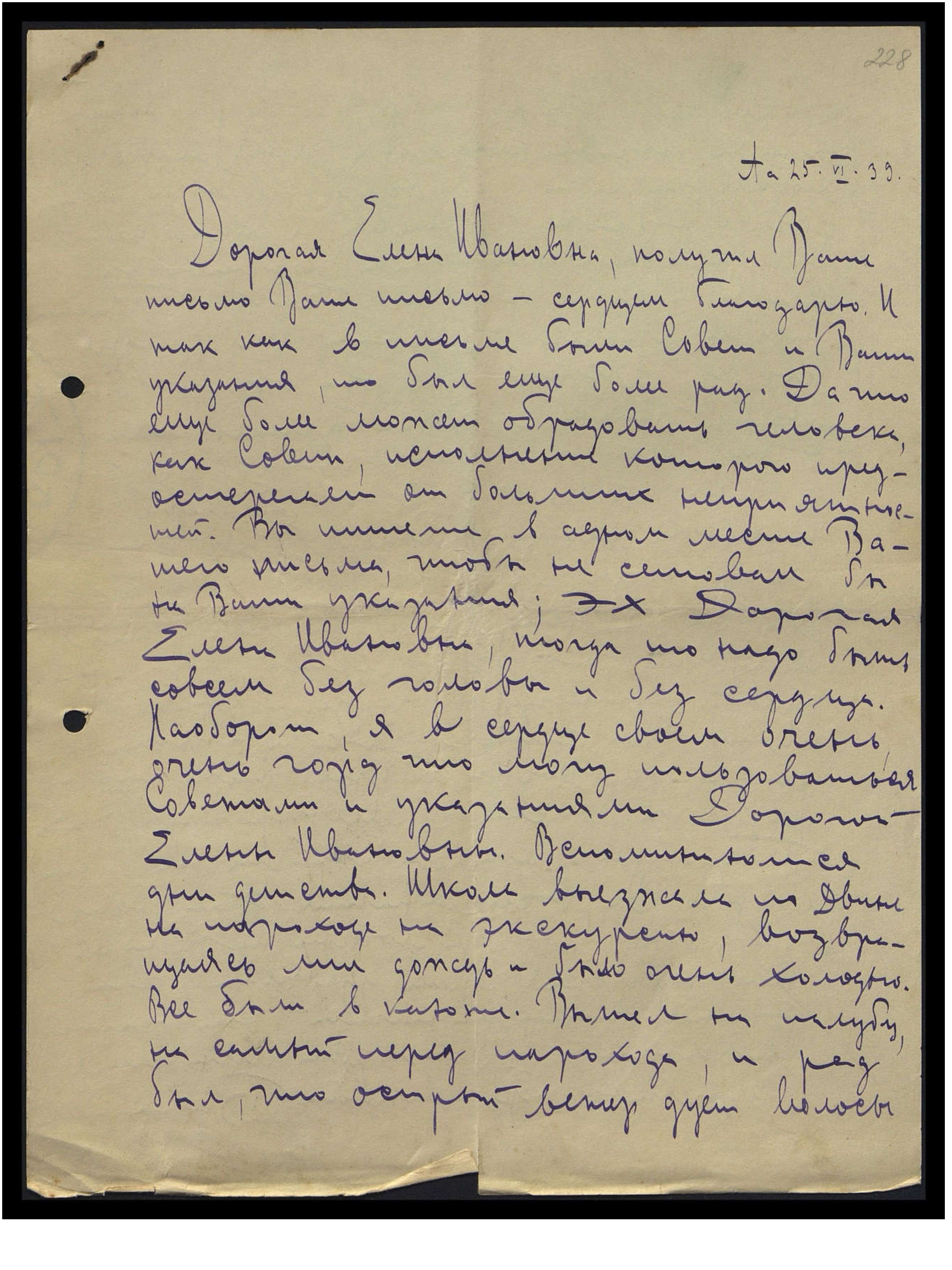Дорогая Елена Ивановна, получил Ваше письмо. Ваше письмо сердцем благодарю. И так как в письме были Совет и Ваши указания, то был ещё более рад. Да, что ещё более может обрадовать человека, как совет, исполнение которого предостерегает от больших неприятностей. Вы пишете в одном месте Вашего письма, чтобы не сетовал бы на Ваши указания. Эх, Дорогая Елена Ивановна, тогда-то надо быть совсем без головы и без сердца. Наоборот, я в сердце своём очень, очень горд, что могу пользоваться Советами и указаниями Дорогой Елены Ивановны. Вспоминаются дни детства. Школа выезжала по Двине на пароходе на экскурсию, возвращаясь, лил дождь и было очень холодно. Все были в каюте. Вышел на палубу, на самый перед парохода и рад был, что острый ветер дует волосы