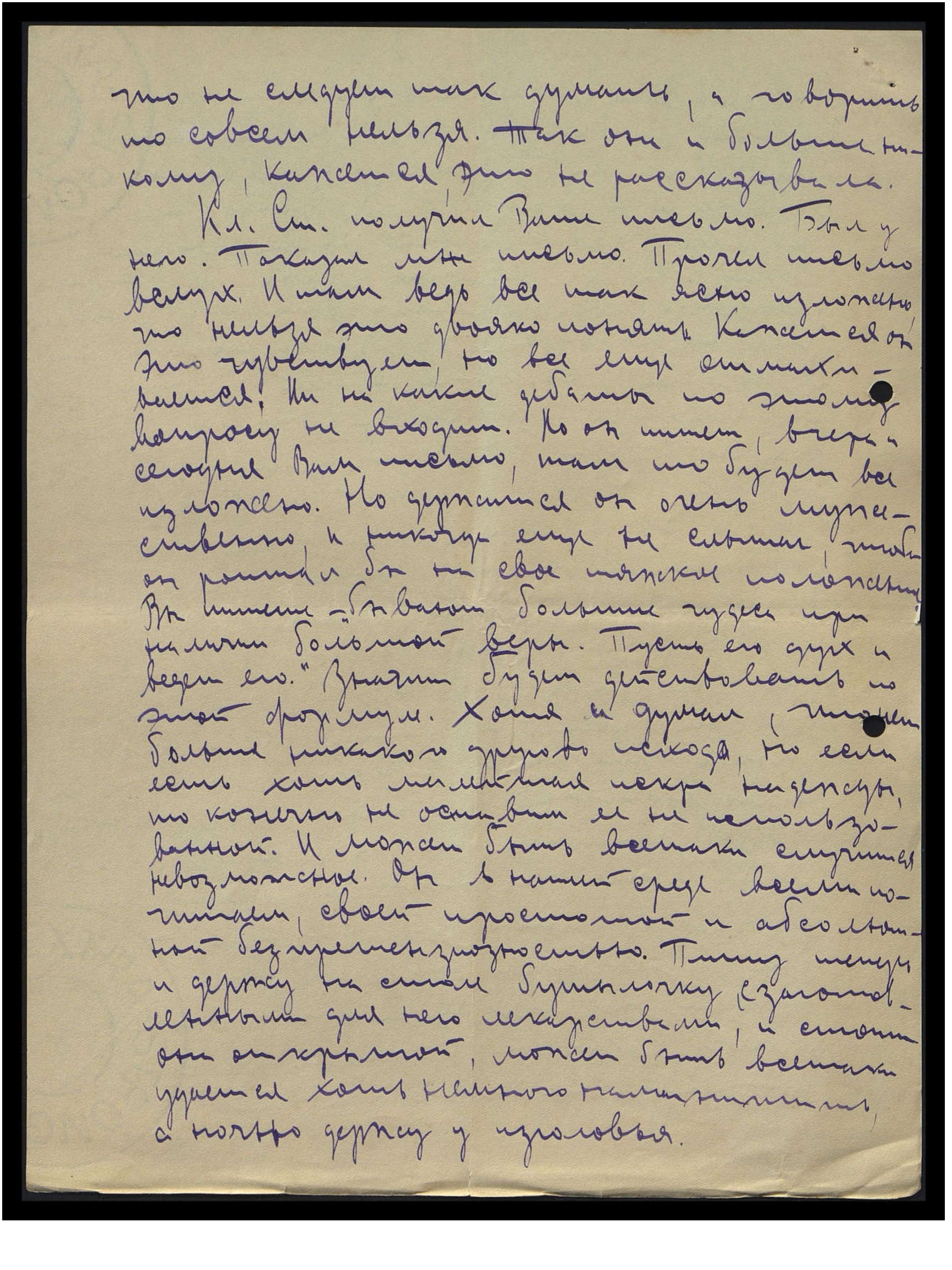 Кл[ементий] Ст[аниславович] получил Ваше письмо. Был у него. Показал мне письмо. Прочёл письмо вслух. И там ведь всё так ясно изложено, что нельзя это двояко понять. Кажется, он это чувствует, но всё ещё отмахивается. Ни на какие дебаты по этому вопросу не выходит. Но он пишет вчера, сегодня Вам письмо, там-то будет всё изложено. Но держится он очень мужественно, и никогда ещё не слышал, чтобы он роптал бы на своё тяжкое положение. Вы пишете: "бывают большие чудеса при наличии большой веры. Пусть его дух и ведёт его". Значит, будем действовать по этой формуле. Хотя и думал, что нет больше никакого другого исхода, но если есть хоть малейшая искра надежды, то, конечно, не оставим её не использованной. И может быть, всё-таки случится невозможное. Он в нашей среде всеми почитаем, своей простотой и абсолютной беспретензиозностью. Пишу теперь и держу на столе бутылочку, с заготовленными для него лекарствами, и стоит она открытой, может быть, всё-таки удастся хоть немного намагнитить, с ночью держу у изголовья.