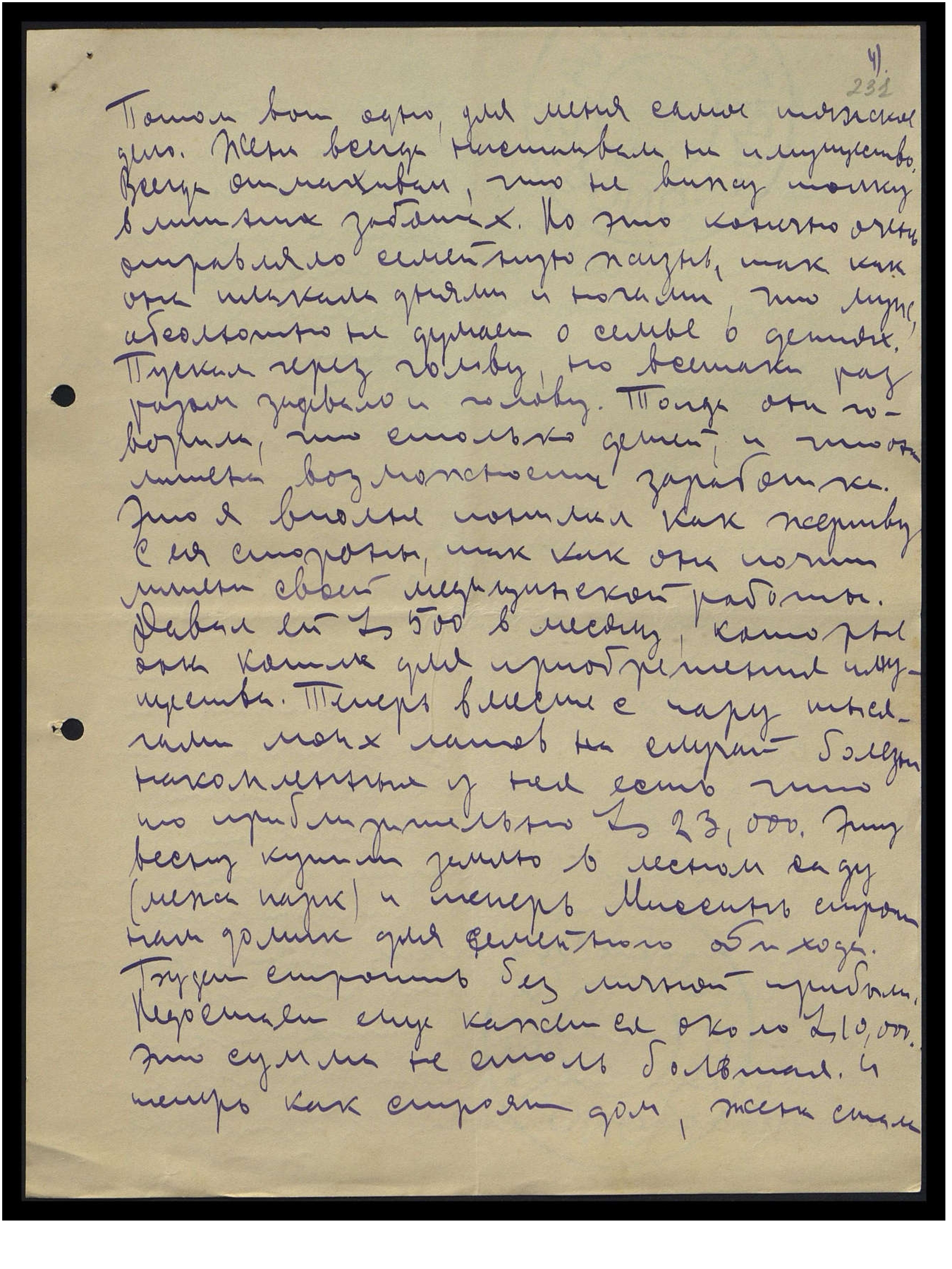 Потом вот, одно для меня самое тяжёлое дело. Жена всегда настаивала на имущество. Всегда отмахивал, что не вижу толку в лишних заботах. Но это, конечно, очень отравляло семейную жизнь, так как она плакала днями и ночами, что муж абсолютно не думает о семье, о детях. Пускал через голову, но всё-таки раз разом задевало и голову. Тогда она говорила, что столько детей и что она лишена возможности заработка. Это я вполне понимал, как жертву с ея стороны, так как она почти лишена своей медицинской работы. Давал ей Ls 500 в месяц, которые она копила для приобретения имущества. Теперь вместе с пару тысячами моих латов, на случай болезни накопленных, у нея есть что-то приблизительно Ls 23,000. Эту весну купили землю в лесном саду (межа парк), и теперь Миссинь строит нам домик для семейного обихода. Будет строить без личной прибыли. Недостаёт ещё, кажется, около Ls 10,000. Это сумма не столь большая. И теперь, как строят дом, жена стала