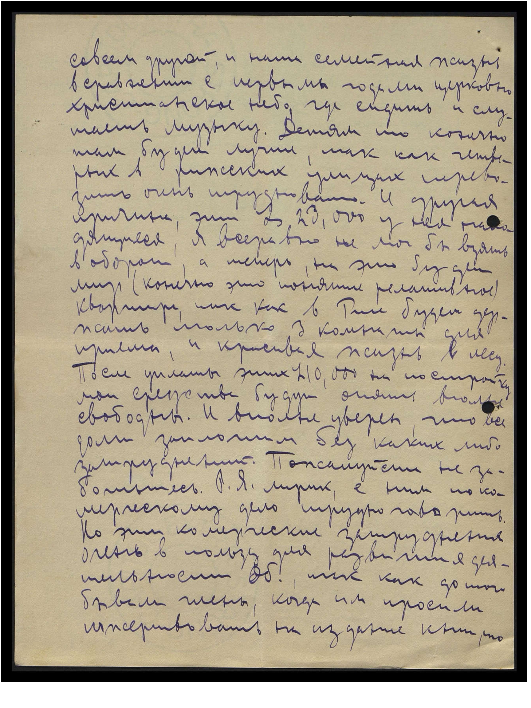 совсем другой, и наша семейная жизнь в сравнении с первыми годами — церковно-христианское небо, где сидишь и слушаешь музыку. Детям-то, конечно, там будет лучше, так как четверых в рижских улицах перевозить очень трудновато. И другая причина, эти Ls 23,000 у нея находящиеся, я всё равно не мог бы взять в оборот, а теперь, на это будет мир (конечно, это понятие релятивное), квартира, так как в Риге будем держать только 3 комнаты для приёма, и красивая жизнь в лесу. После уплаты этих Ls 10,000 на постройку мои средства будут опять вполне свободны. И вполне уверен, что все долги заплатим без каких-либо затруднений. Пожалуйста, не заботьтесь. Р[ихард] Я[ковлевич] — лирик, с ним по коммерческому дело трудно говорить. Но эти коммерческие затруднения очень в пользу для развития деятельности Об[щества], так как до того бывали члены, когда их просили пожертвовать на издание книги, то