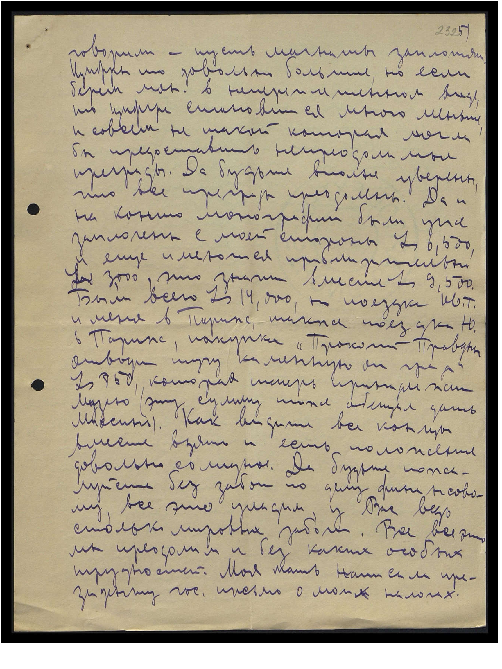 говорили — пусть магнаты заплатят. Цифры-то довольно большие, но если берём мон[ографию] в непереплетённом виде, то цифра становится много меньше и совсем не такой, которая могла бы предоставить непреодолимые преграды. Да, будьте вполне уверены, что все преграды преодолены. Да, и на конто монографии были уже заплачены с моей стороны Ls 6 500, и ещё имеются приблизительно Ls 3 000, это значит вместе Ls 9 500. Были всего Ls 14,000, но поездка Ив[ана] Г[еоргиевича] и меня в Париж, также поездка Ю. в Париж, покупка "Прокопий Правдин отводит тучу каменную от града" — Ls 750, которая теперь принадлежит Музею (эту сумму тоже обещал дать Миссинь). Как видите, все концы вместе взять, и есть положение довольно солидное. Да, будьте, пожалуйста, без забот по делу финансовому, всё это уладим, у Вас ведь столько мировых забот. Всё, всё это мы преодолеем и без каких особых трудностей. Моя мать написала президенту гос[ударства] письмо о моих налогах.