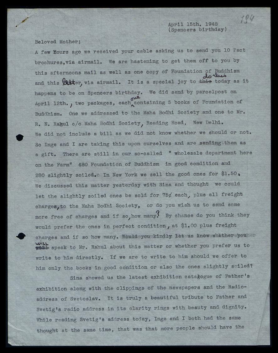 A few hours ago, we received your cable asking us to send you ten Pact brochures via airmail. We are hastening to get them off to you by this afternoon’s mail as well as one copy of Foundations of Buddhism and this letter via airmail. It is a special joy to do this today as it happens to be on Spencer’s birthday. We did send by parcel post on April 12, two packages, each one containing five books of Foundations of Buddhism. One we addressed to the Maha Bodhi Society and one to Mr. R. N. Ragul, c/o Maha Bodhi Society, Reading Road, New Delhi.