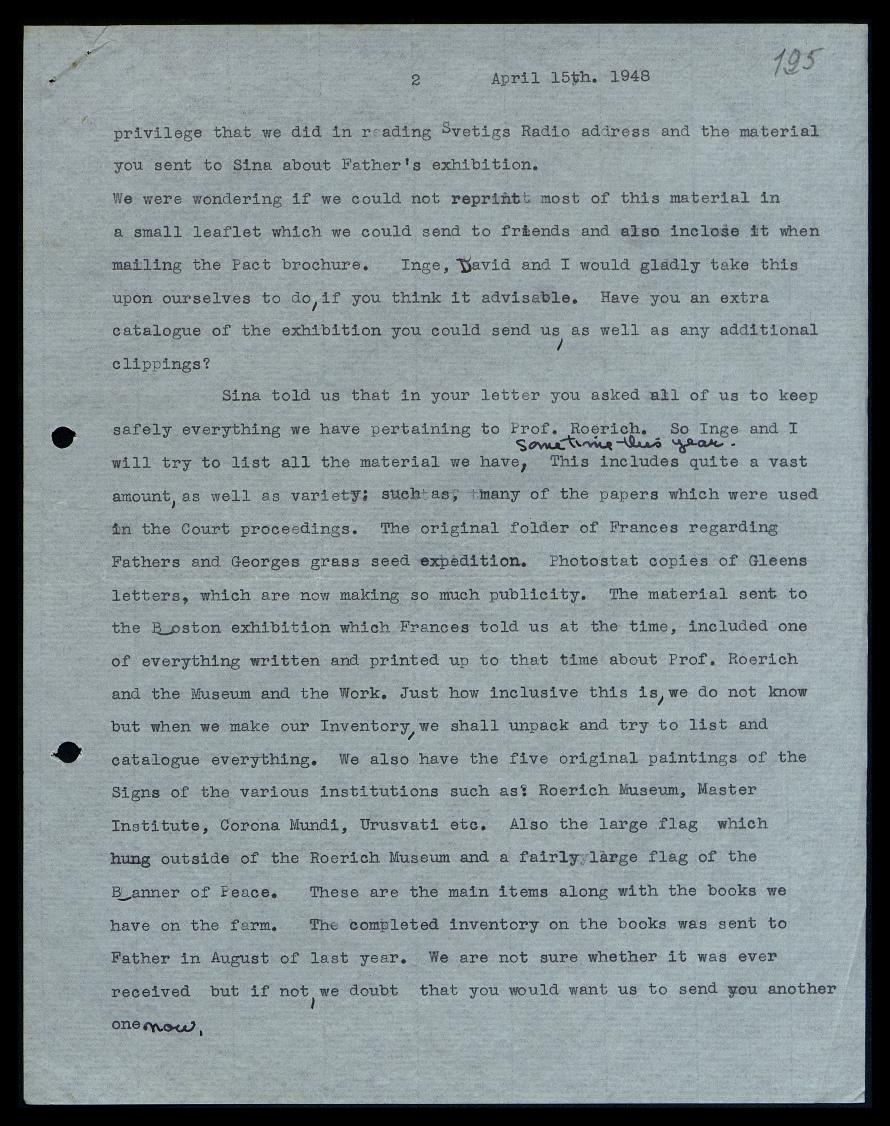 Зина рассказала нам, что в своём письме Вы просили всех нас бережно хранить всё, что у нас есть, относящееся к проф[ессору] Рериху. Так что мы с Инге попытаемся составить список всех имеющихся материалов в течение этого года. Список будет довольно обширным и разнообразным, в него войдут, например, многие документы, которые использовались в судебных разбирательствах. Оригинальная папка Фрэнсис [Грант], касающаяся экспедиции Отца и Юрия по выращиванию семян трав. Фотокопии писем Глина, которые сейчас получили такую широкую огласку. Материал, присланный на Бостонскую выставку, о котором Фрэнсис рассказала нам тогда, включающий в себя всё, что было написано и напечатано до того времени о профессоре Рерихе, музее и его работе. Насколько этот материал всеобъемлющий, мы не знаем, но когда мы его распакуем и проведём инвентаризацию, то попытаемся всё перечислить и каталогизировать. У нас также есть пять оригинальных рисунков вывесок различных учреждений, таких как: Музей Рериха, Мастер-институт, Корона Мунди, Урусвати и др. Также есть большой флаг, который висел перед музеем Рериха, и довольно большое полотнище Знамени Мира. Это основные вещи, а также книги, которые есть у нас на ферме. Законченный список книг был отправлен Отцу в августе прошлого года. Мы не уверены, получил ли он его, но если нет, мы сомневаемся, что Вы захотите, чтобы мы отправили Вам ещё один сейчас.]