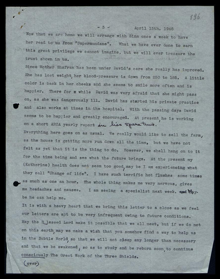 It is with a heavy heart that we bring this letter to a close as we feel our letters are apt to be very infrequent owing to future conditions. May the Blessed Lord make it possible that we all meet, but if we do not on this Earth, may we make a wish that you somehow find a way to help us in the Subtle World, so that we will not sleep any longer than necessary and that we be awakened, so as to study and be reborn soon and continue consciously the Great Work of the “Three Shields.”