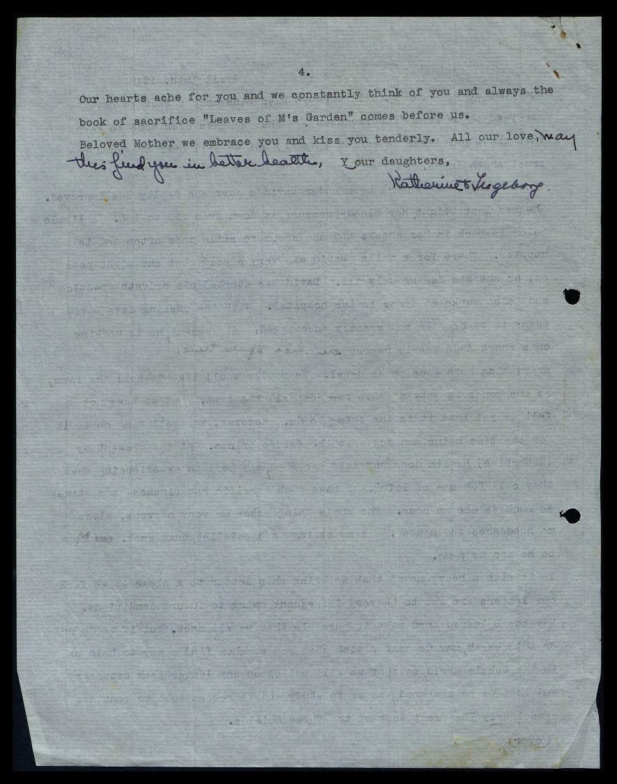 Dear Mother, Katherine has asked me to take over and type this letter as she has a touch of the grippe and aches all over, but we do want this letter to reach you as soon as possible. You know what Katherine writes I feel too, and we are much in thoughts with you and speak about you and keep you near to our hearts. How we hope that your pains will subside entirely and that you may continue your journey with new strength.