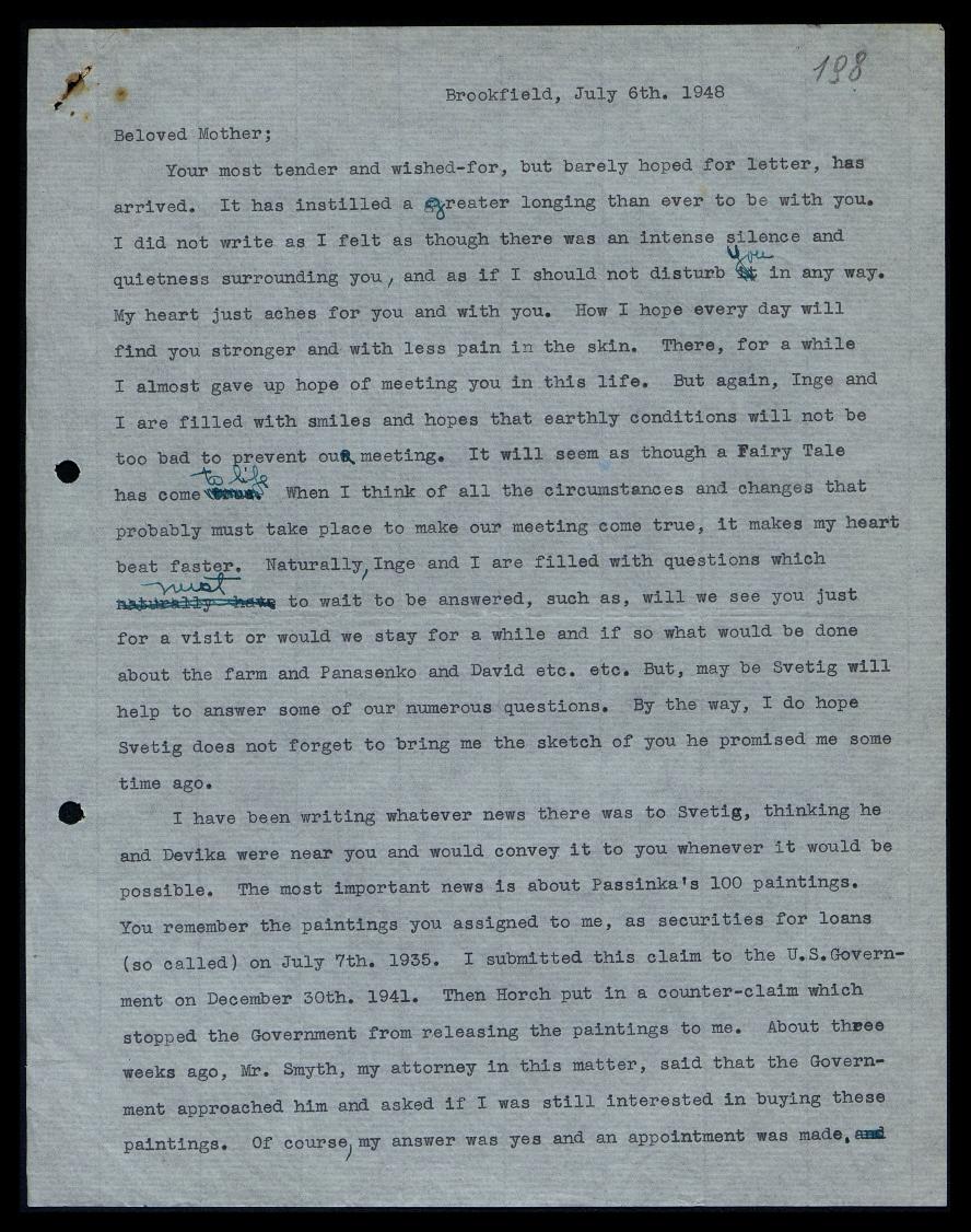 I have been writing whatever news there was to Svetic, thinking he and Devika were near you and would convey it to you whenever it would be possible. The most important news is about Passinka’s [N.R.’s] one hundred paintings. You remember the paintings you assigned to me as securities for loans (so-called) on July 7, 1935. I submitted this claim to the U.S. Government on December 30, 1941. Then Horch put in a counterclaim that stopped the government from releasing the paintings to me. About three weeks ago, Mr. [Nathan] Smyth, my attorney in this matter, said that the government approached him and asked if I was still interested in buying these paintings. Of course, my answer was yes, and an appointment was made, and