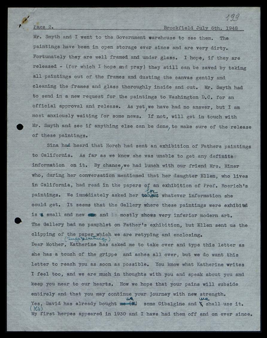 Я писала Светику обо всех новостях, которые произошли, надеясь, что он и Девика были рядом с Вами и смогут передать их Вам, когда это будет возможно. Самая важная новость о ста картинах Пасиньки [Н.К.Р.]. Вы помните картины, которые Вы передали мне в качестве [залога] ценных бумаг для получения займов (так называемых) 7 июля 1935 года. Я подала это требование правительству США 30 декабря 1941 года. Тогда Хорш подал встречный иск, чтобы не допустить передачу мне этих картин правительством. Около трёх недель назад мистер [Натан] Смит, мой адвокат в этом деле, сообщил, что правительство обратилось к нему с запросом, по-прежнему ли я заинтересована в покупке этих картин. Конечно, мой ответ был утвердительным, была назначена встреча, и]