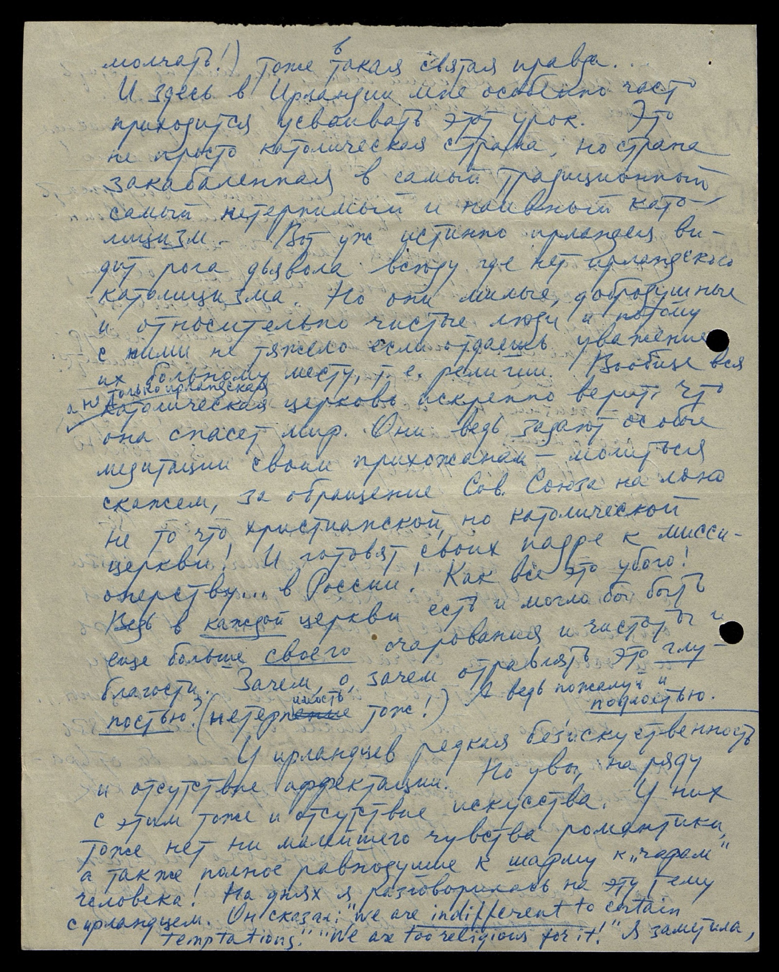 молчать!) тоже такая святая правда… И здесь в Ирландии мне особенно часто приходится усваивать этот урок. Это не просто католическая страна, но страна закабалённая в самый традиционный, самый нетерпимый и наивный католицизм. Вот уж, истинно, Ирландия видит рога дьявола всюду, где нет ирландского католицизма. Но они милые, добродушные и относительно чистые люди, и потому с ними не тяжело, если отдаёшь уважение их больному месту, то есть религии. Вообще вся, а не только ирландская католическая церковь искренно верит, что она спасёт мир. Они ведь задают особые медитации своим прихожанам — молиться, скажем, за обращение Сов[етского] Союза на лоно не то что христианской, но католической церкви! И готовят своих падре к миссионерству… в России! Как всё это убого! Ведь в каждой церкви есть и могло бы быть ещё больше своего очарования и чистоты, и благости. Зачем, о, зачем отравлять это глупостью? (нетерпимость тож!) А ведь, пожалуй, и подлостью.