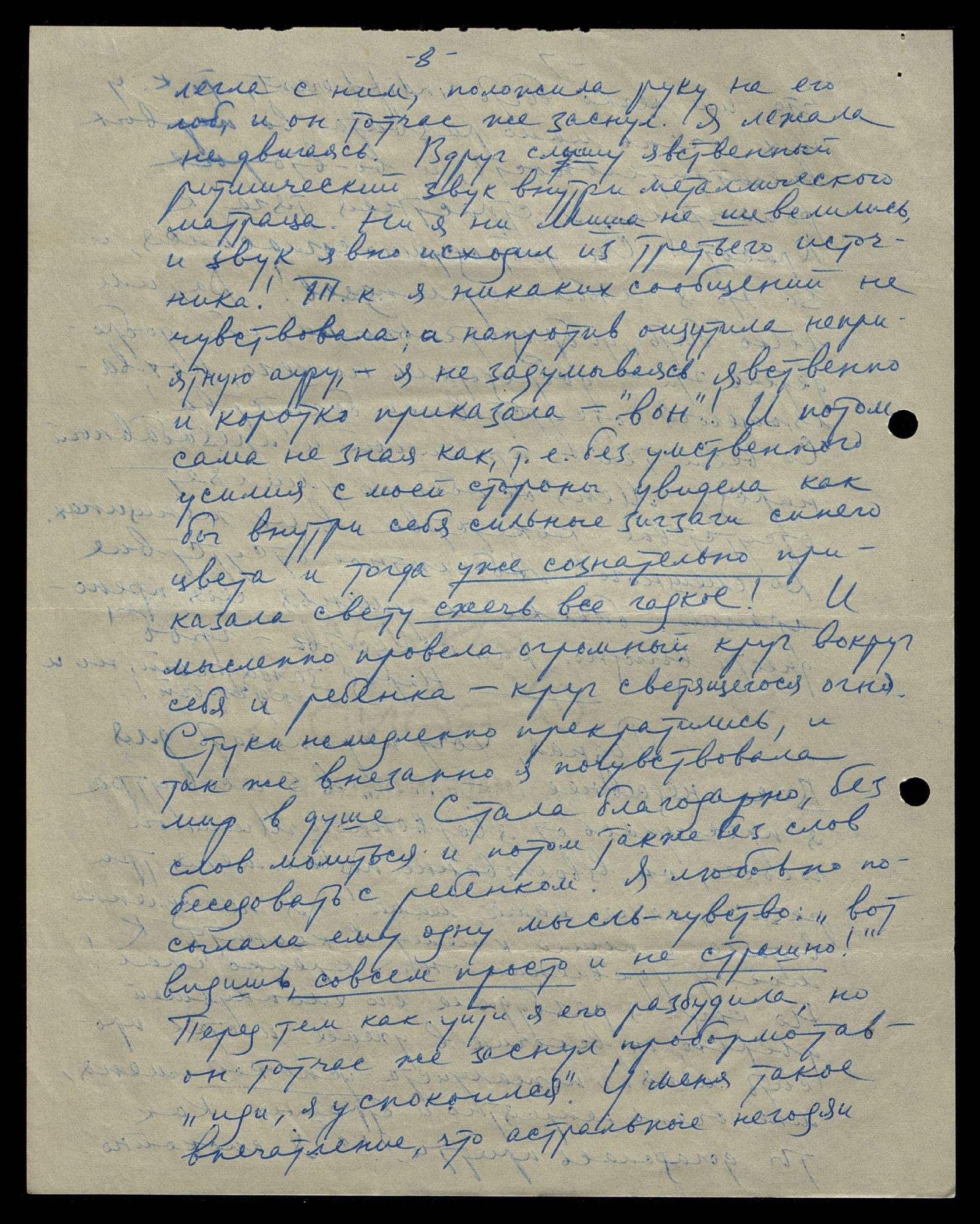 легла с ним, положила руку на его лоб, и он тотчас же заснул. Я лежала не двигаясь. Вдруг слышу явственный ритмический звук внутри металлического матраца. Ни я, ни Миша не шевелились, и звук явно исходил из третьего источника! Так как я никаких сообщений не чувствовала, а напротив ощутила неприятную ауру, я, не задумываясь, явственно и коротко приказала — «вон»! И потом сама, не зная как, то есть без умственного усилия с моей стороны, увидела как бы внутри себя сильные зигзаги синего цвета и тогда уже сознательно приказала свету сжечь всё гадкое! И мысленно провела огромный круг вокруг себя и ребёнка — круг светящегося огня. Стуки немедленно прекратились, и так же внезапно я почувствовала мир в душе. Стала благодарно, без слов молиться и потом также без слов беседовать с ребёнком. Я любовно посылала ему одну мысль-чувство: «Вот видишь, совсем просто и не страшно!» Перед тем как уйти, я его разбудила, но он тотчас же заснул, пробормотав: «Иди, я успокоился». У меня такое впечатление, что астральные негодяи